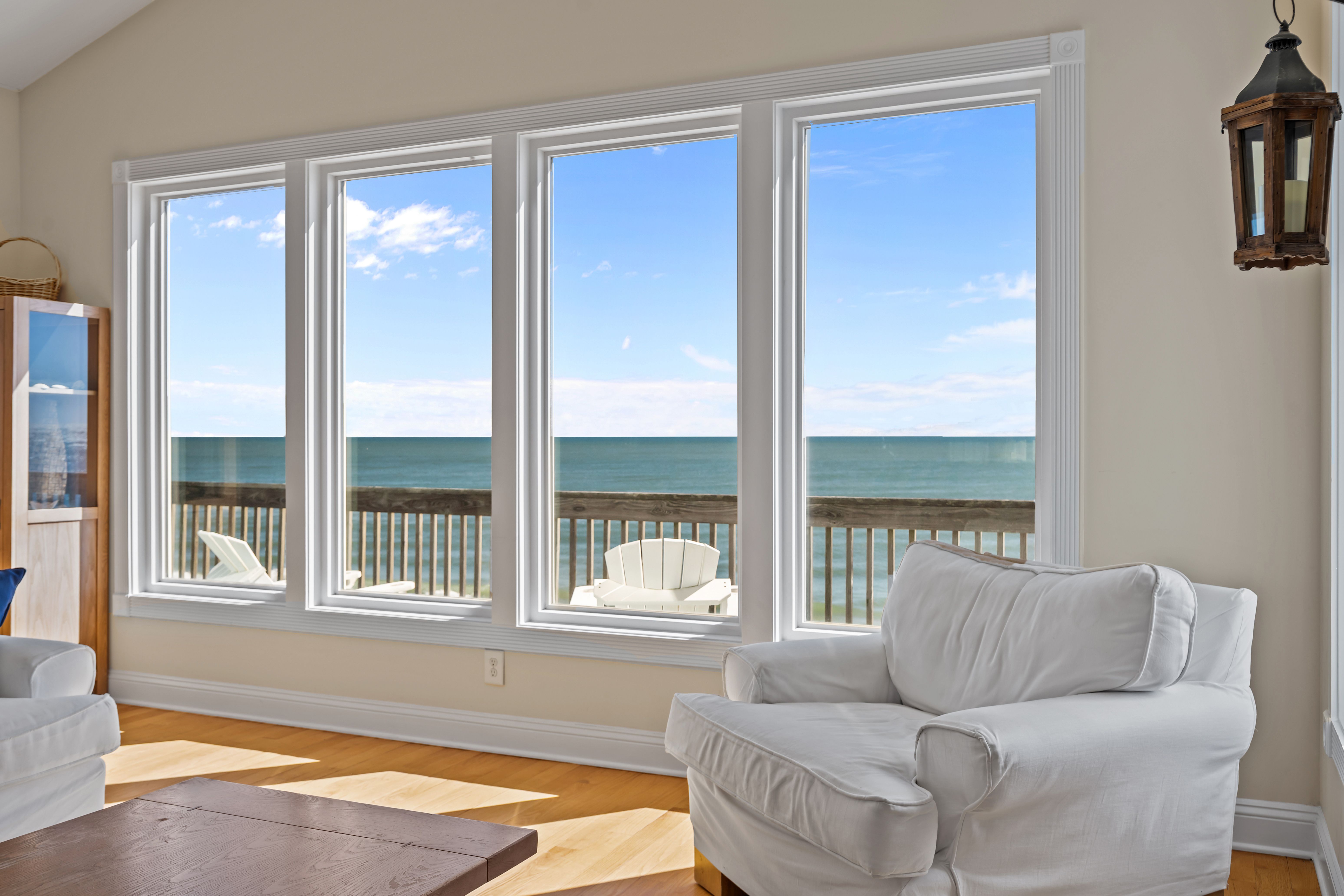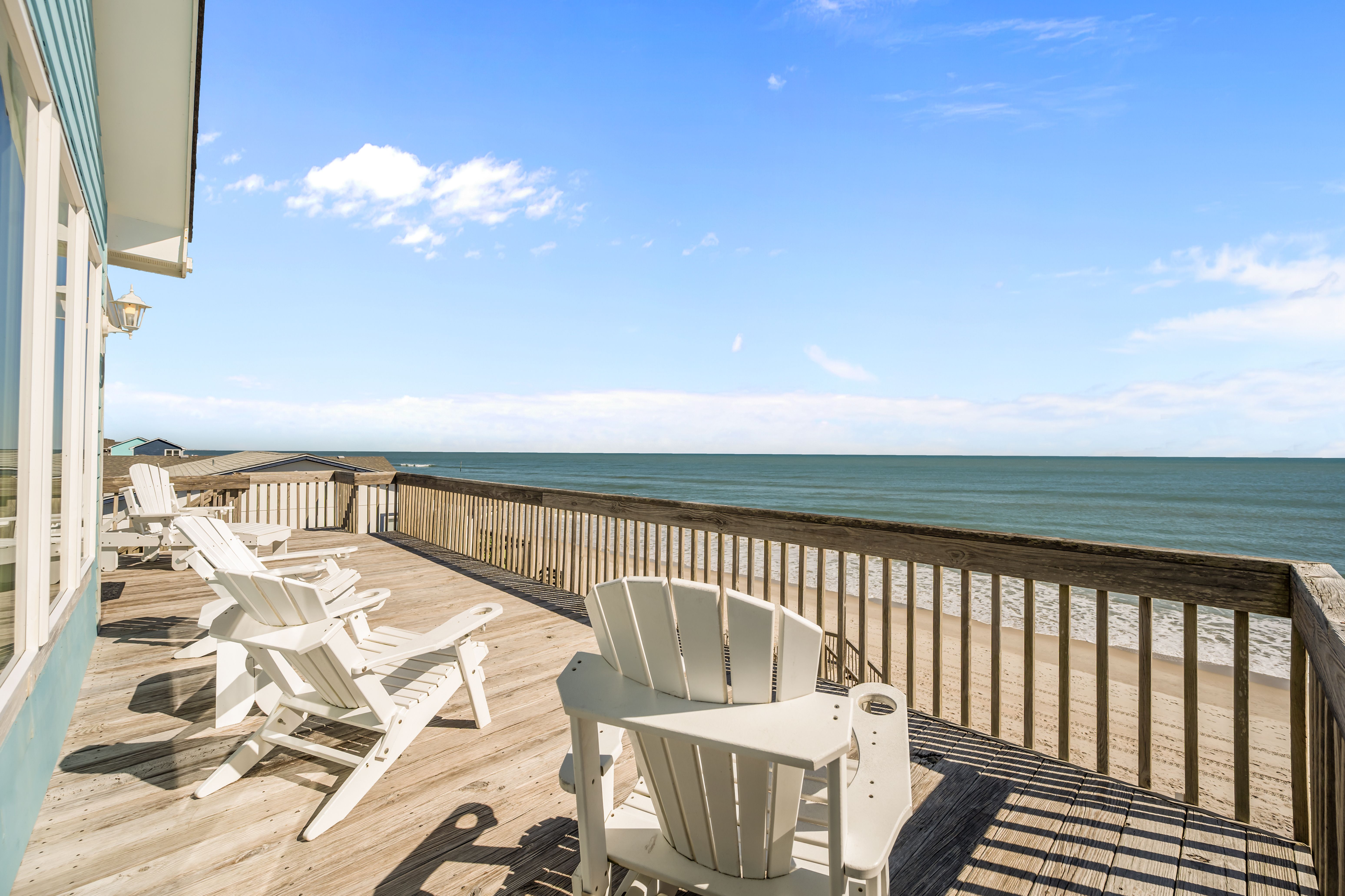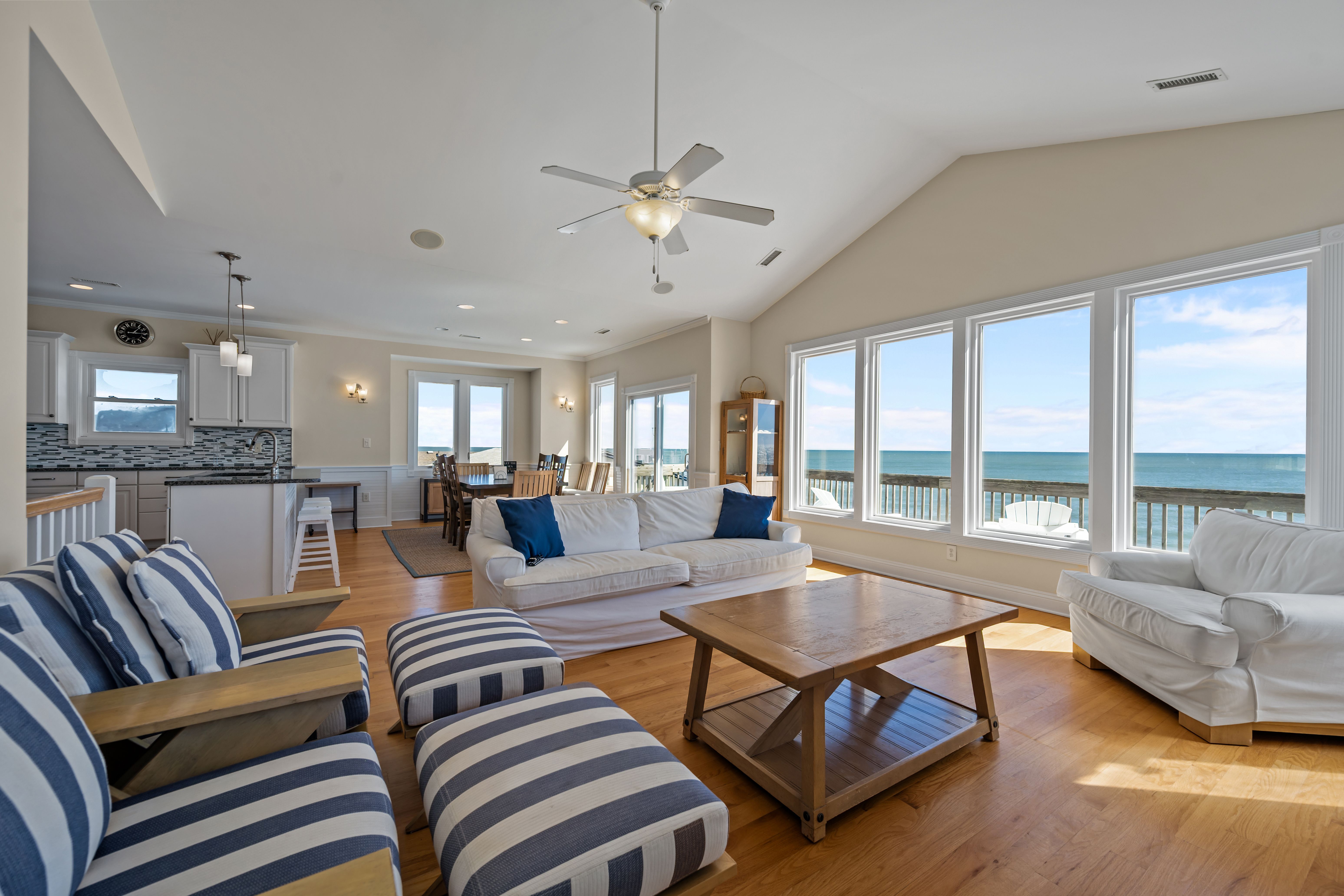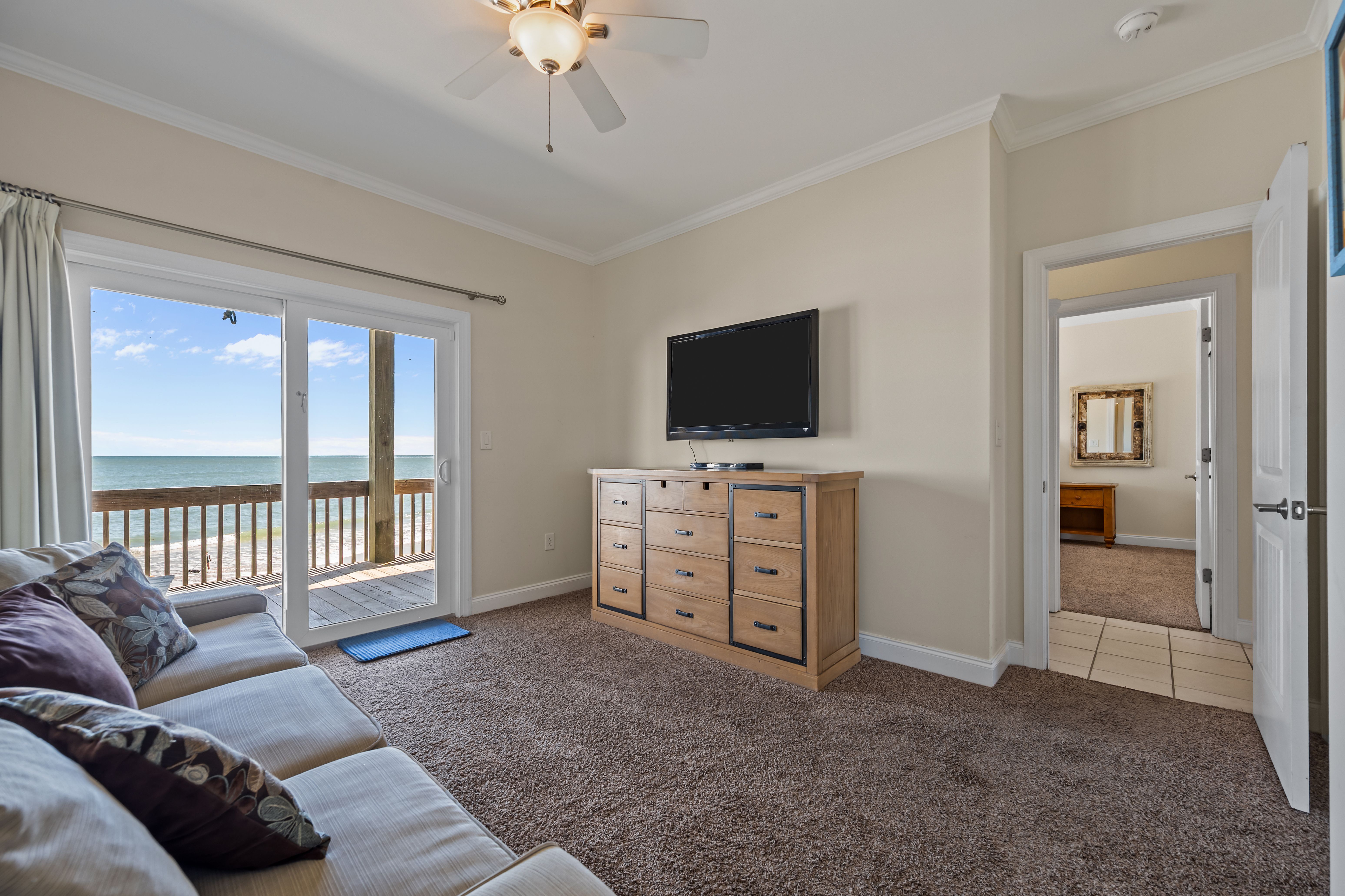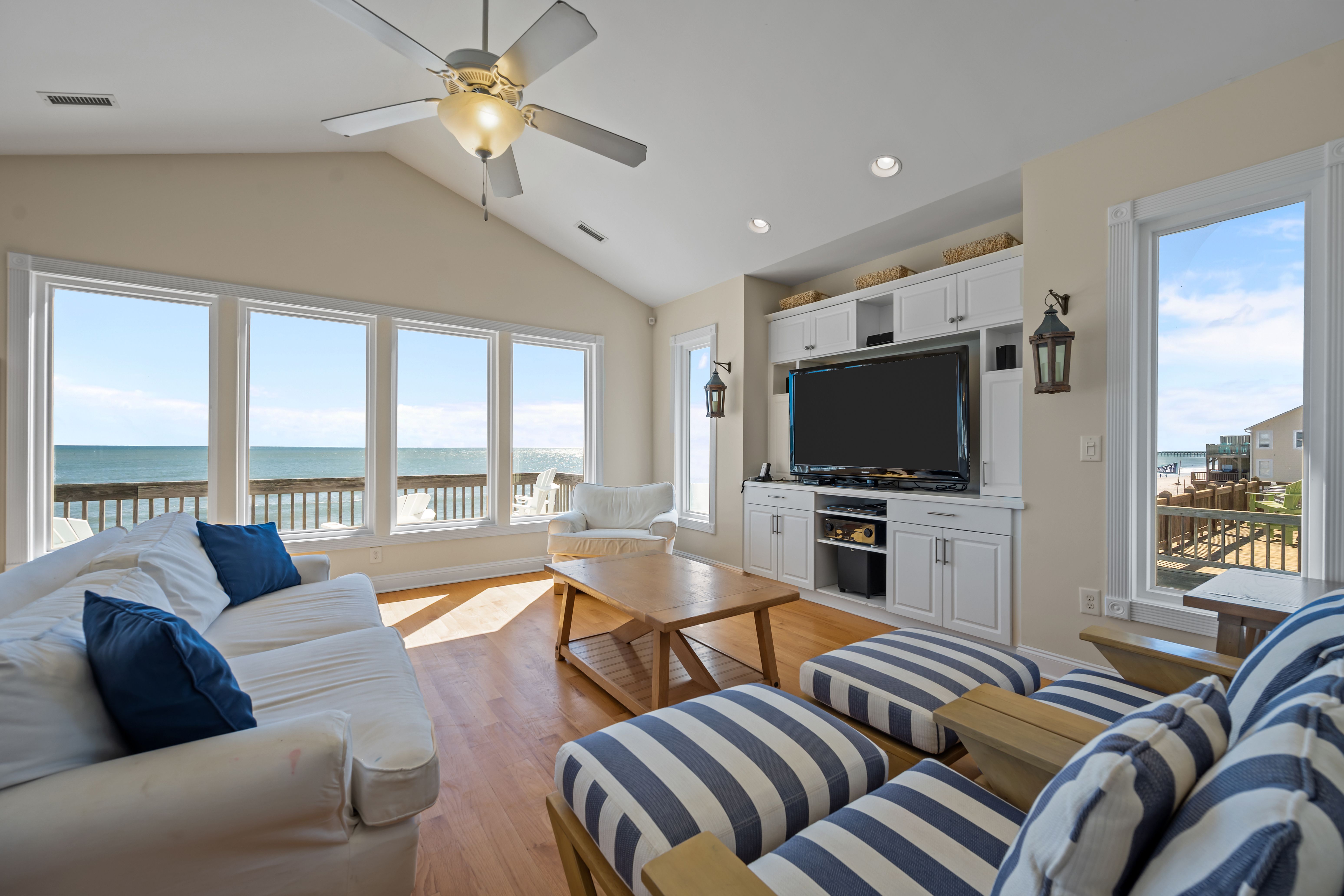 This 5-bedroom, 4-bathroom home comfortably accommodates up to 12 guests. The top floor is designed for gathering and entertaining, featuring a bright and airy great room with a fully equipped kitchen, spacious dining area, and cozy living room complete with built-in entertainment center. Floor-to-ceiling windows showcase sweeping beach views, and sliding doors lead to the oceanfront deck—perfect for morning coffee or evening cocktails as you take in the sights and sounds of the sea. This level also includes a bedroom with two sets of twin over twin bunk beds (sleeping 4) and a full bathroom.