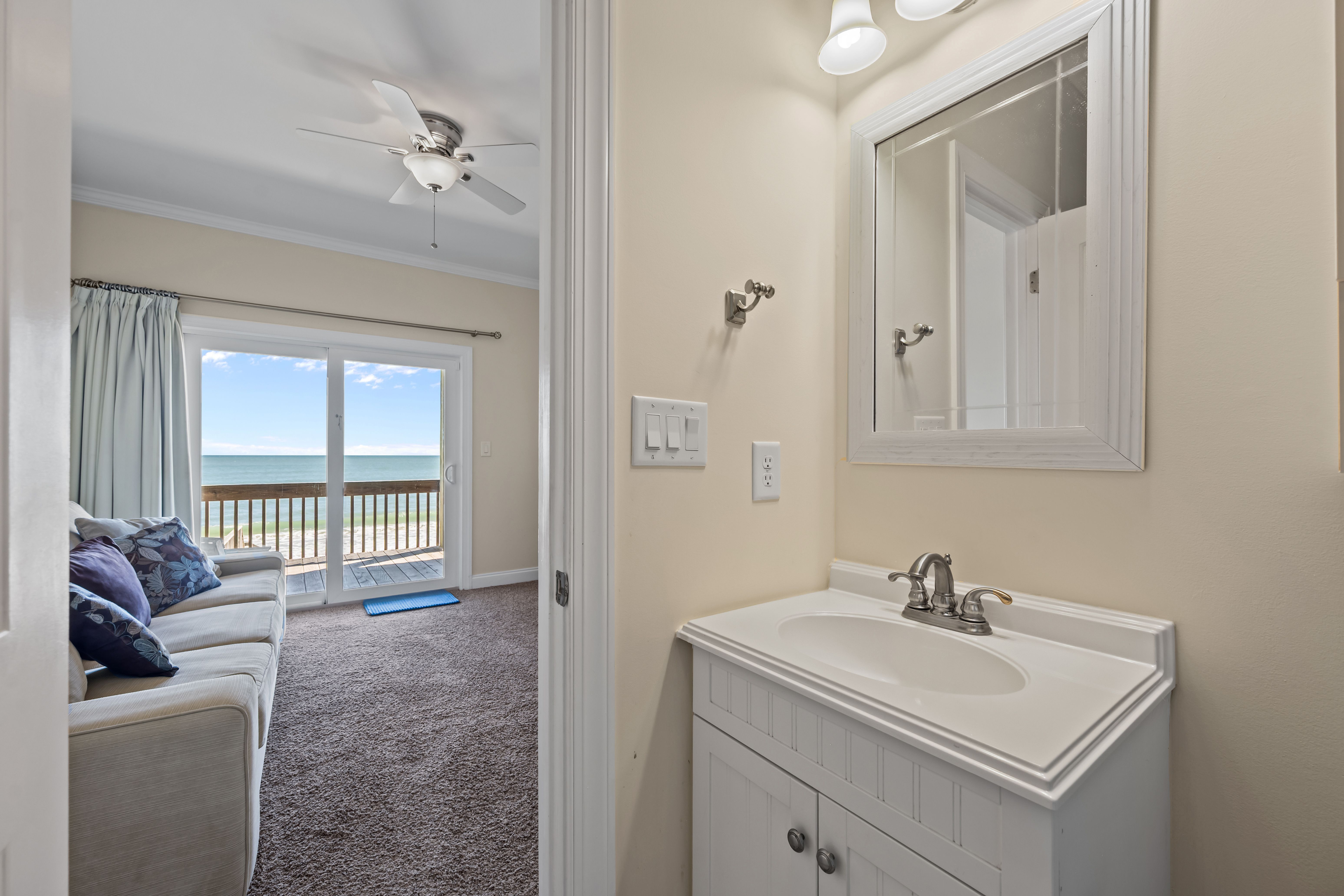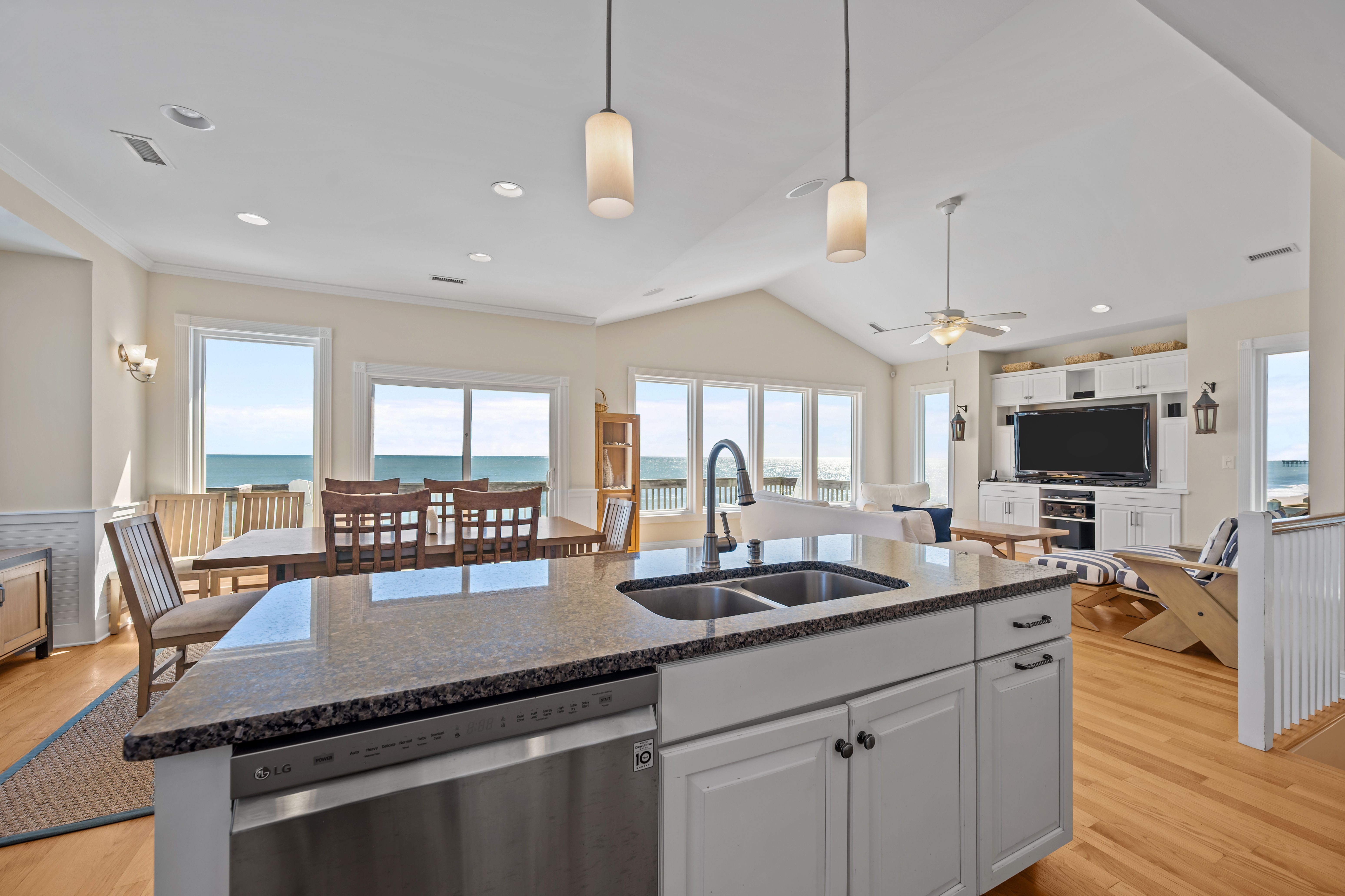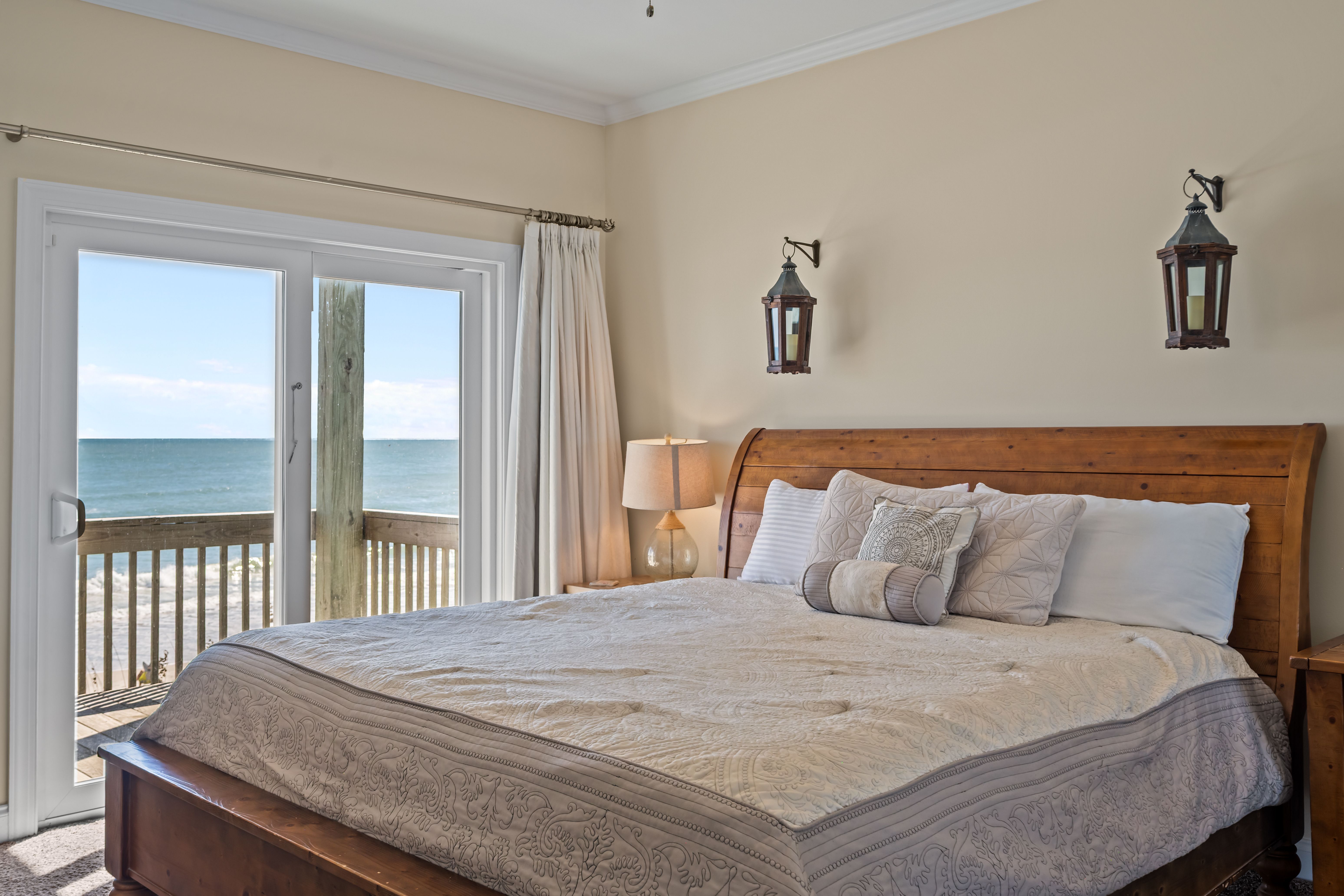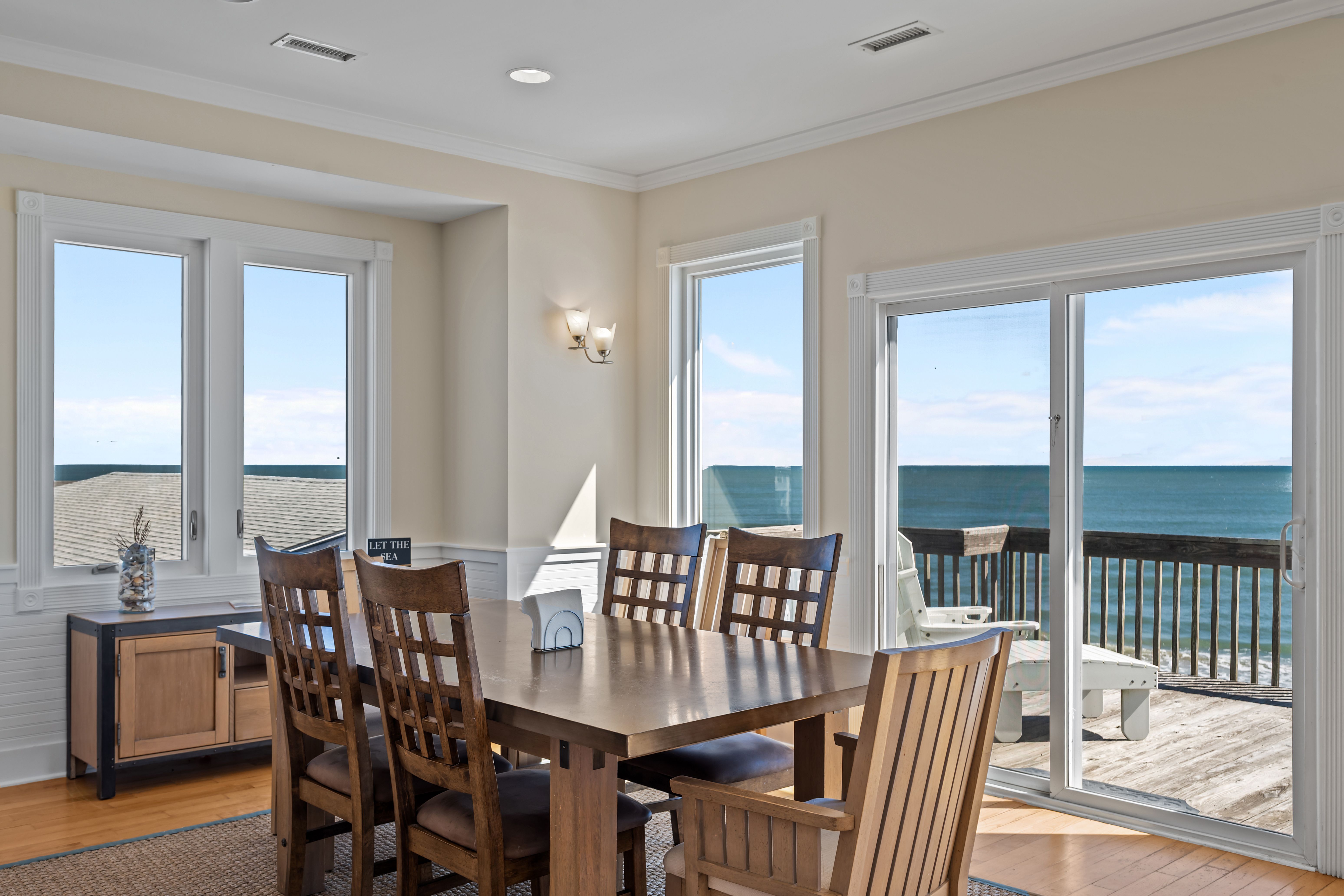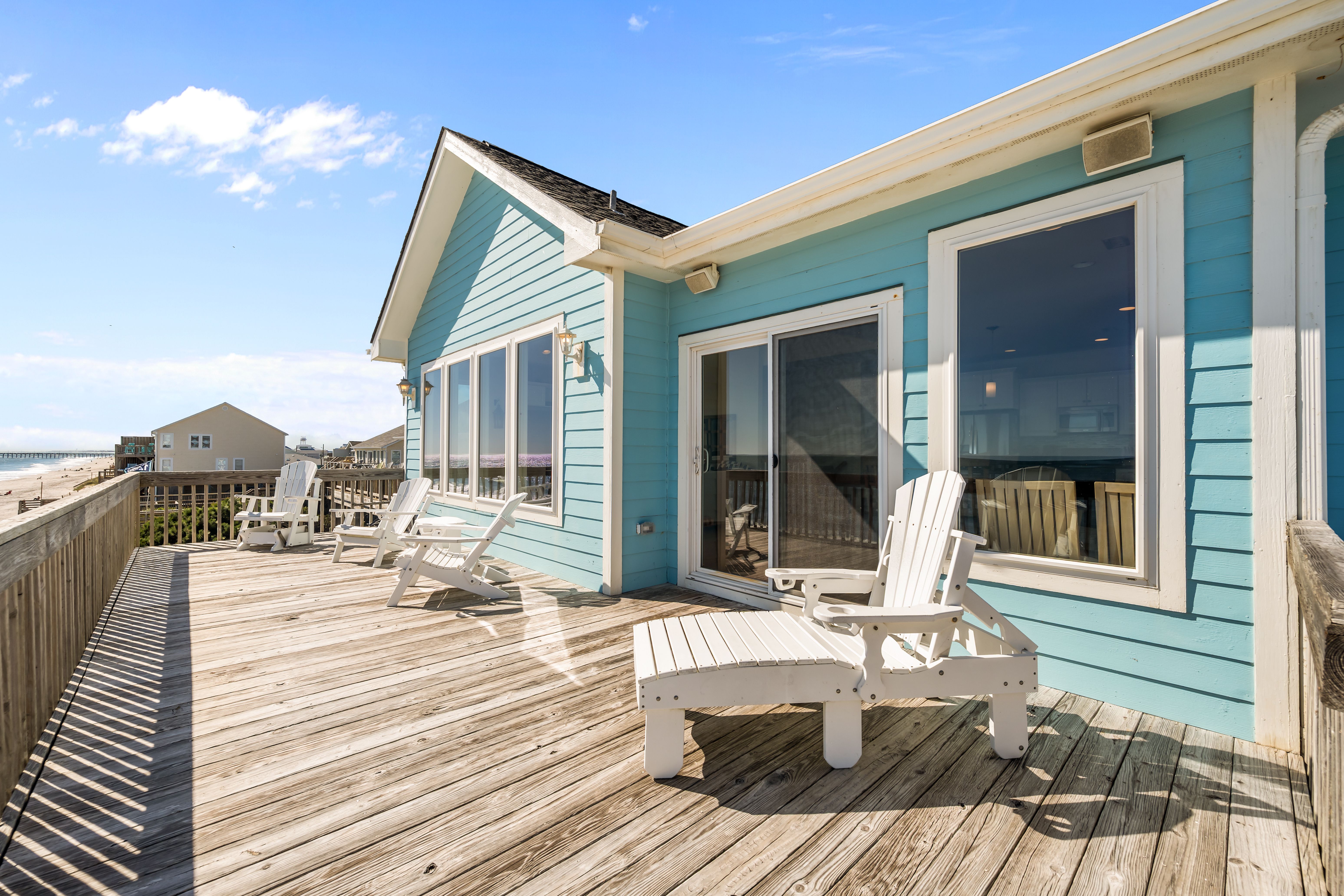 This 5-bedroom, 4-bathroom home comfortably accommodates up to 12 guests. The top floor is designed for gathering and entertaining, featuring a bright and airy great room with a fully equipped kitchen, spacious dining area, and cozy living room complete with built-in entertainment center. Floor-to-ceiling windows showcase sweeping beach views, and sliding doors lead to the oceanfront deck—perfect for morning coffee or evening cocktails as you take in the sights and sounds of the sea. This level also includes a bedroom with two sets of twin over twin bunk beds (sleeping 4) and a full bathroom.