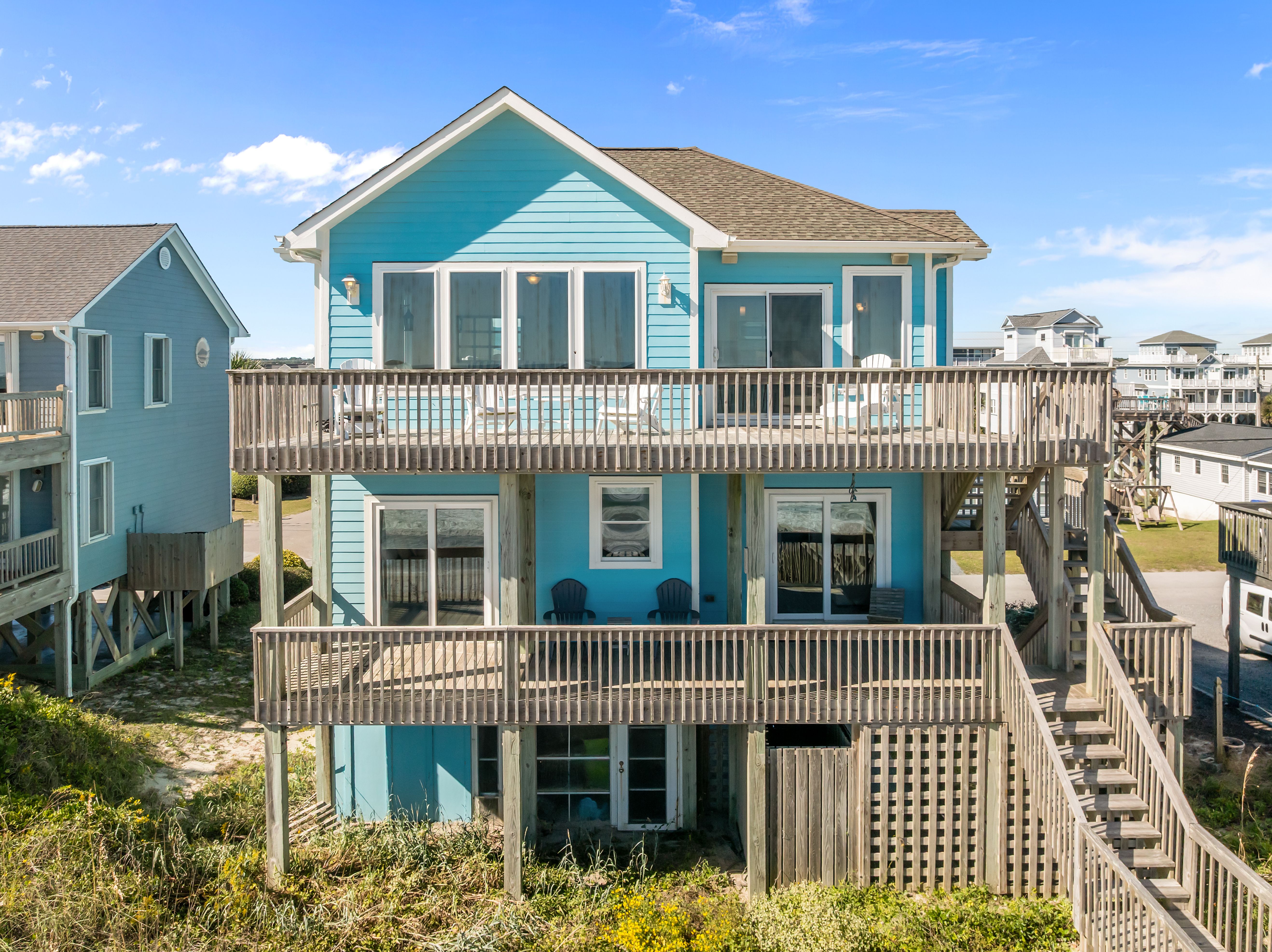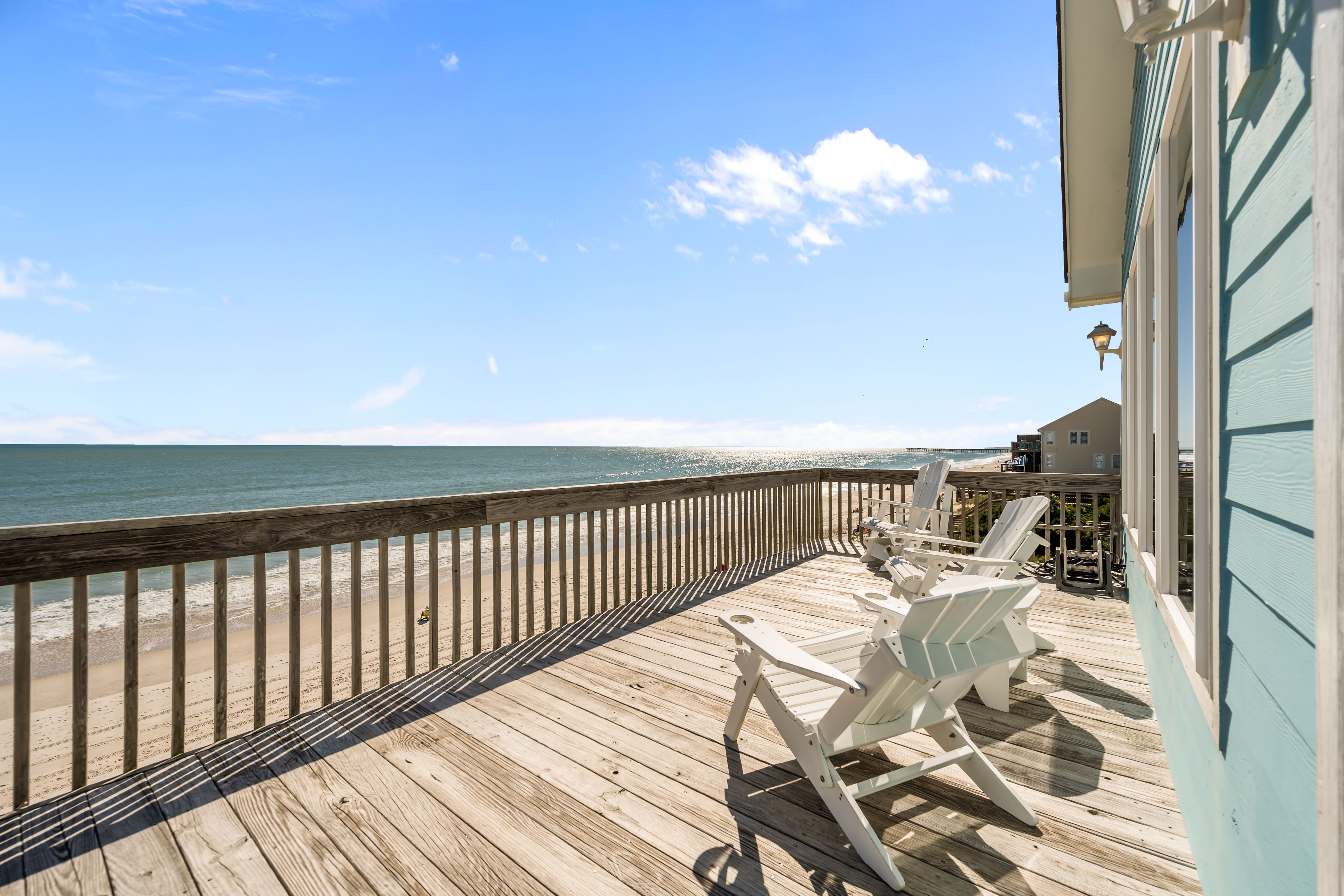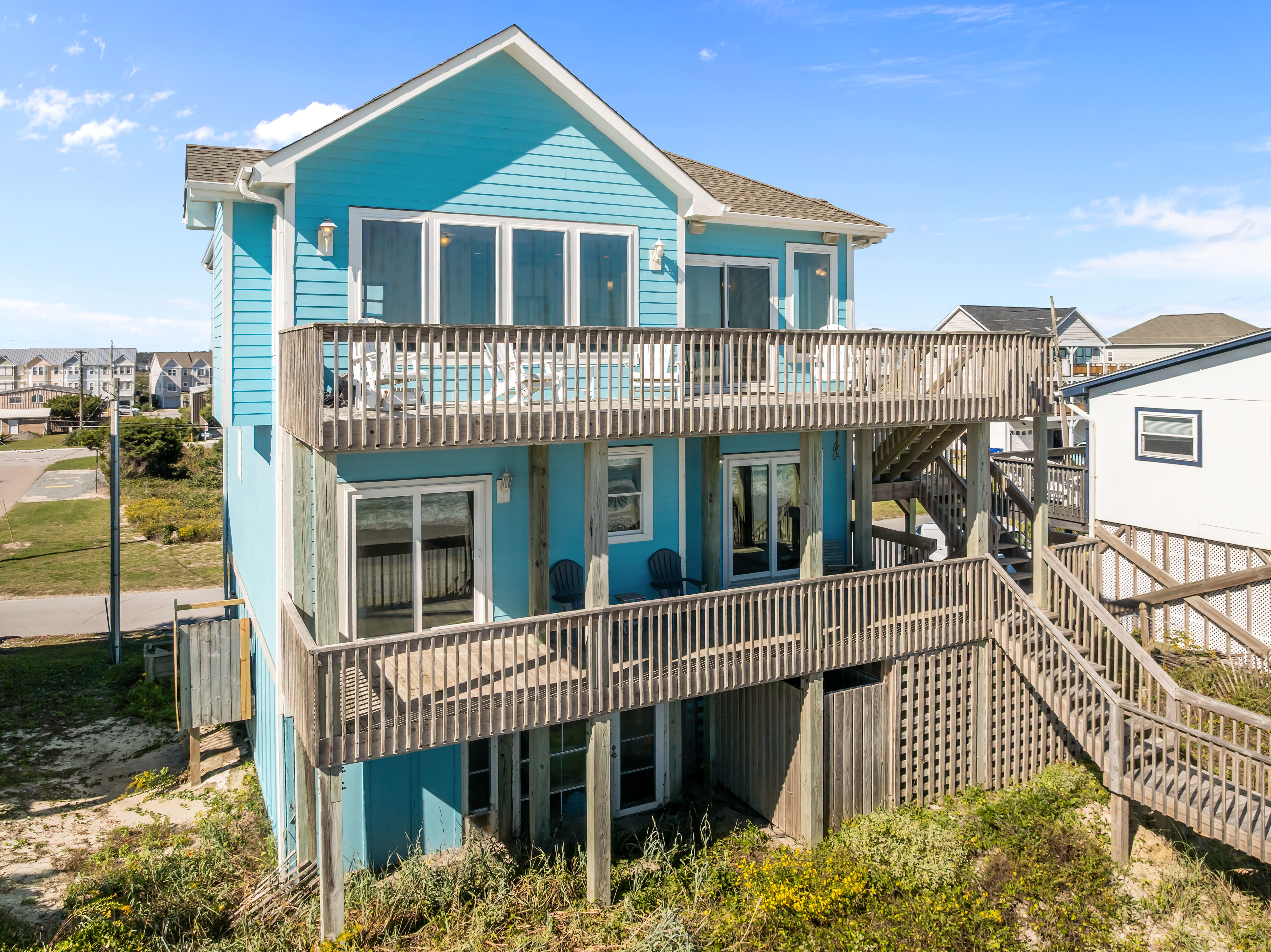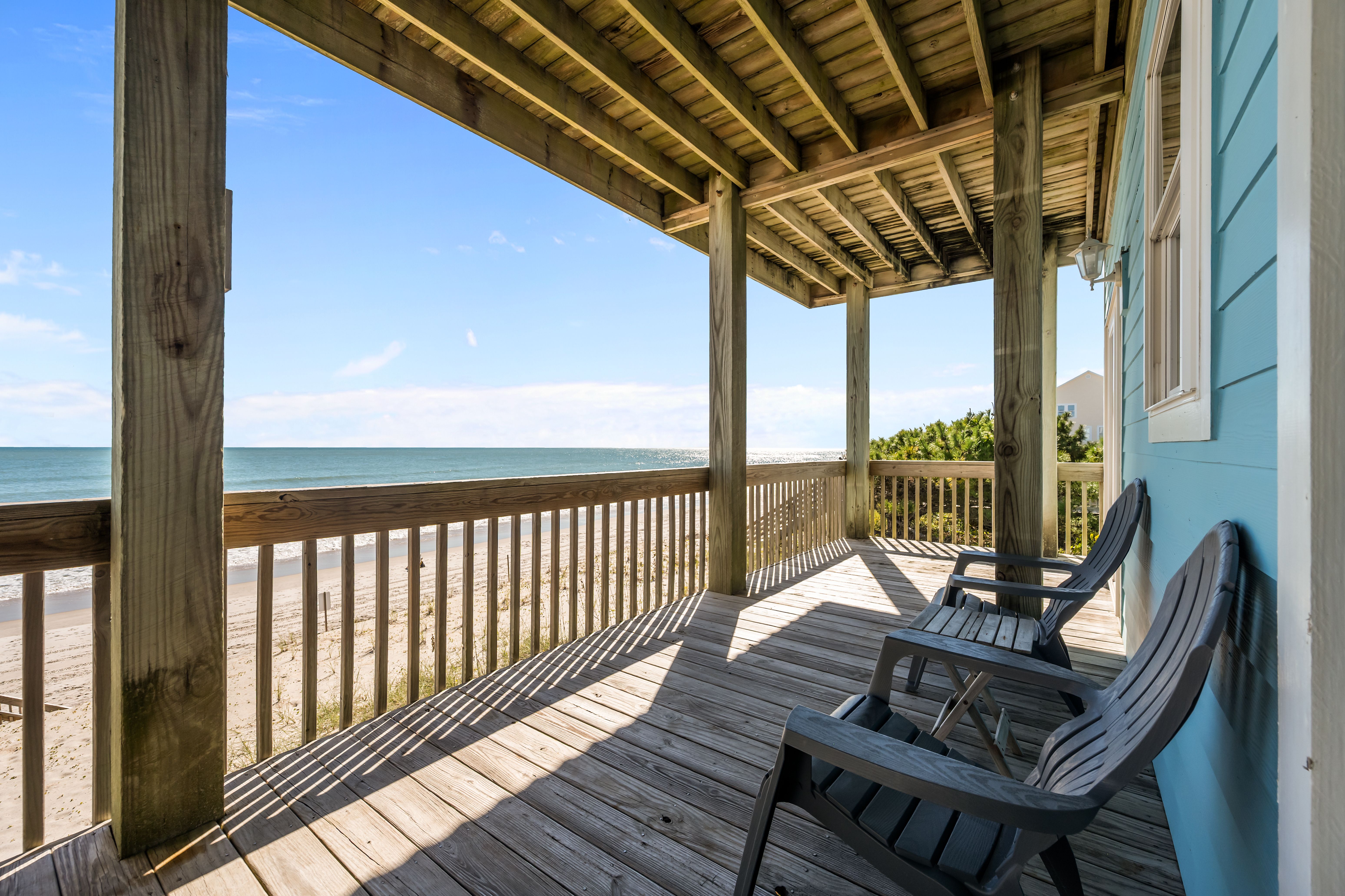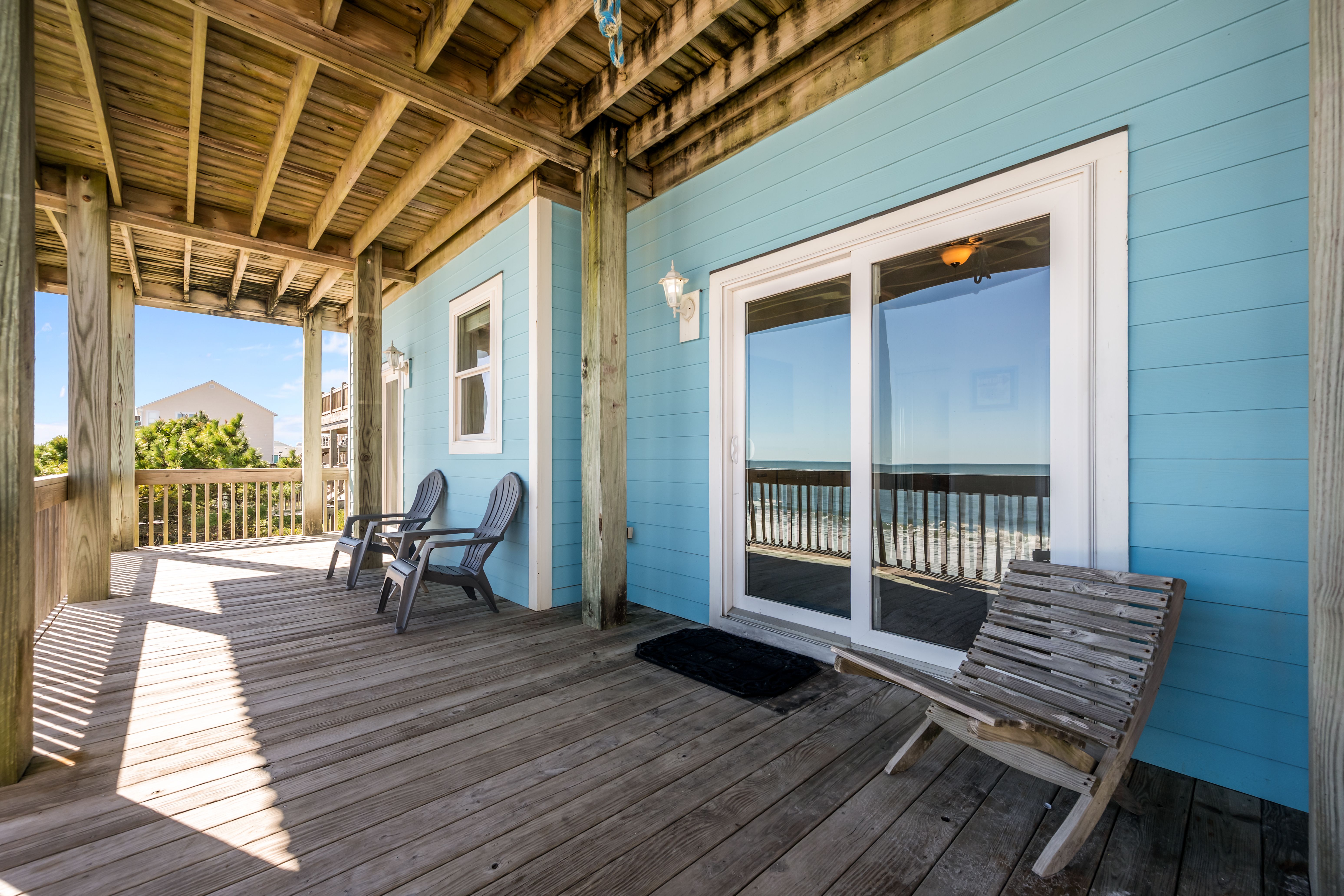 This 5-bedroom, 4-bathroom home comfortably accommodates up to 12 guests. The top floor is designed for gathering and entertaining, featuring a bright and airy great room with a fully equipped kitchen, spacious dining area, and cozy living room complete with built-in entertainment center. Floor-to-ceiling windows showcase sweeping beach views, and sliding doors lead to the oceanfront deck—perfect for morning coffee or evening cocktails as you take in the sights and sounds of the sea. This level also includes a bedroom with two sets of twin over twin bunk beds (sleeping 4) and a full bathroom.