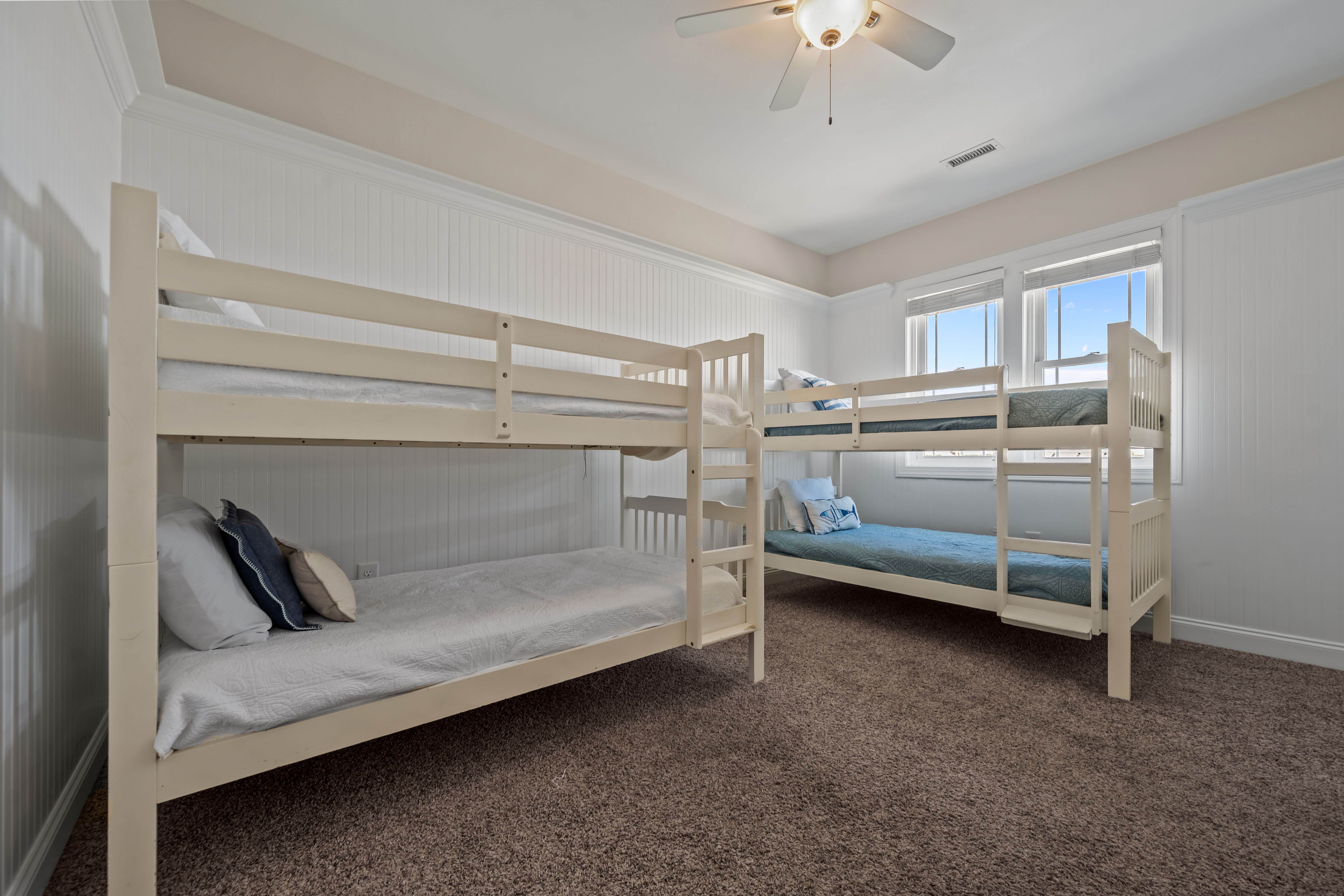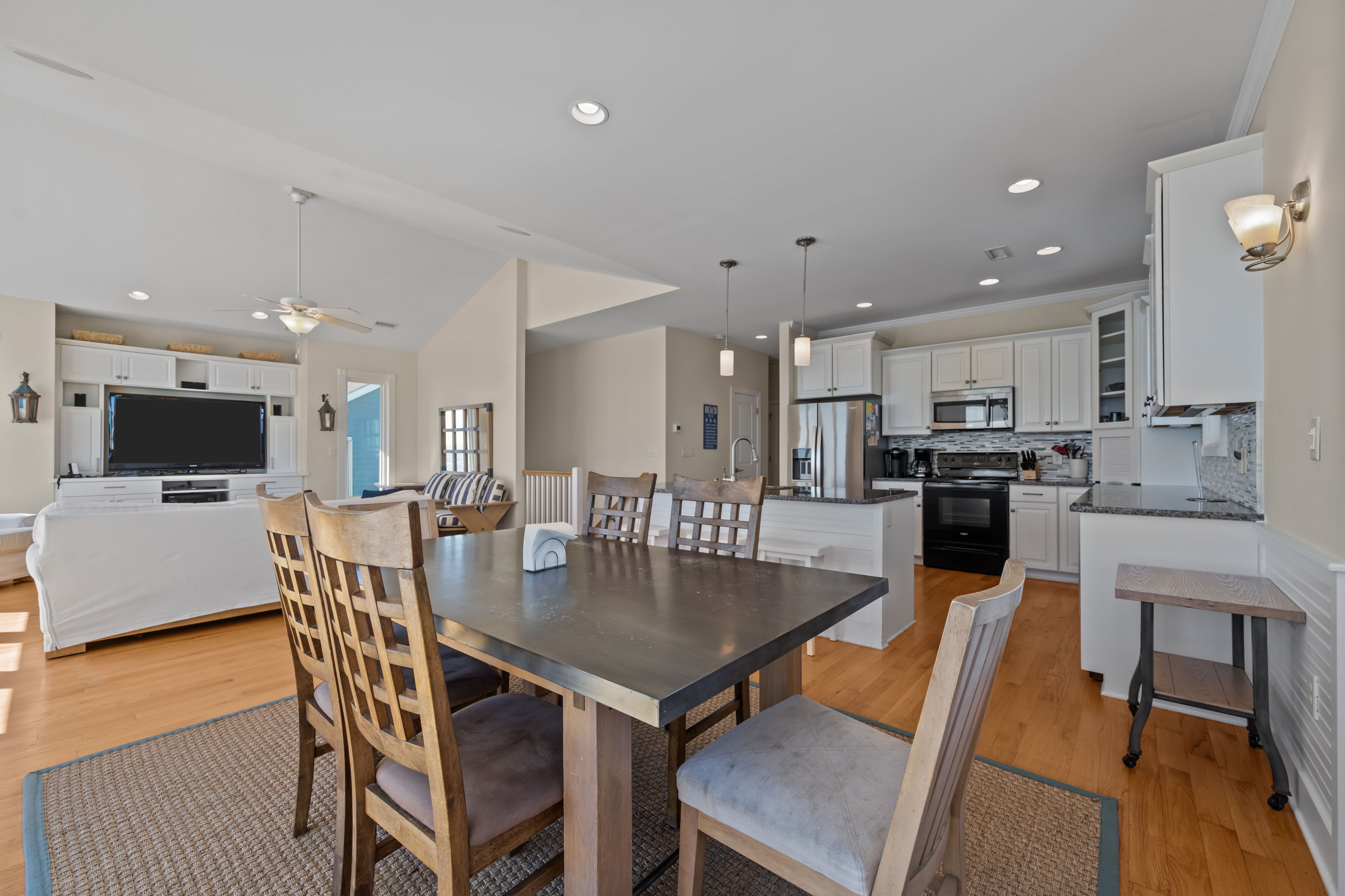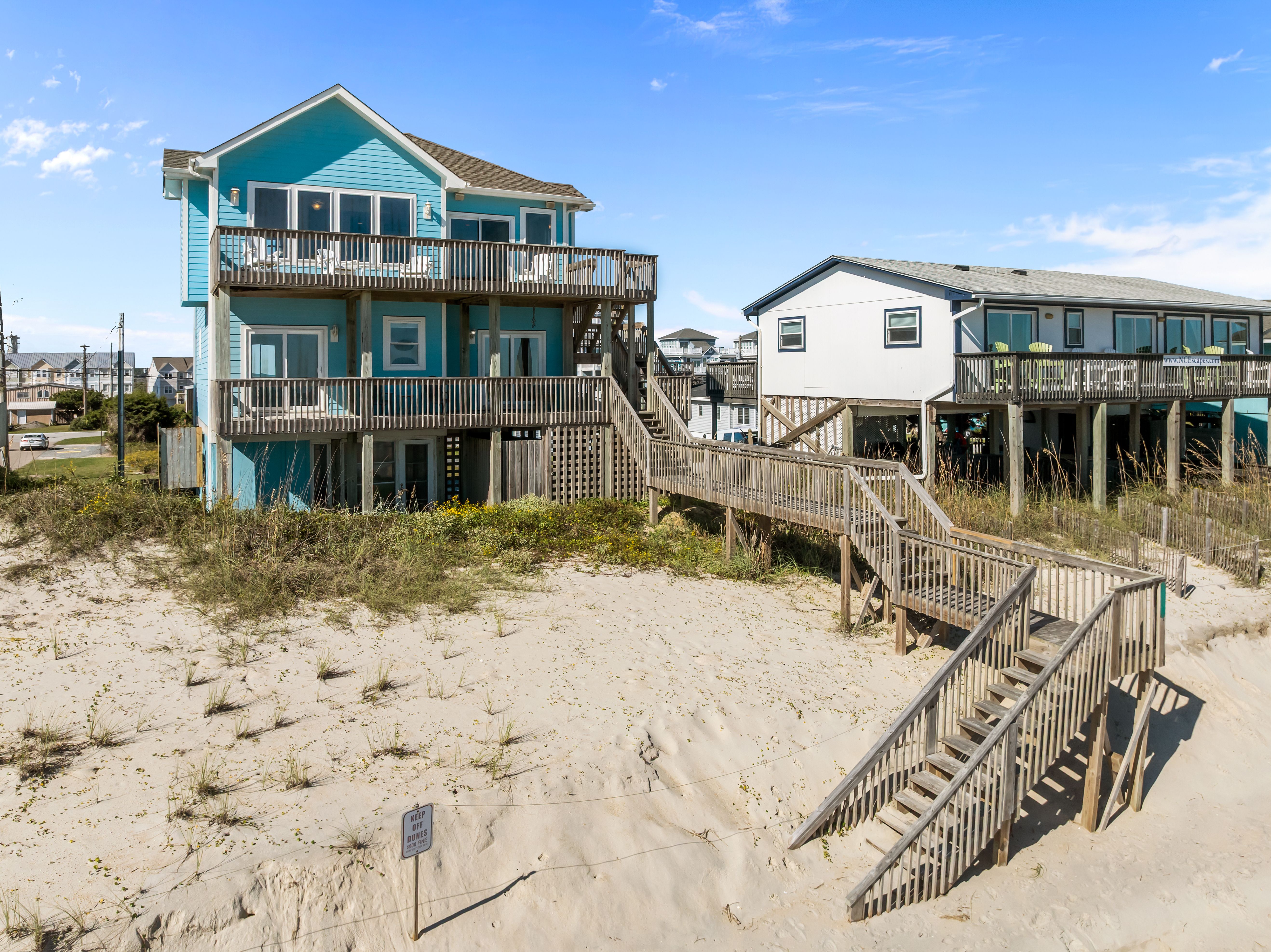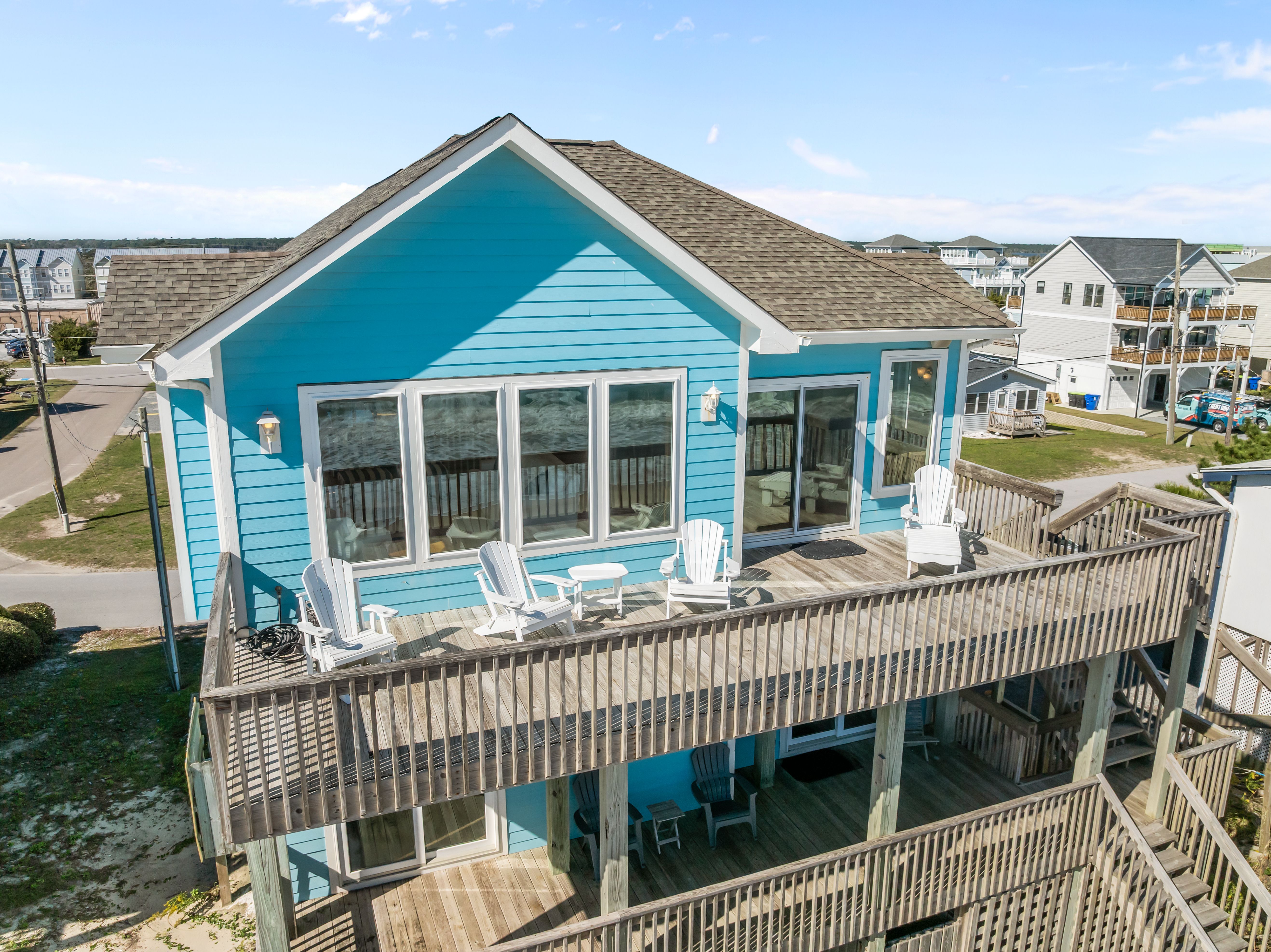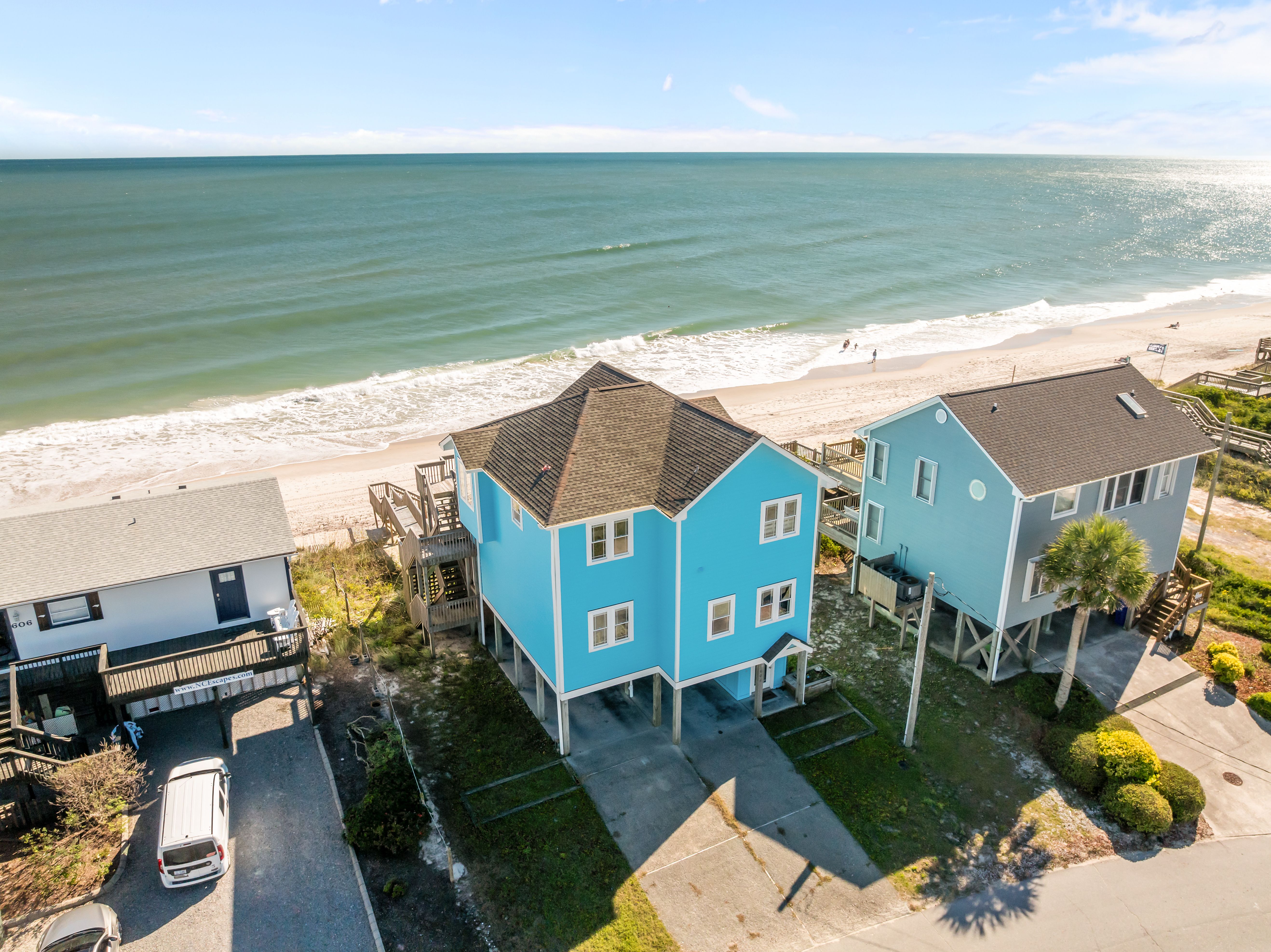 This 5-bedroom, 4-bathroom home comfortably accommodates up to 12 guests. The top floor is designed for gathering and entertaining, featuring a bright and airy great room with a fully equipped kitchen, spacious dining area, and cozy living room complete with built-in entertainment center. Floor-to-ceiling windows showcase sweeping beach views, and sliding doors lead to the oceanfront deck—perfect for morning coffee or evening cocktails as you take in the sights and sounds of the sea. This level also includes a bedroom with two sets of twin over twin bunk beds (sleeping 4) and a full bathroom.