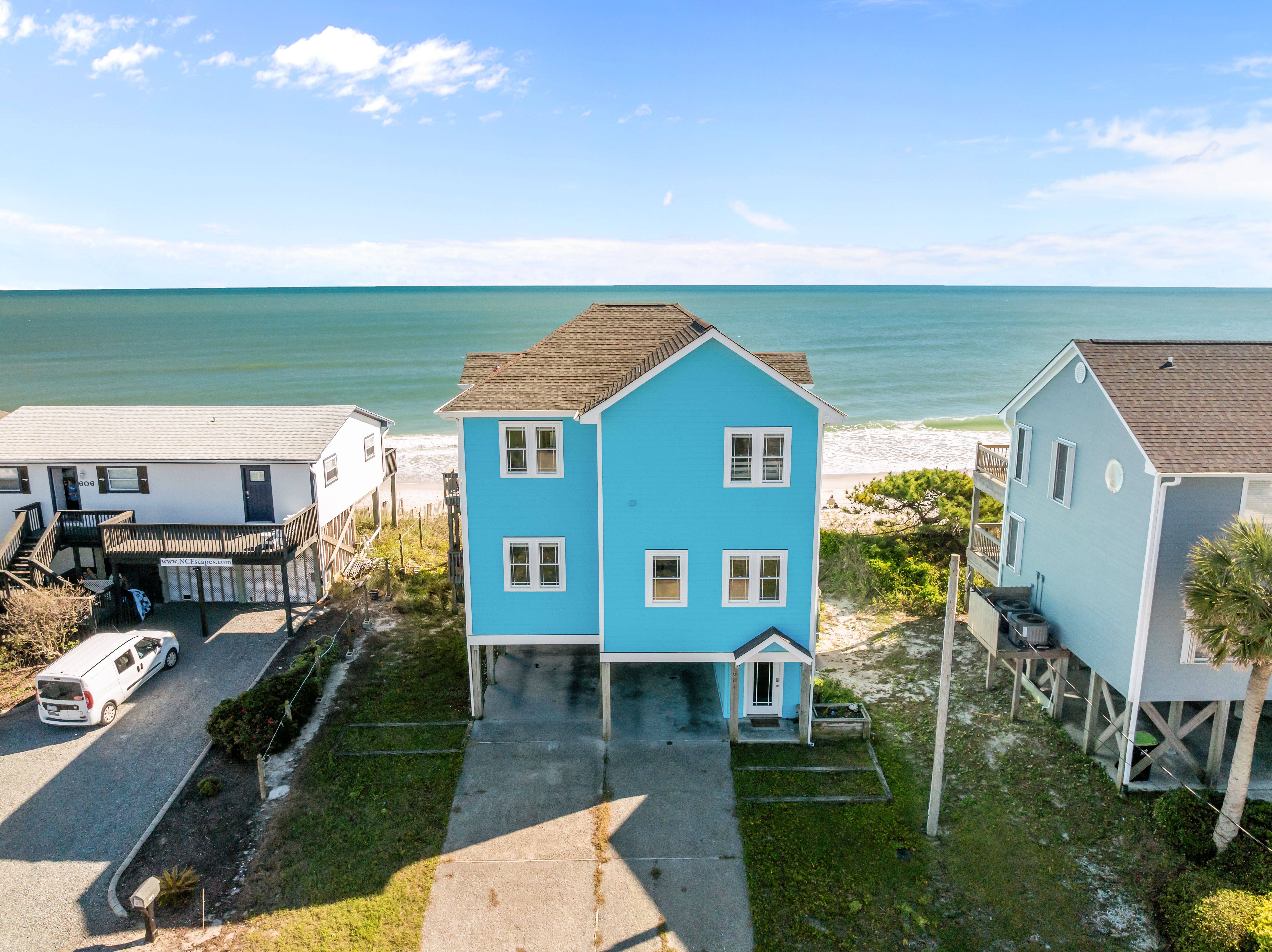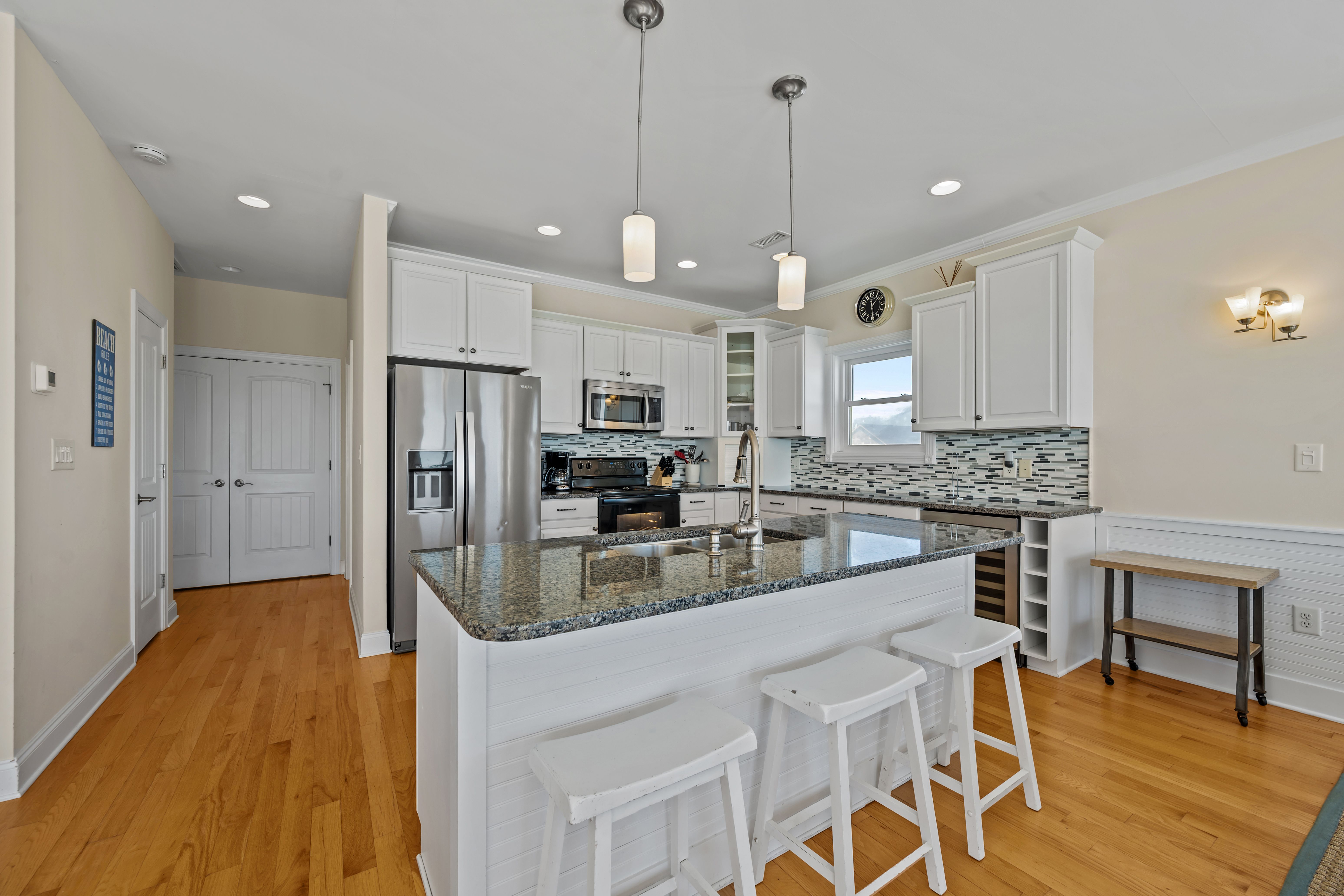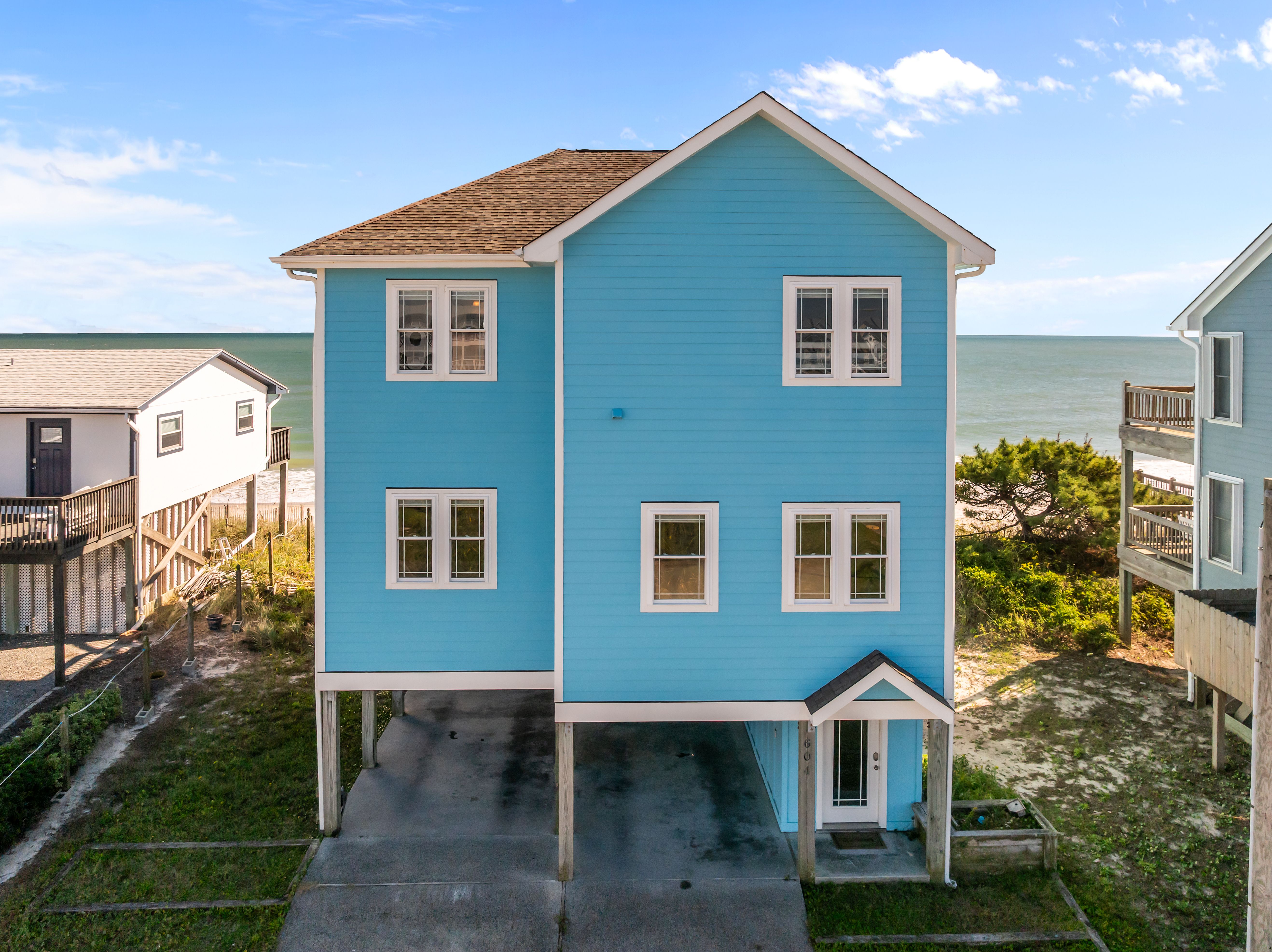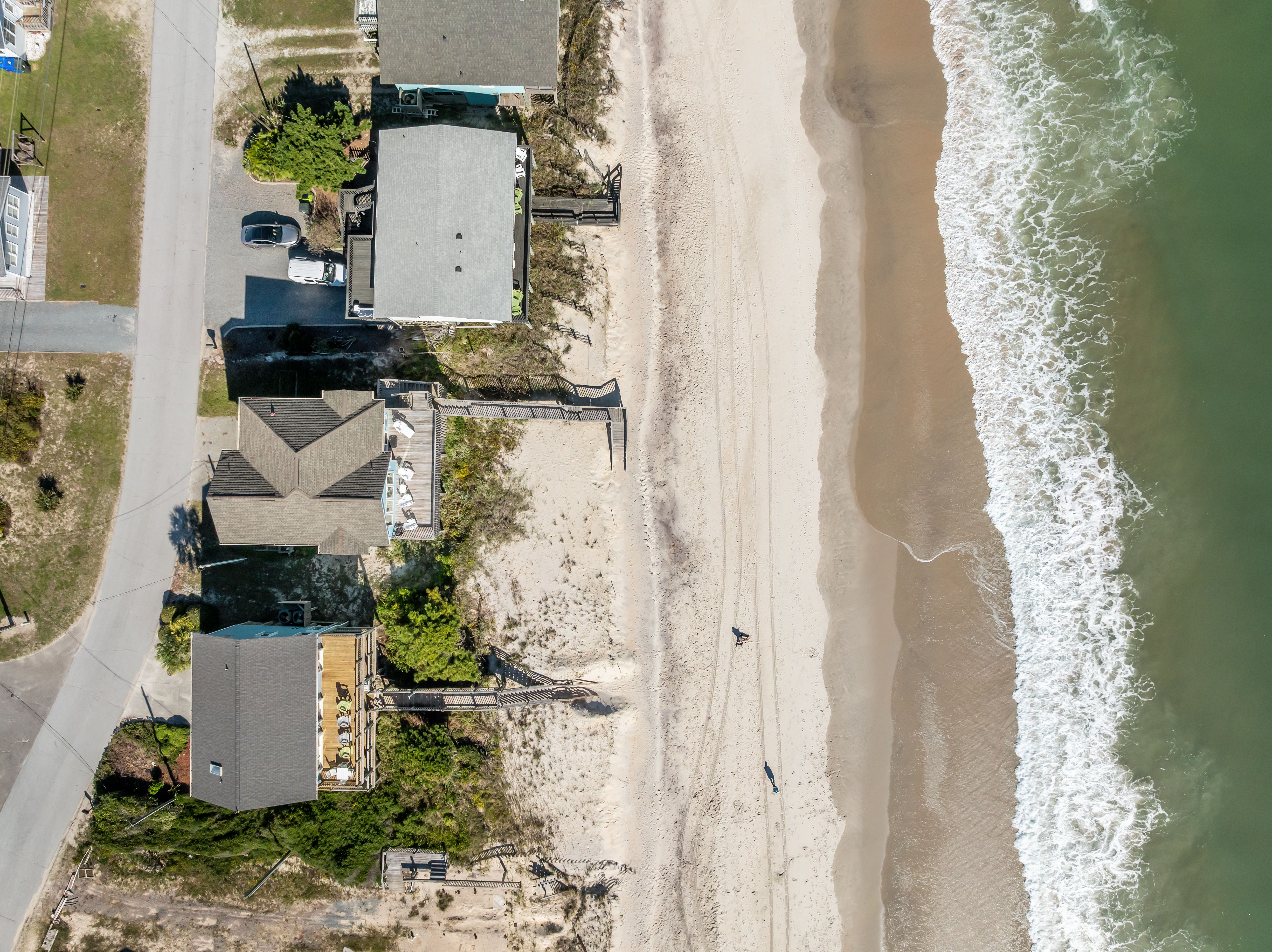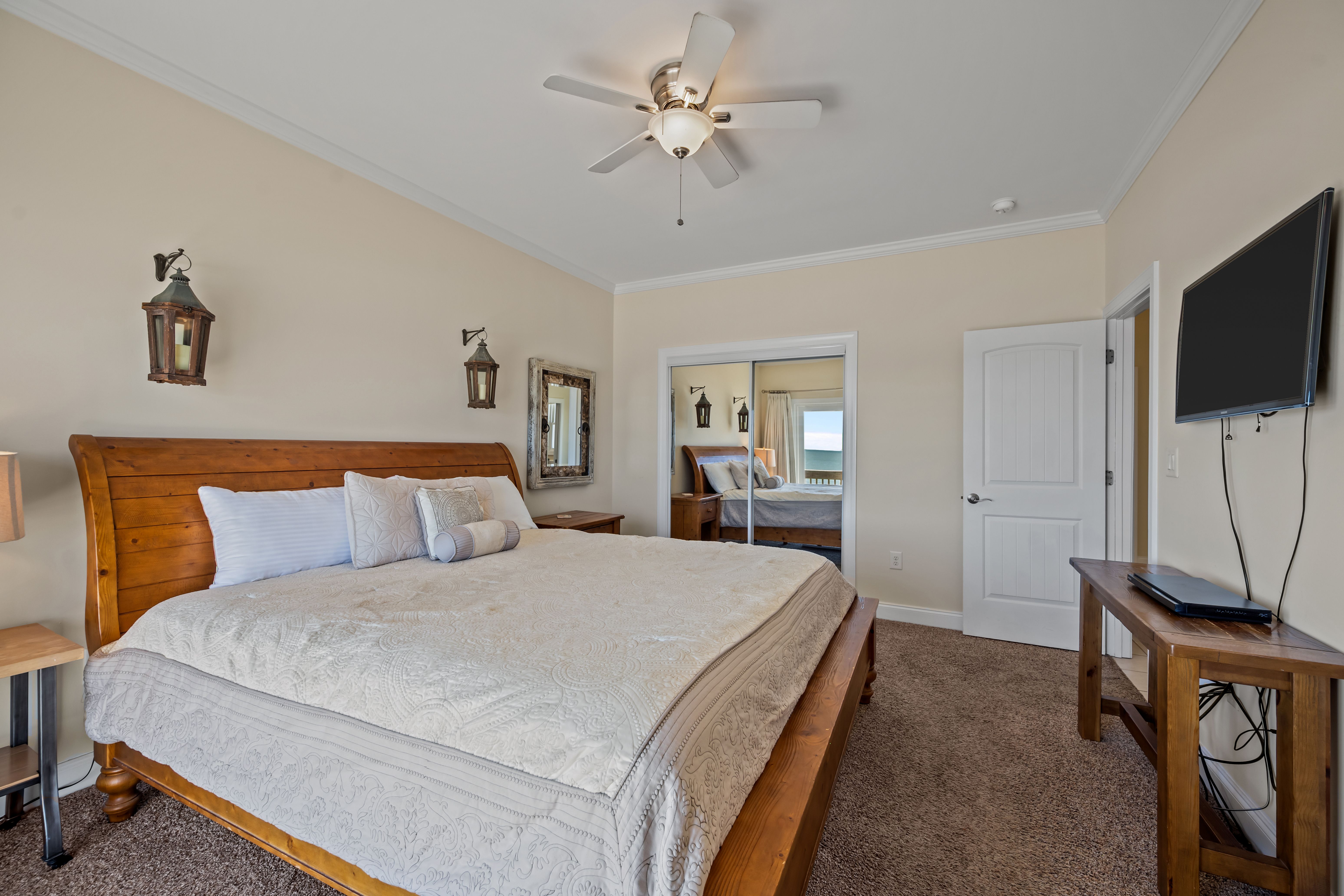 This 5-bedroom, 4-bathroom home comfortably accommodates up to 12 guests. The top floor is designed for gathering and entertaining, featuring a bright and airy great room with a fully equipped kitchen, spacious dining area, and cozy living room complete with built-in entertainment center. Floor-to-ceiling windows showcase sweeping beach views, and sliding doors lead to the oceanfront deck—perfect for morning coffee or evening cocktails as you take in the sights and sounds of the sea. This level also includes a bedroom with two sets of twin over twin bunk beds (sleeping 4) and a full bathroom.
