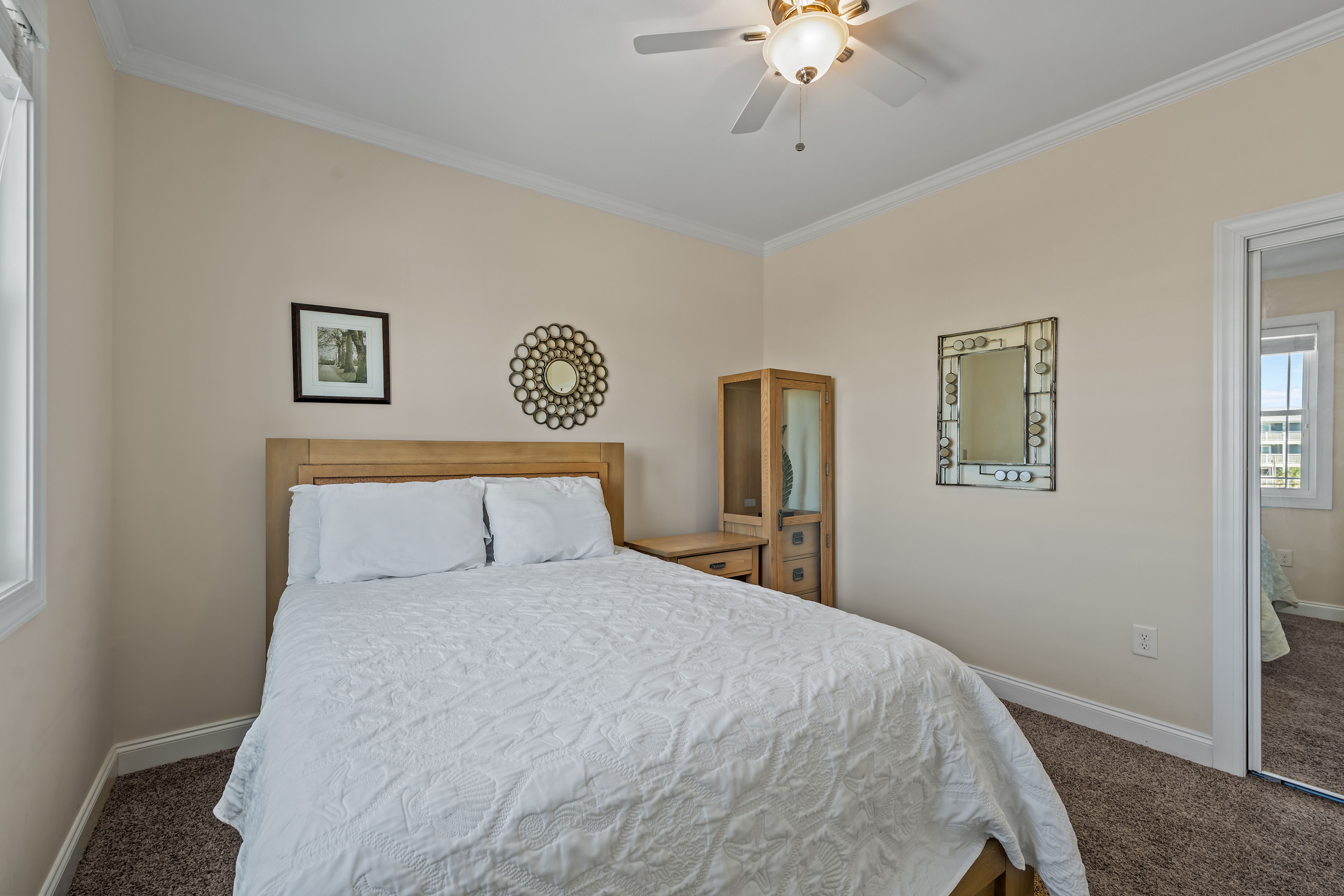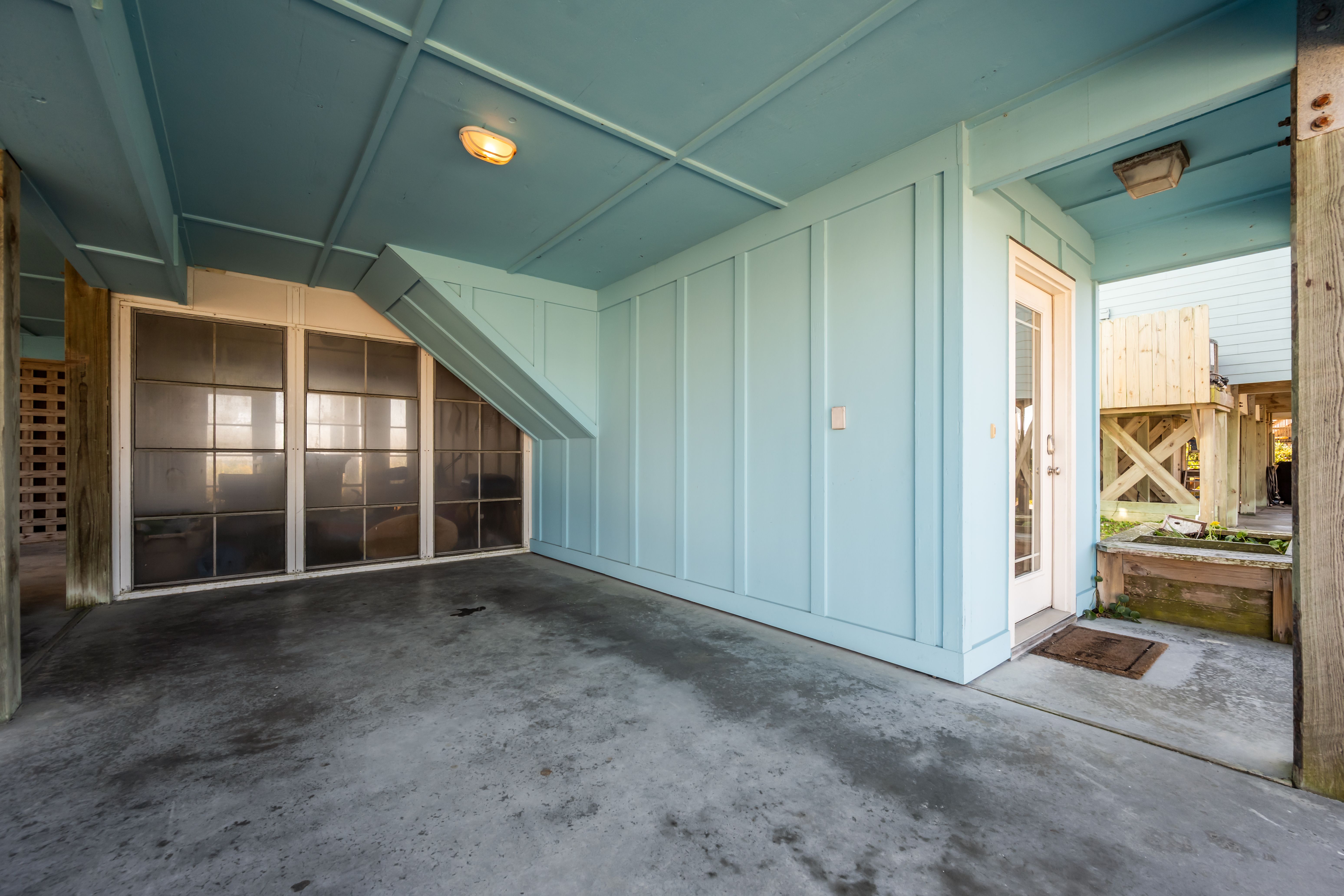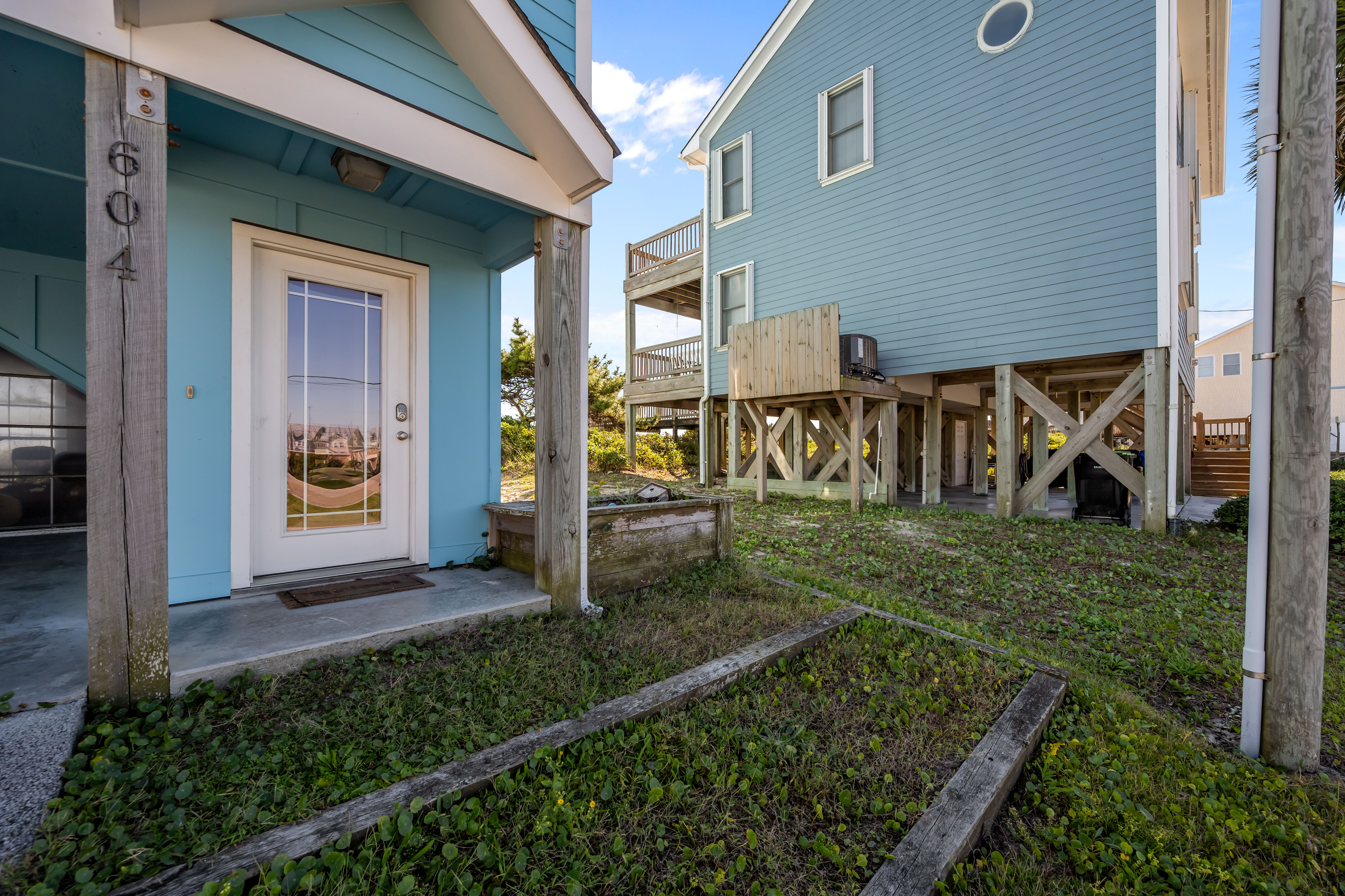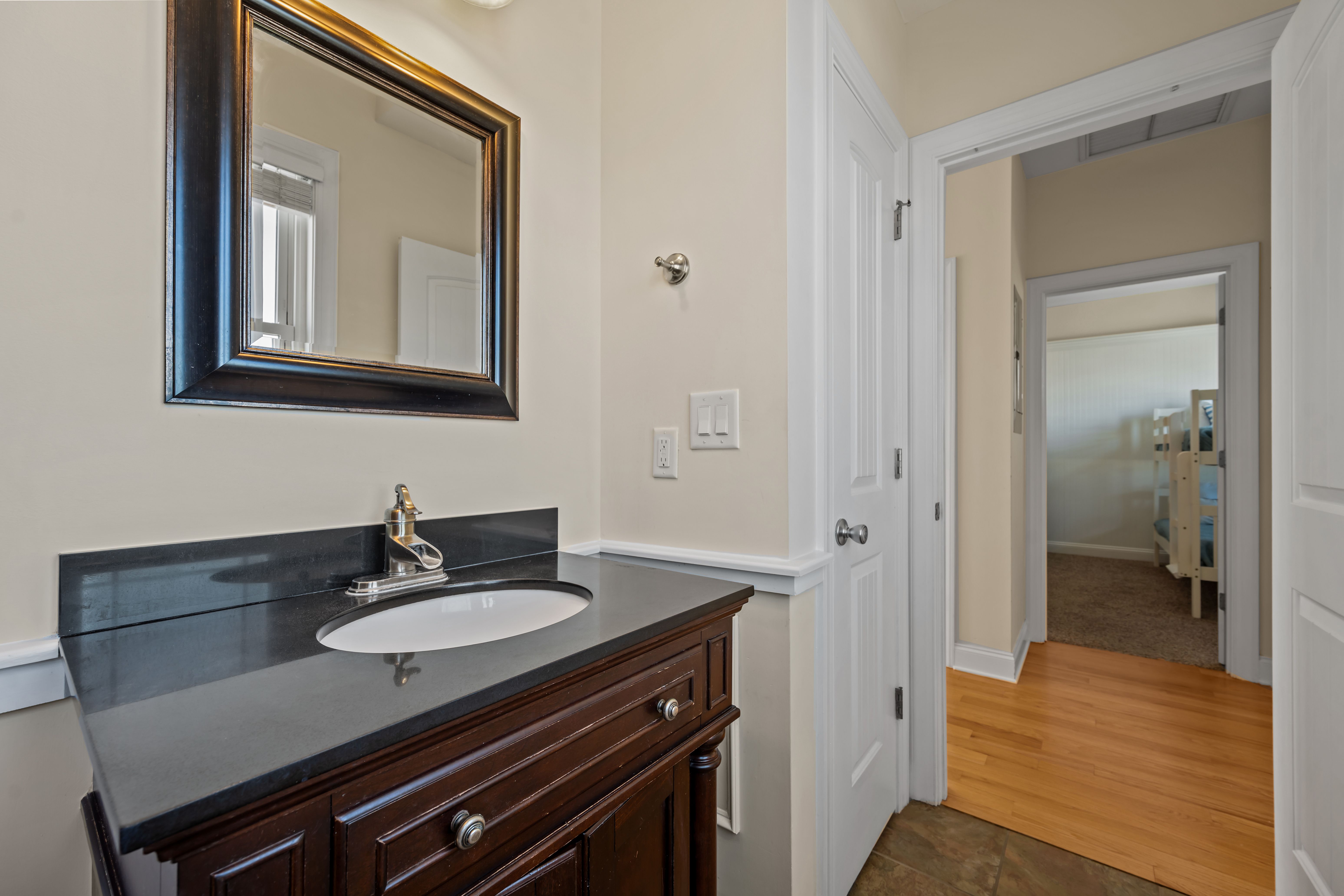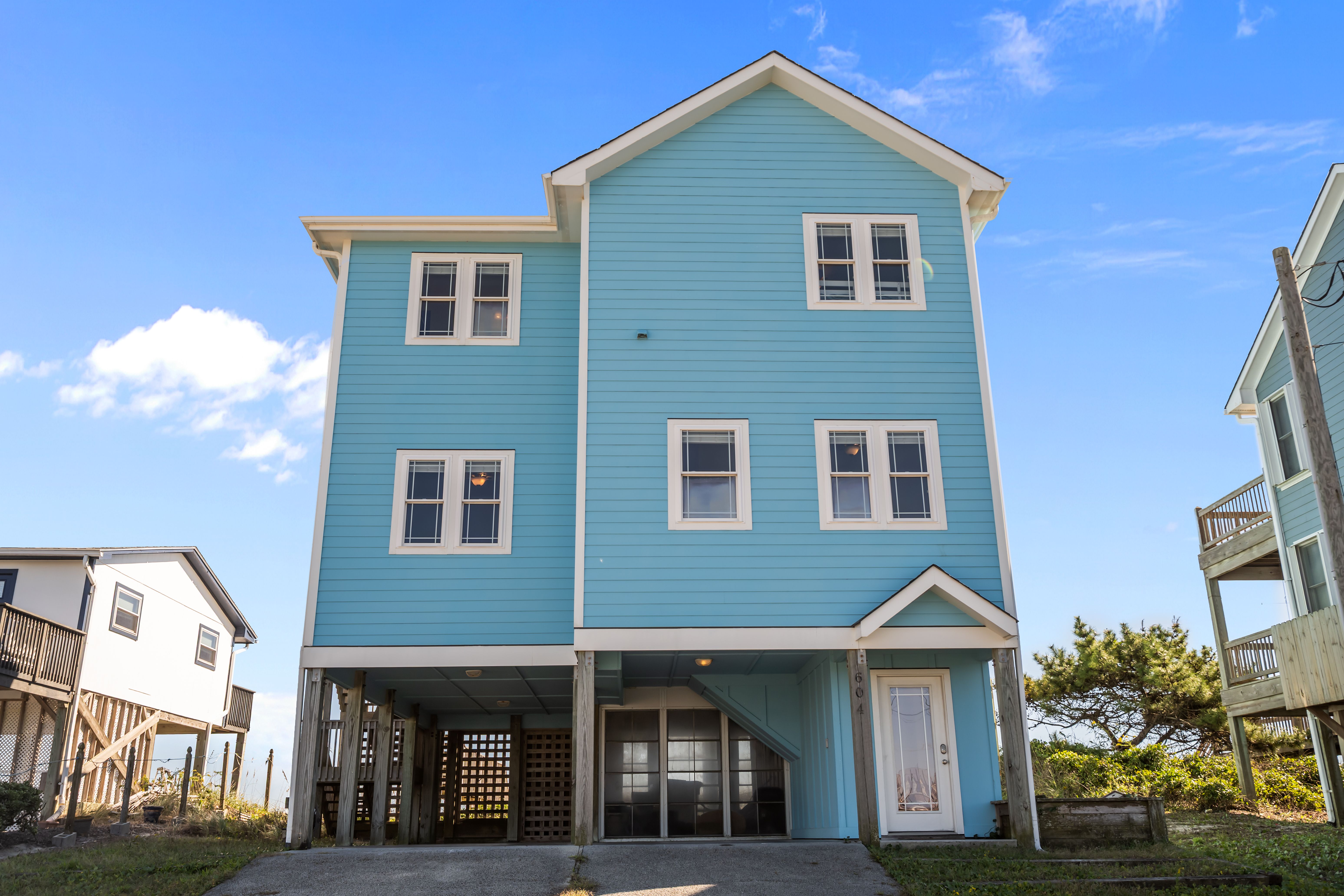 This 5-bedroom, 4-bathroom home comfortably accommodates up to 12 guests. The top floor is designed for gathering and entertaining, featuring a bright and airy great room with a fully equipped kitchen, spacious dining area, and cozy living room complete with built-in entertainment center. Floor-to-ceiling windows showcase sweeping beach views, and sliding doors lead to the oceanfront deck—perfect for morning coffee or evening cocktails as you take in the sights and sounds of the sea. This level also includes a bedroom with two sets of twin over twin bunk beds (sleeping 4) and a full bathroom.