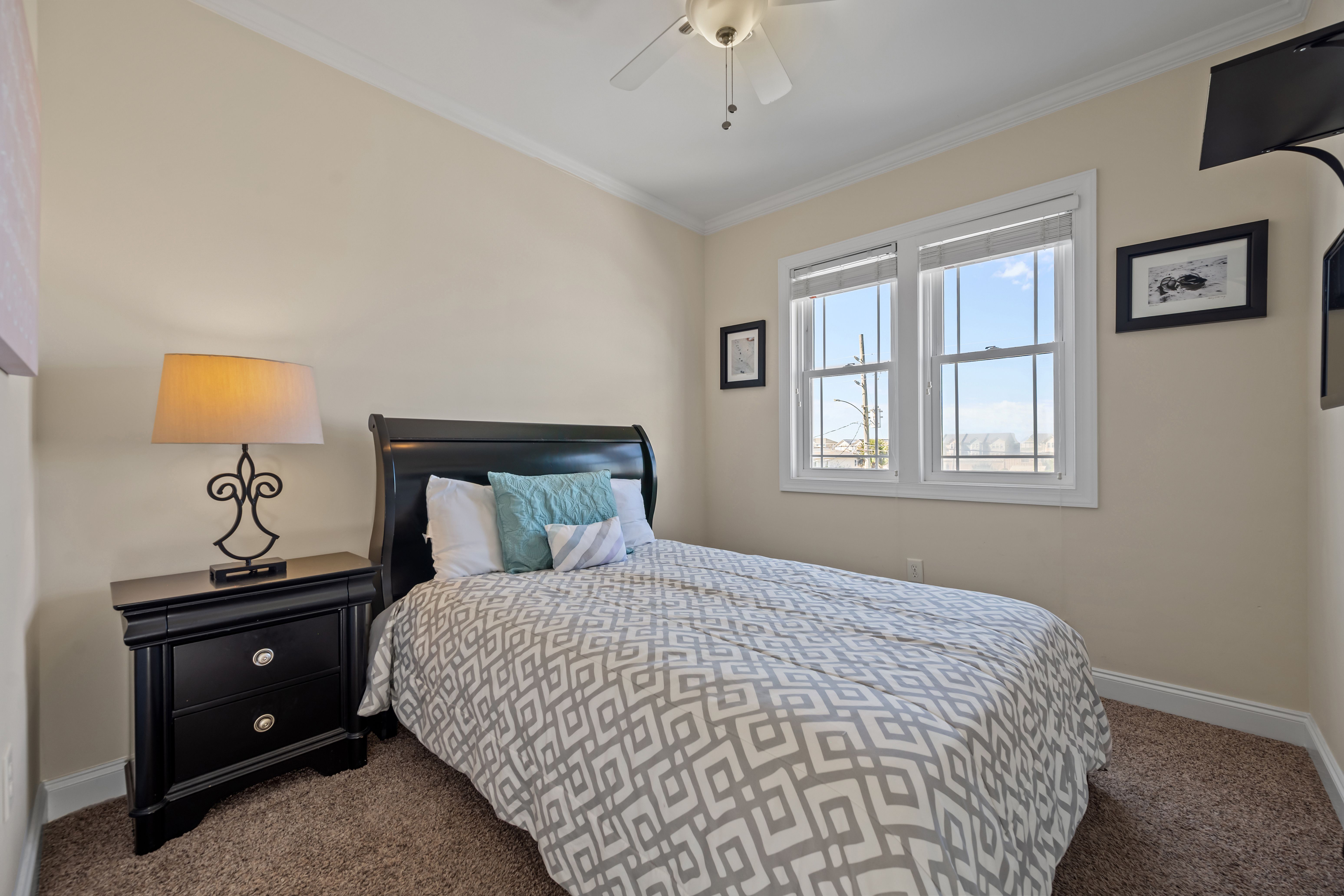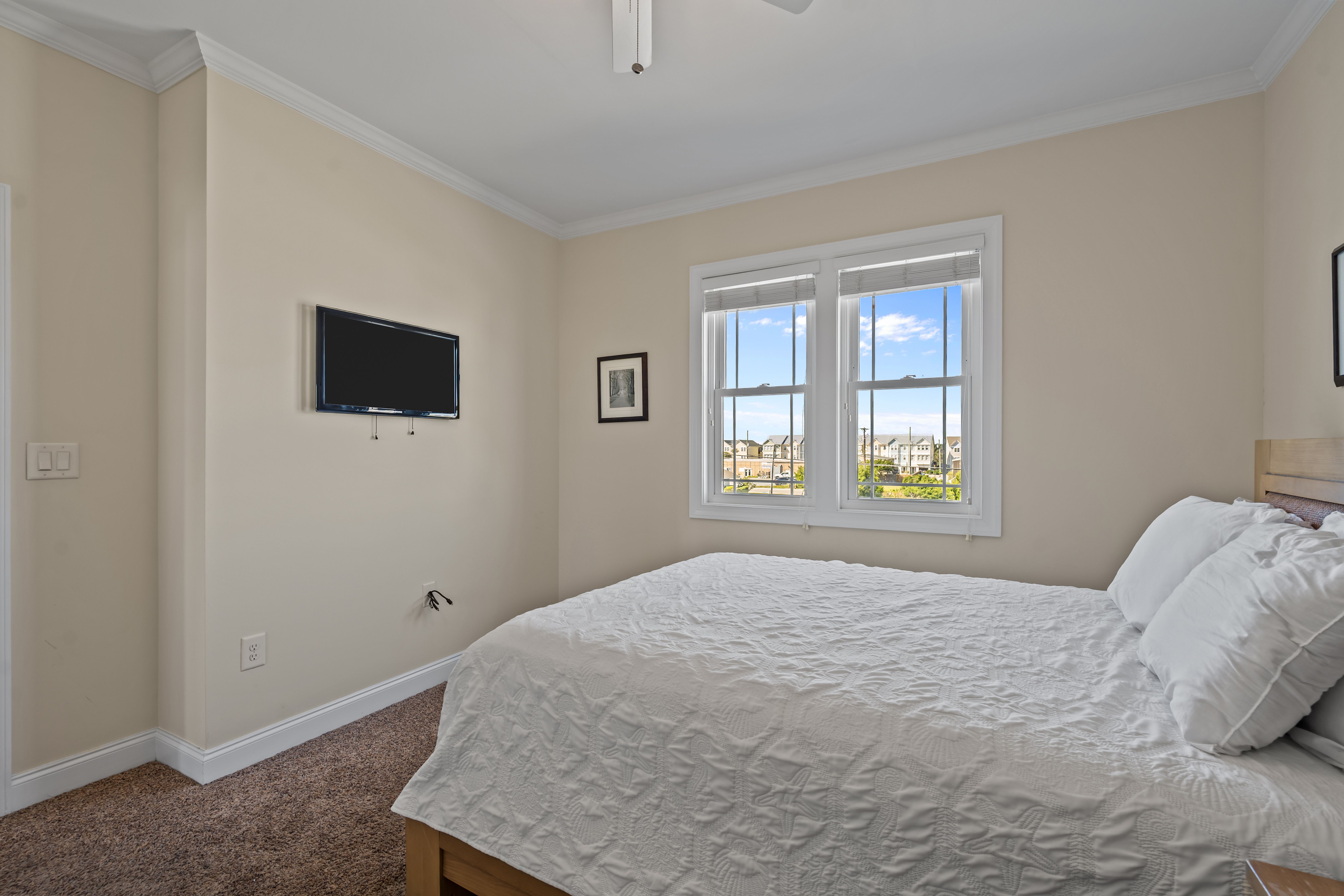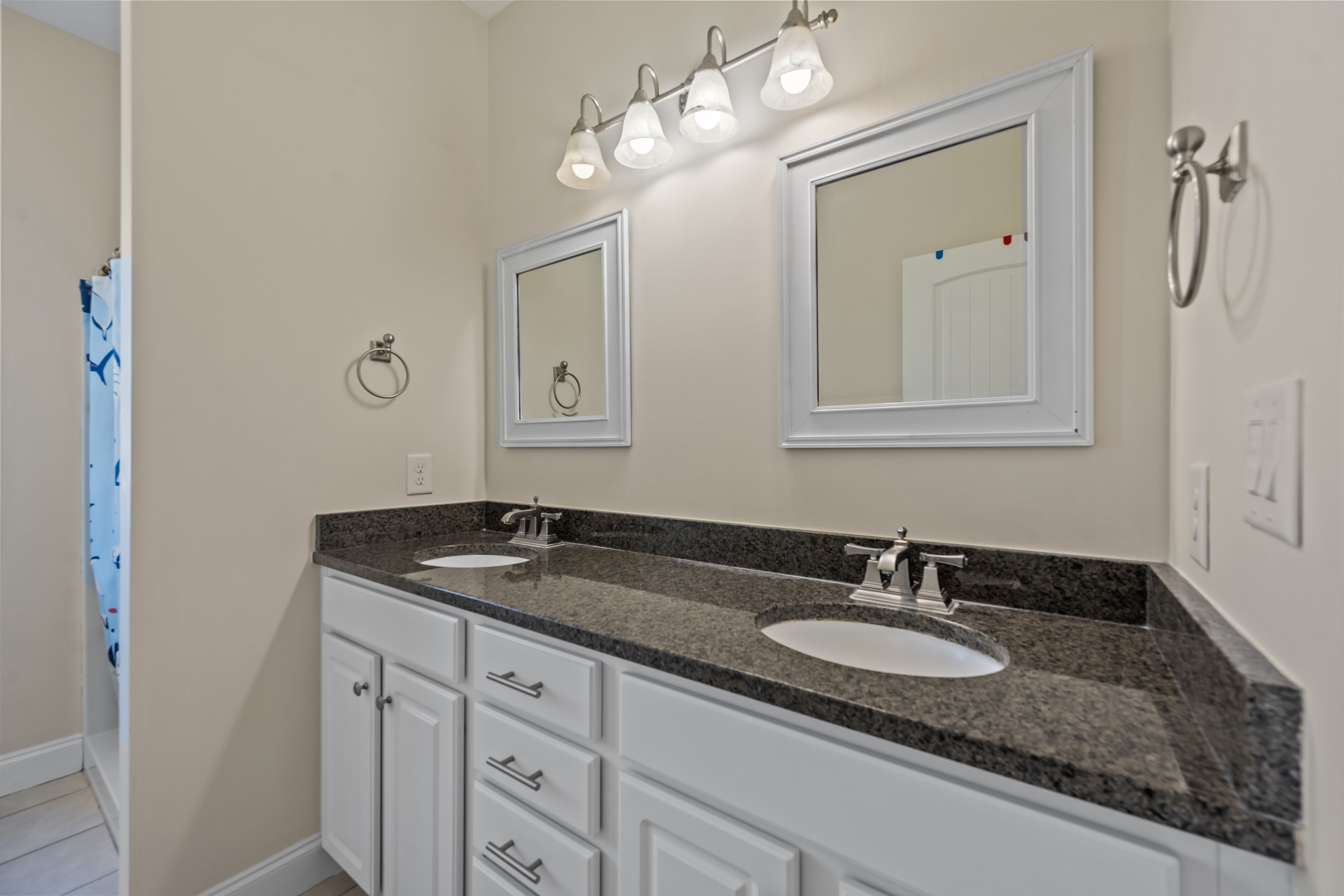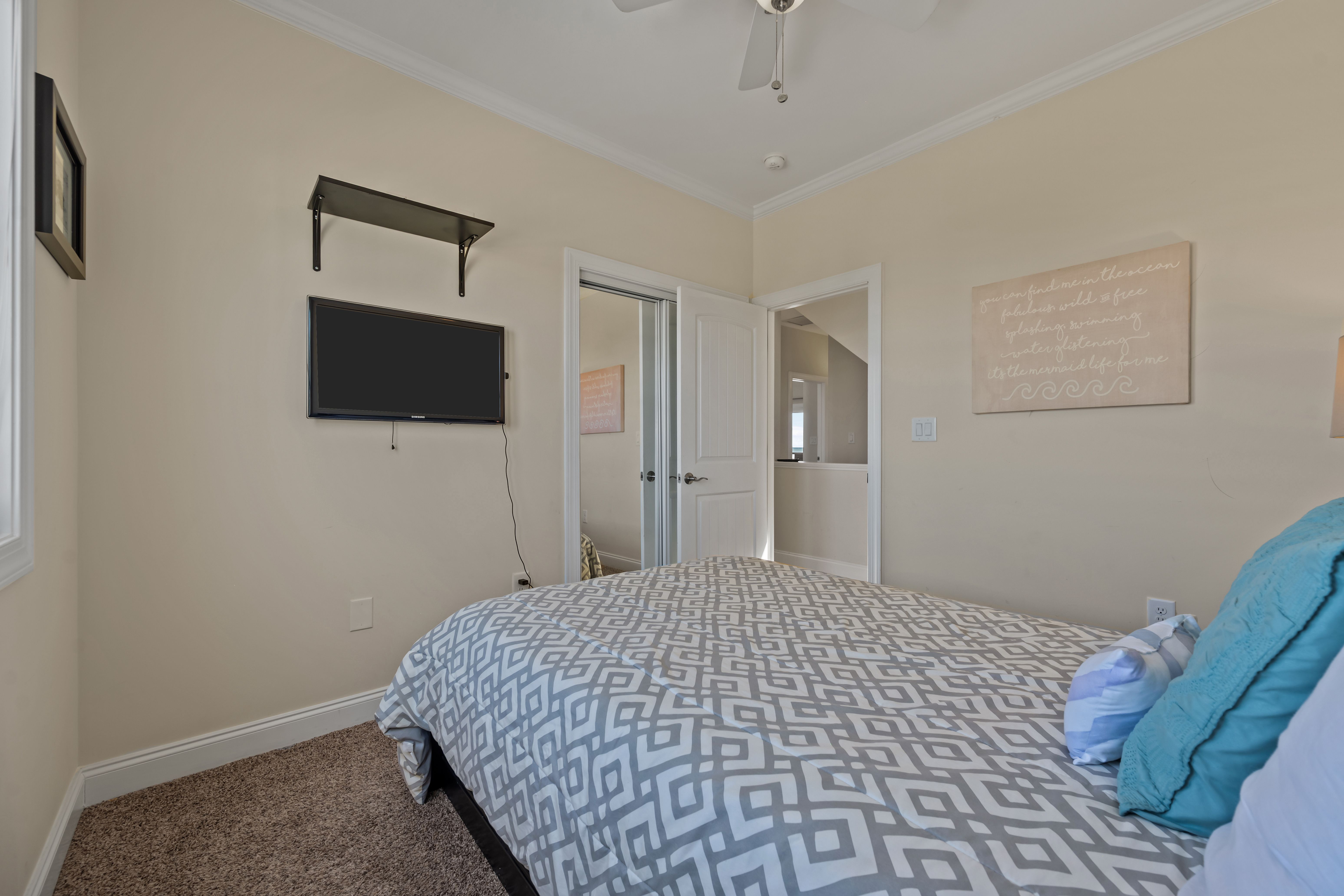 Downstairs, you will find four additional bedrooms and three full baths. The oceanfront primary suite offers a king bed, private access to the covered deck, and a luxurious ensuite bathroom with dual vanities. Another oceanfront room doubles as a second living area, offering a sleeper sofa, large TV, private bath, and deck access—ideal for extra guests or a movie night by the beach. Two more guest rooms, one with a queen bed and the other with a full bed plus a twin trundle, share a full hall bathroom and are located on the street side of the home.