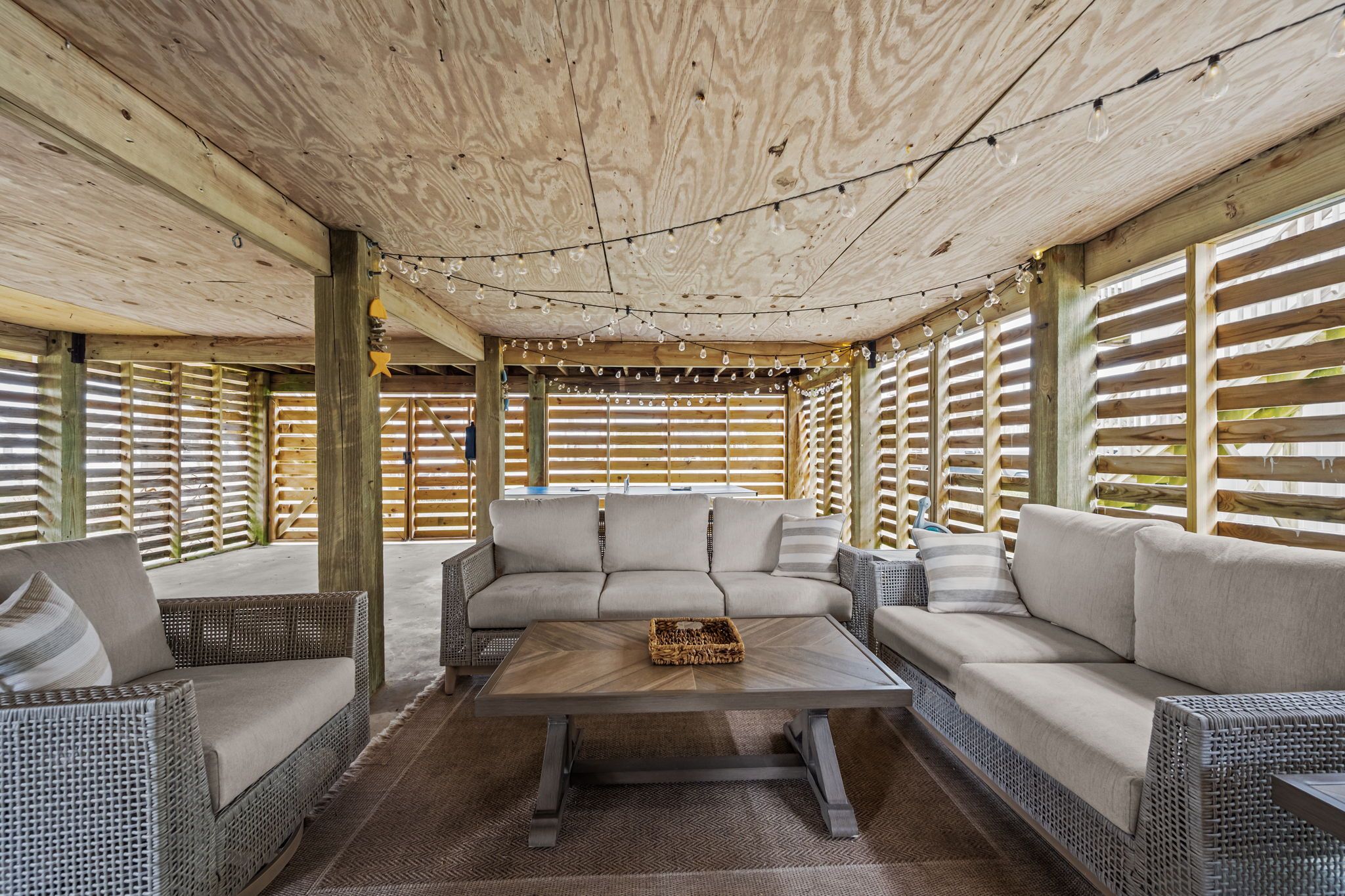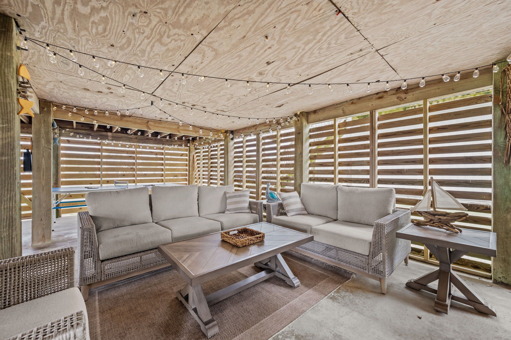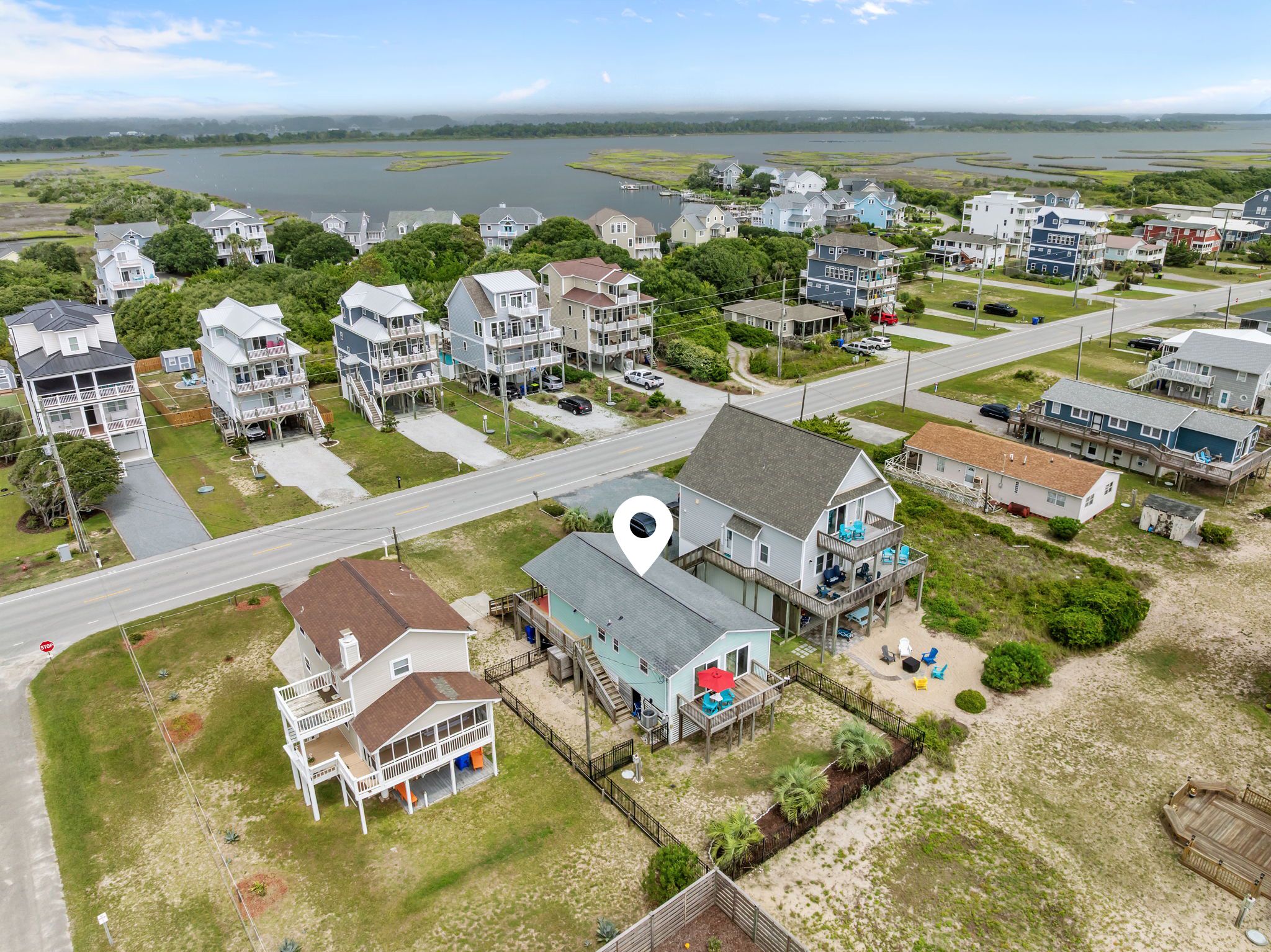 Outside is where the real fun begins! The fully fenced backyard is ideal for both play and relaxation, featuring an outdoor tiki bar with an extra microwave and blender, a picnic table, plenty of seating, and a ping pong table for friendly competition. After a day at the shore, rinse off the sand in the outdoor shower and settle in for an evening under the stars.