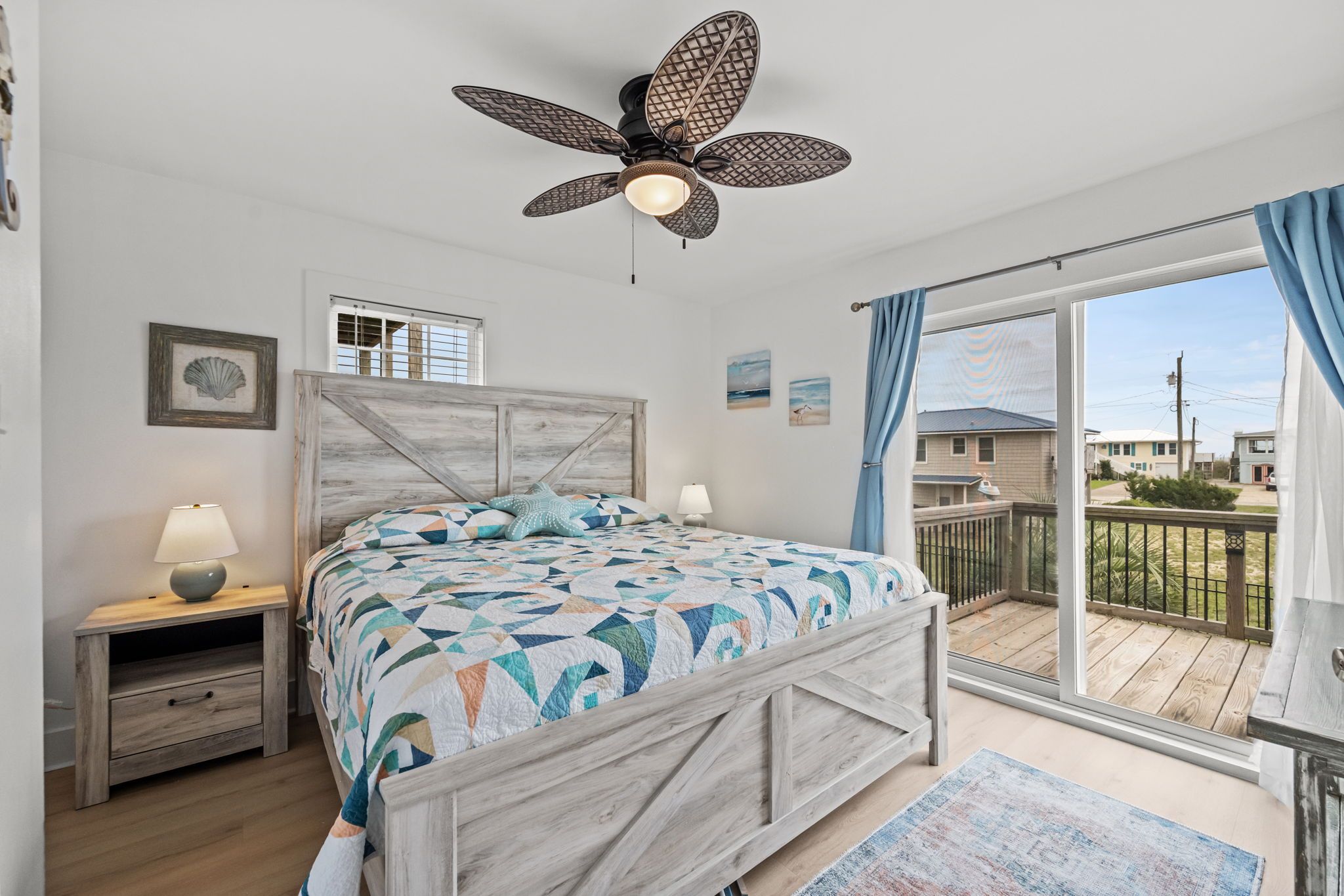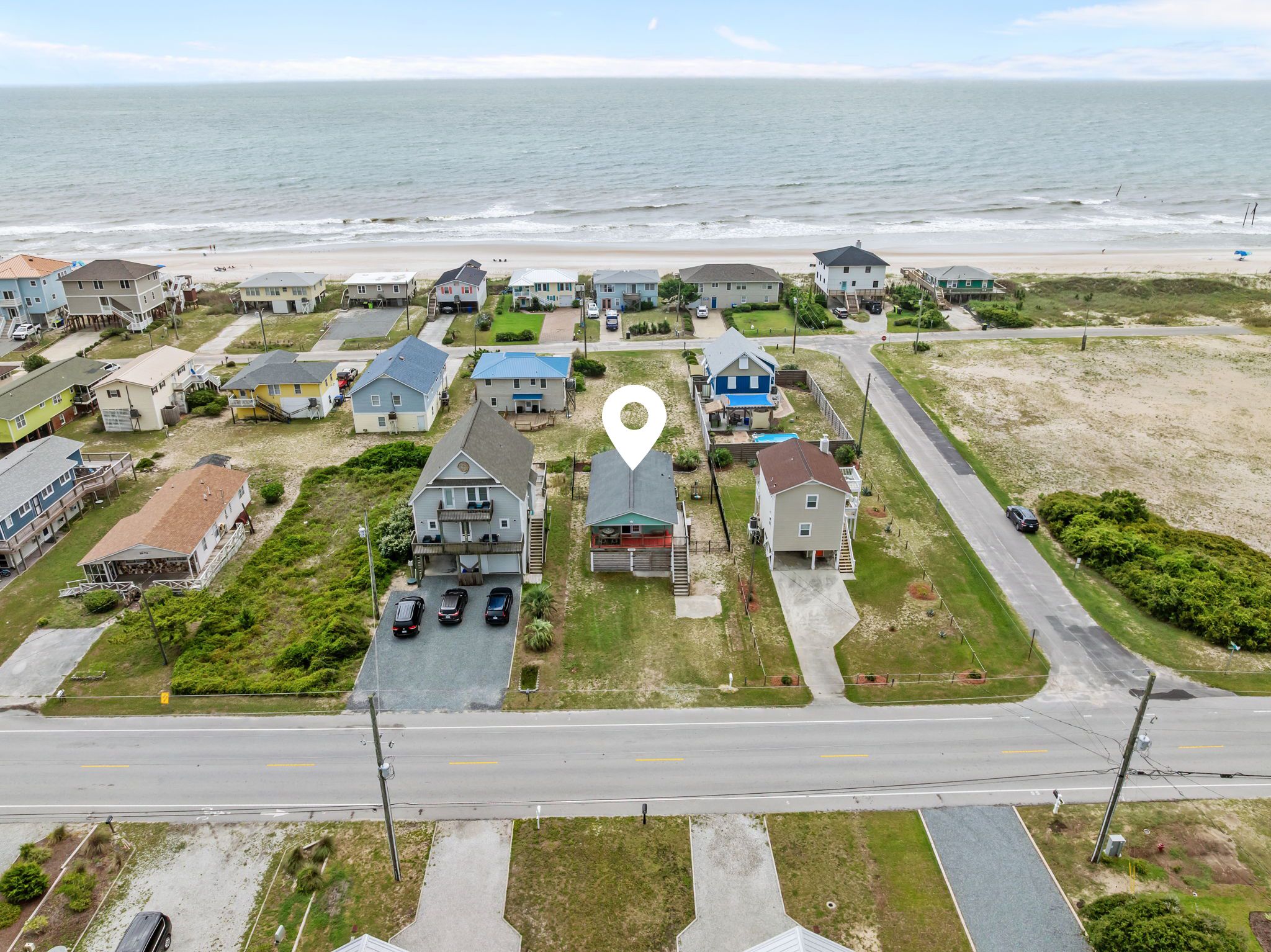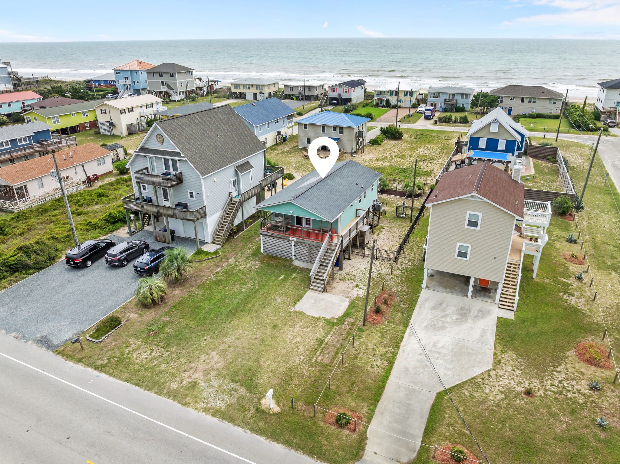 Step inside to find bright, beachy décor and a fully stocked kitchen ready for all your vacation cooking needs. The oceanside master bedroom offers a plush king bed with a private half-bath ensuite, while the second oceanside queen bedroom provides comfort and style. Both the ocean side bedrooms have private deck access with seating to enjoy morning coffee or an evening cocktail. The third bedroom features a fun twin-over-full bunk bed, perfect for kids or extra guests. A hallway bath with a stand-up shower and a full-sized washer and dryer make for a hassle-free stay.