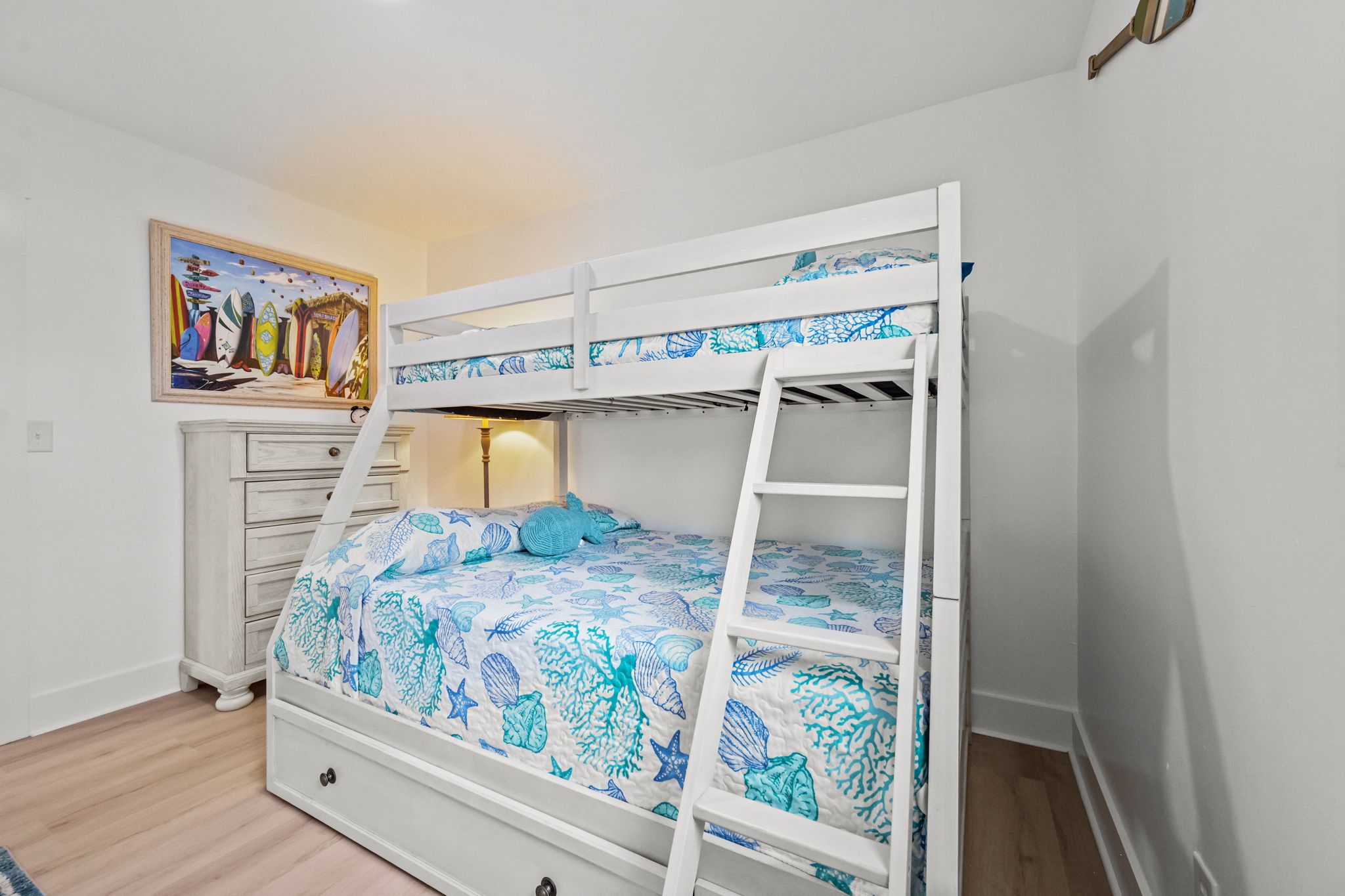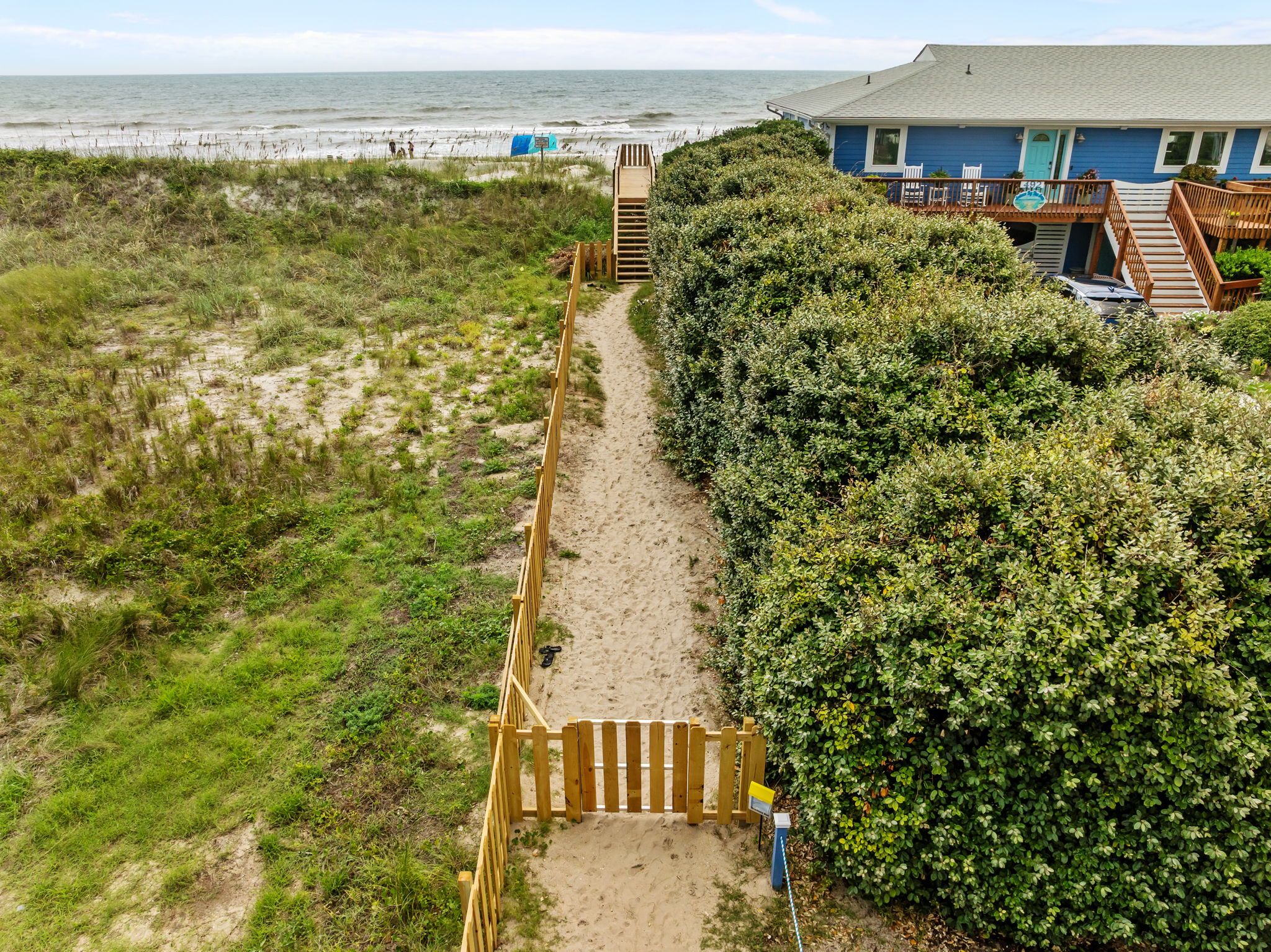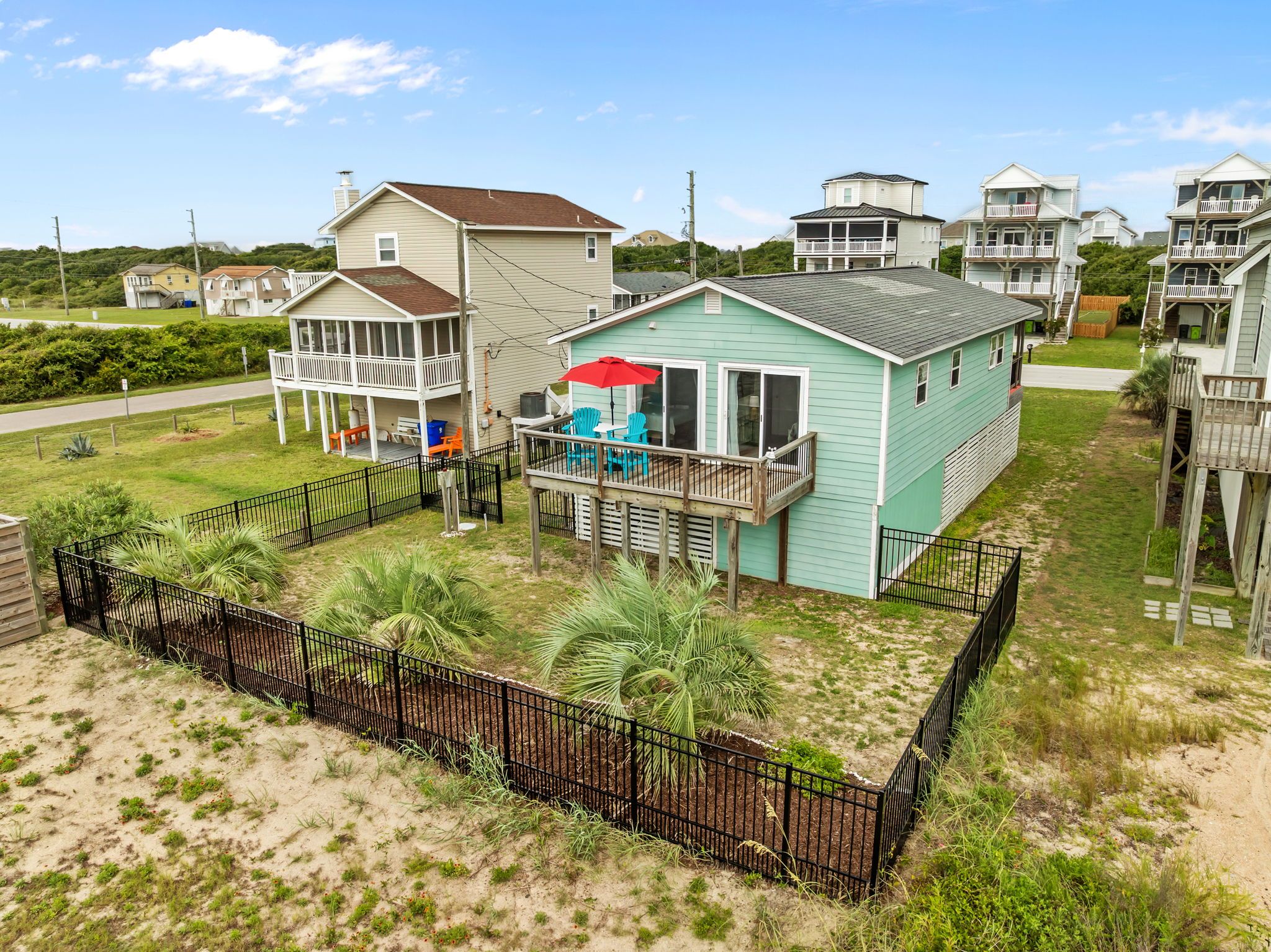 Step inside to find bright, beachy décor and a fully stocked kitchen ready for all your vacation cooking needs. The oceanside master bedroom offers a plush king bed with a private half-bath ensuite, while the second oceanside queen bedroom provides comfort and style. Both the ocean side bedrooms have private deck access with seating to enjoy morning coffee or an evening cocktail. The third bedroom features a fun twin-over-full bunk bed, perfect for kids or extra guests. A hallway bath with a stand-up shower and a full-sized washer and dryer make for a hassle-free stay.