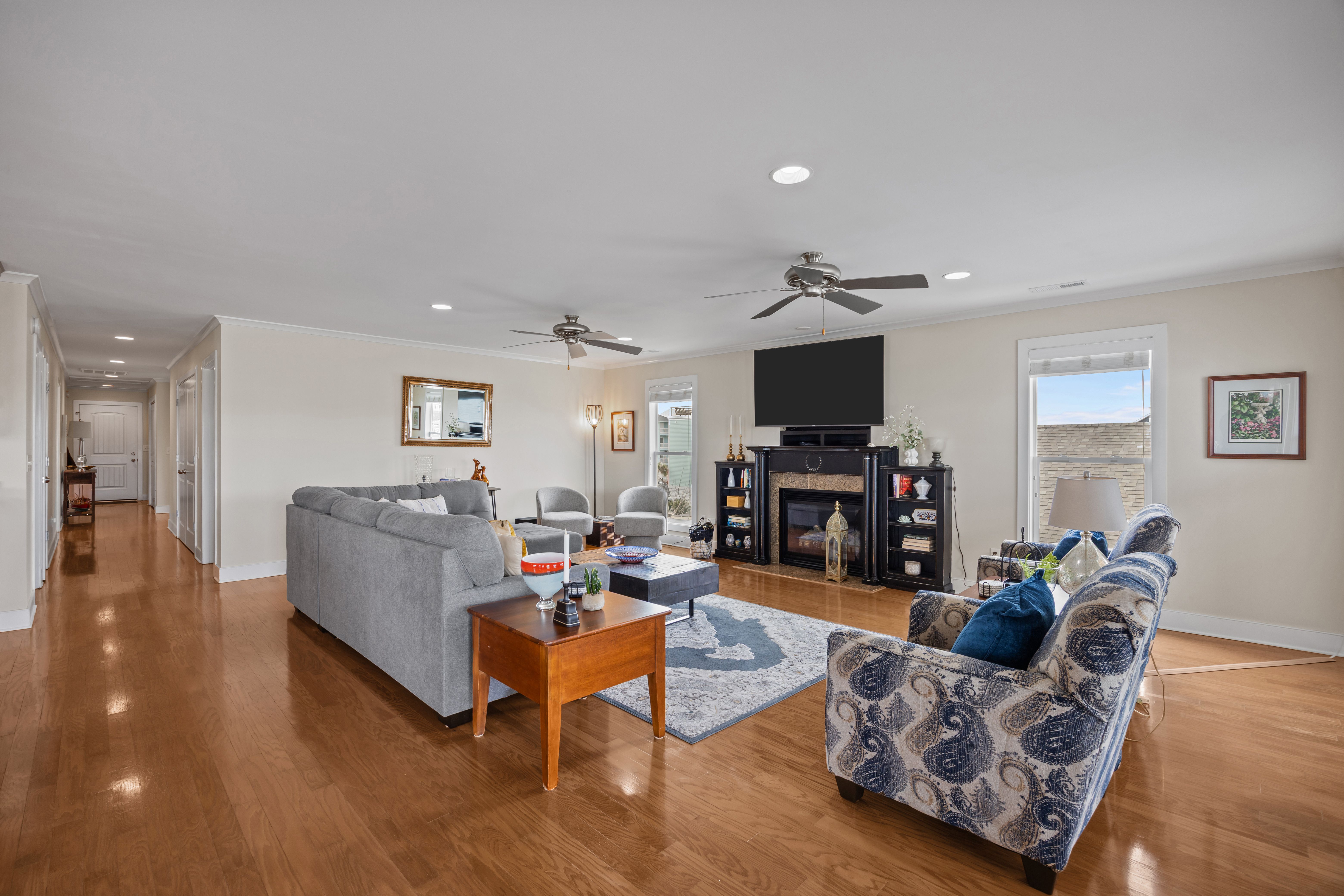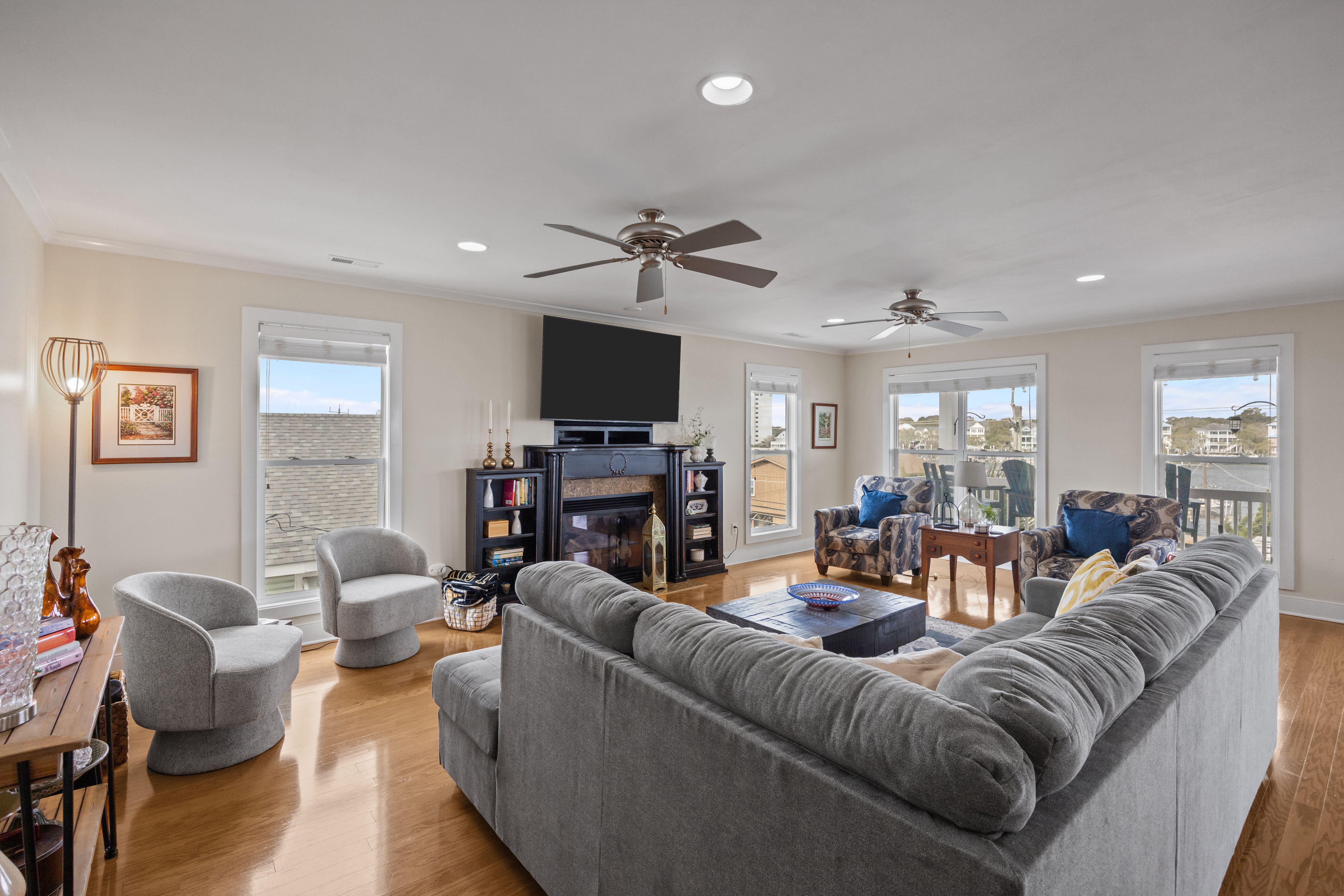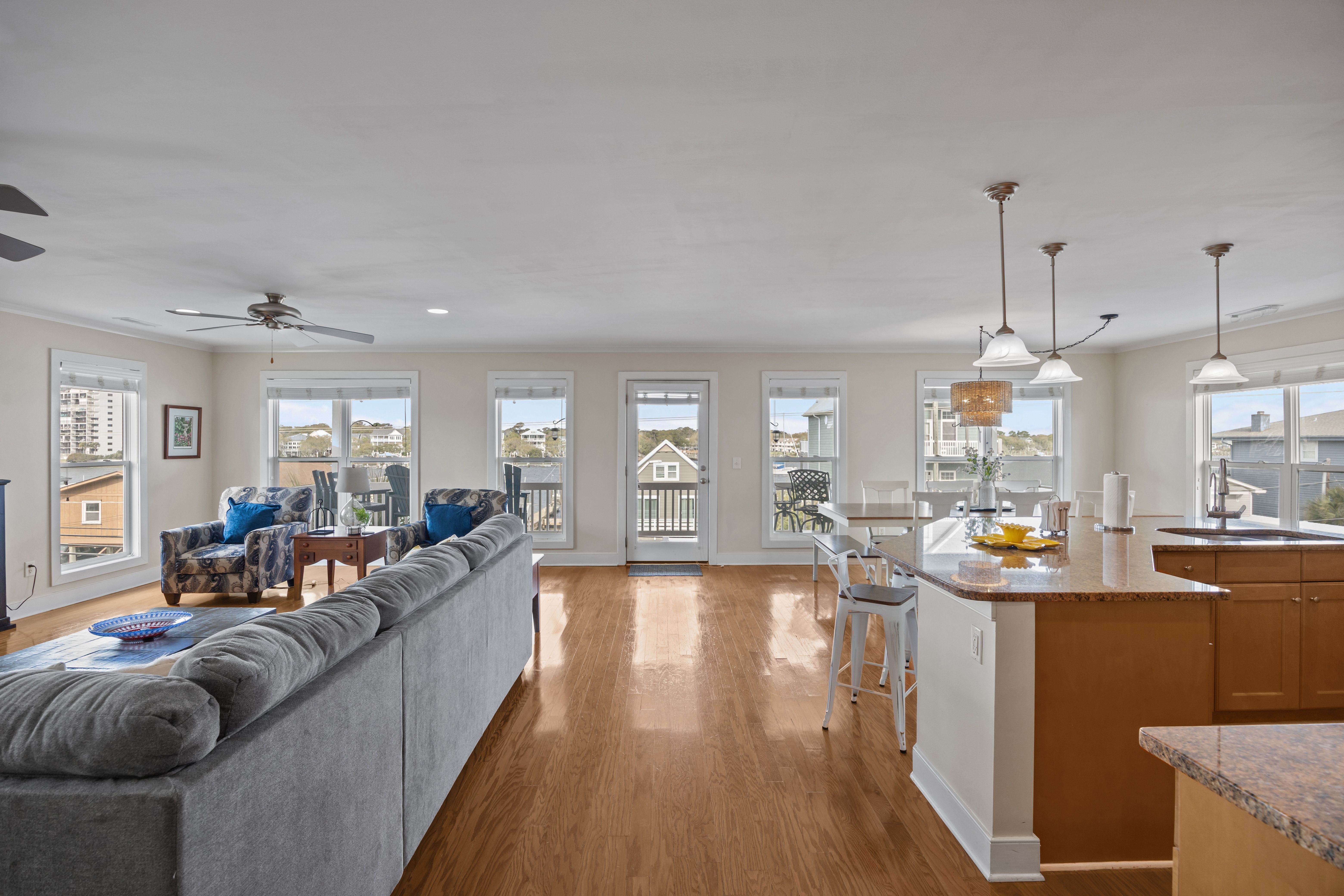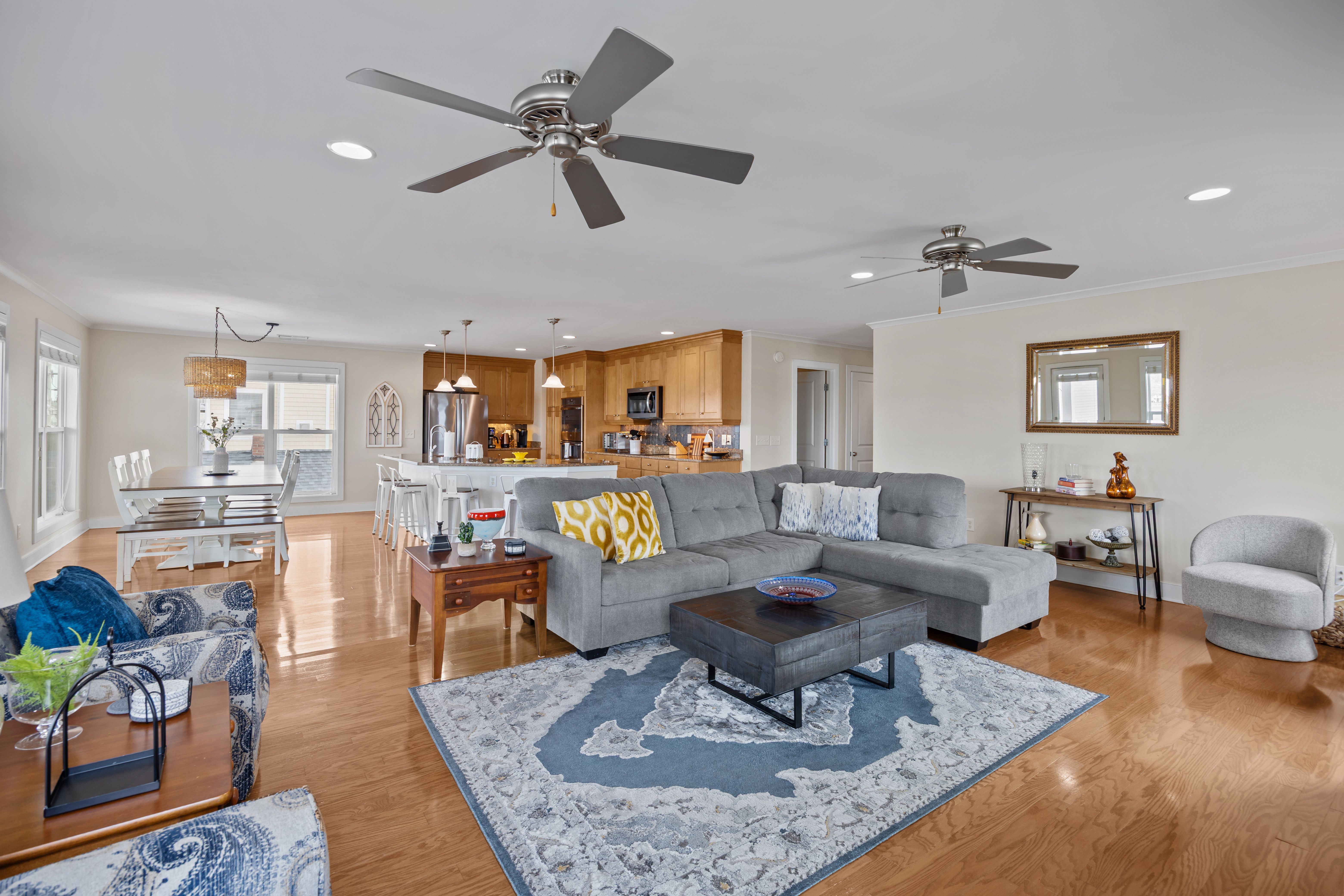 Enter through the ground-level carport and take the elevator or stairs to the open-concept main living area filled with natural light and coastal charm. The inviting living room offers plenty of comfortable seating for movie nights, game days, or relaxing after a day on the water, and opens onto a spacious deck with sound views and gentle breezes.