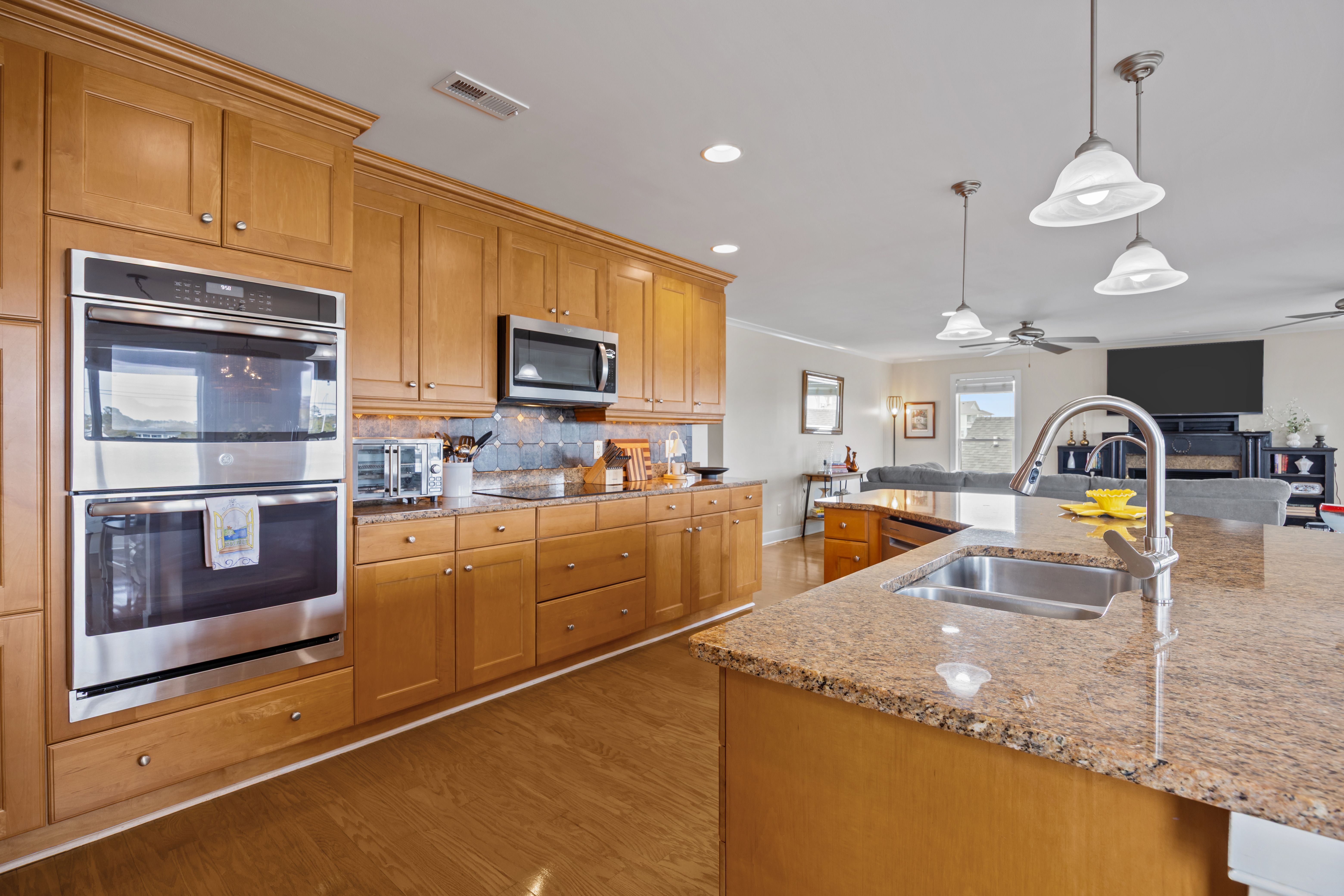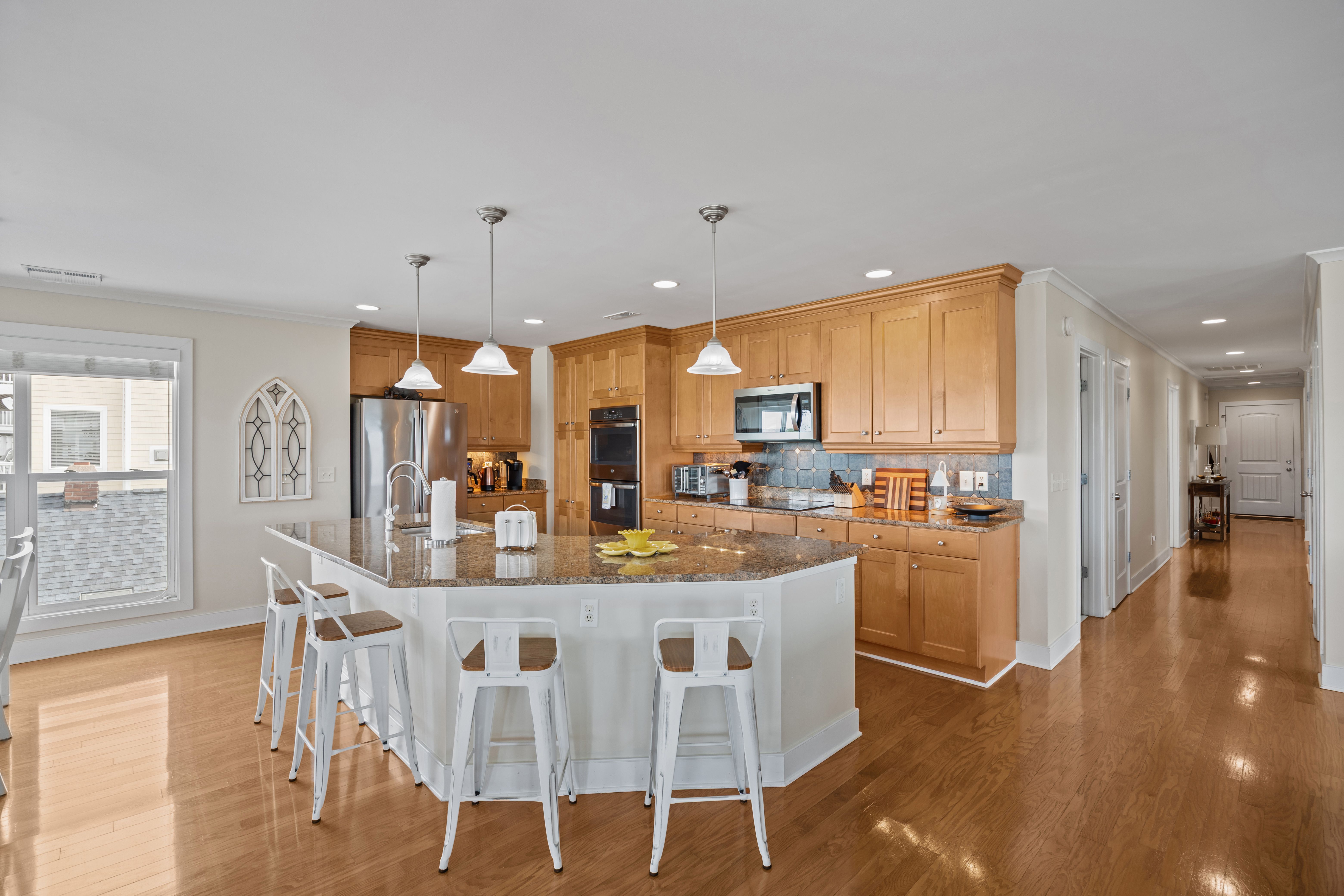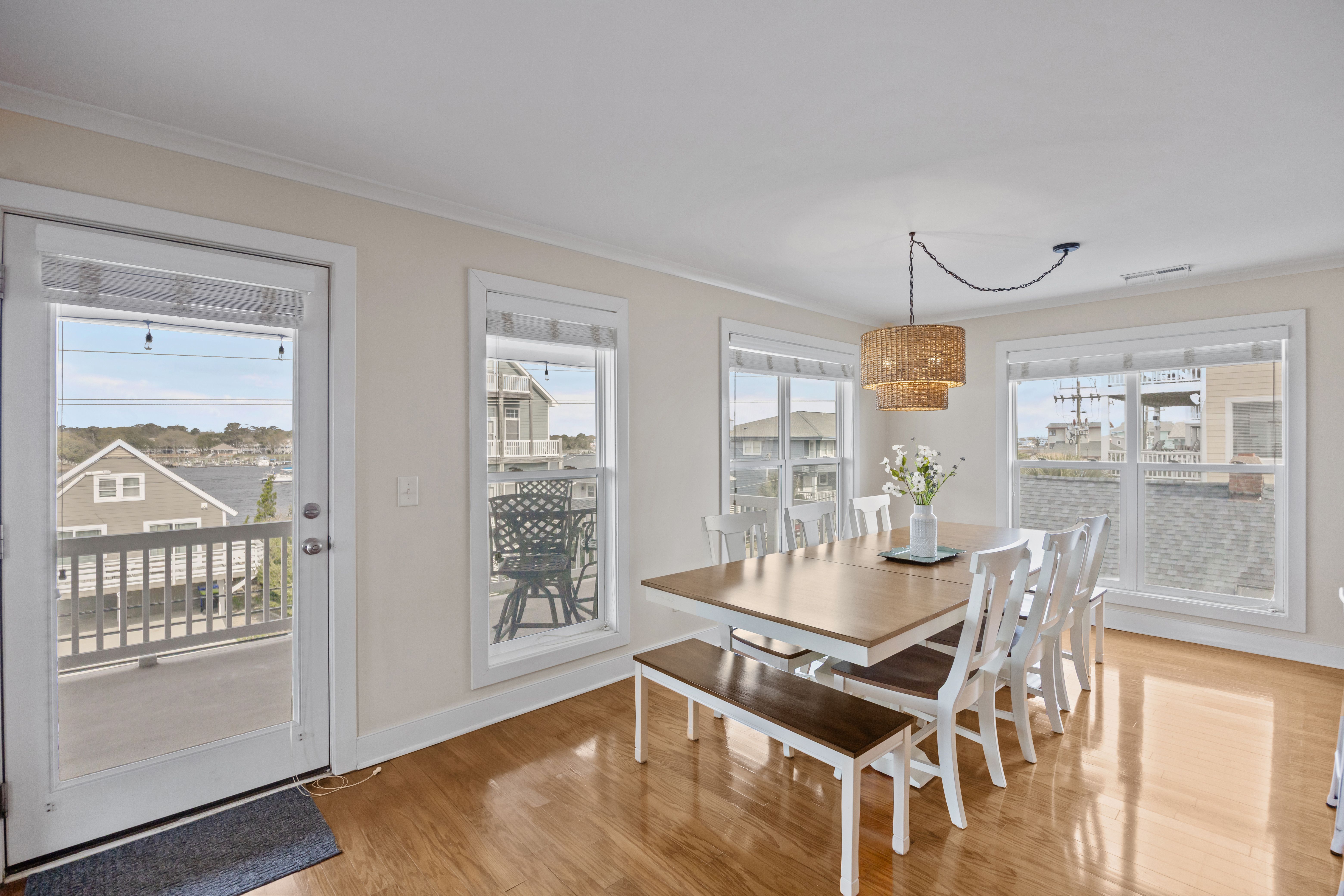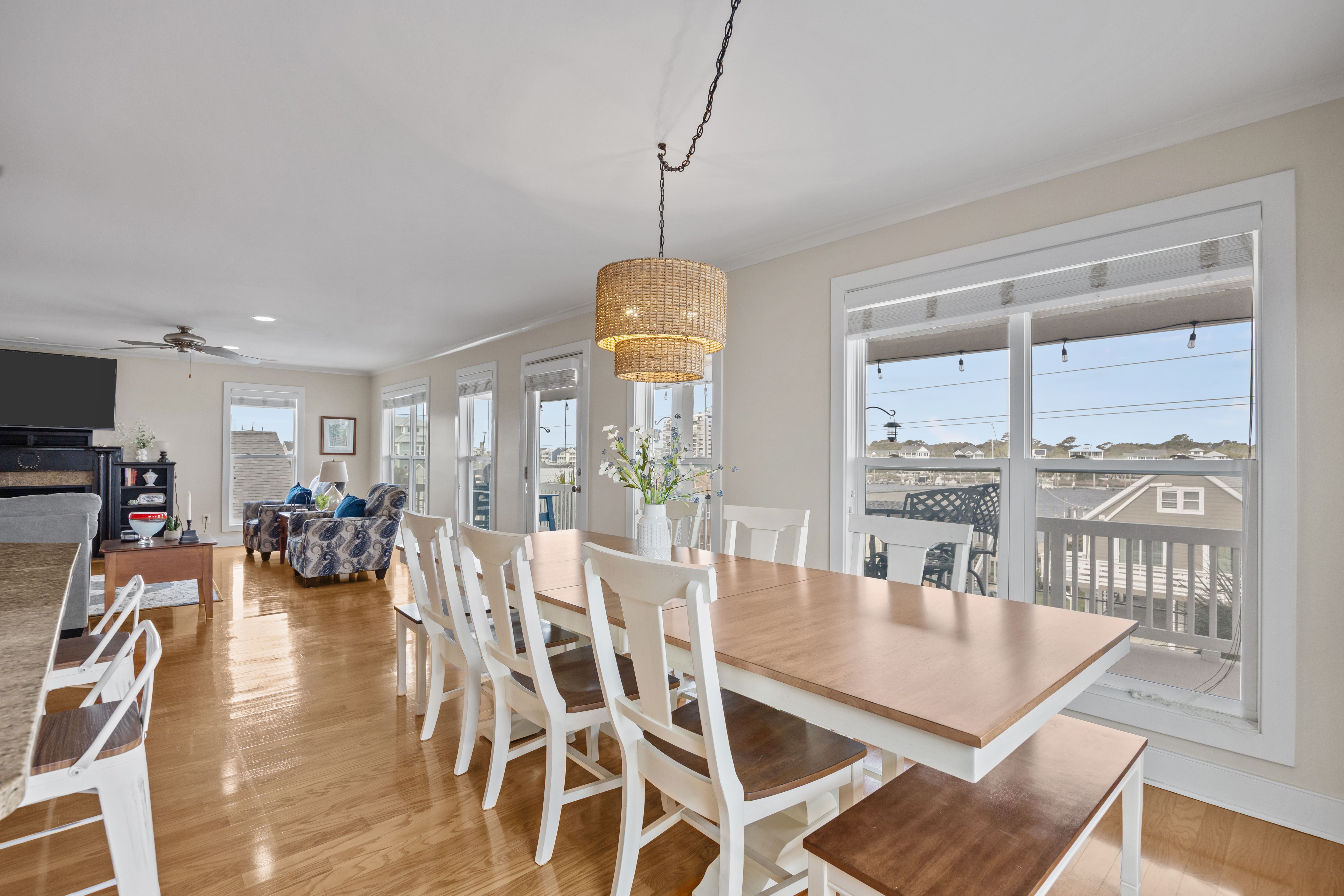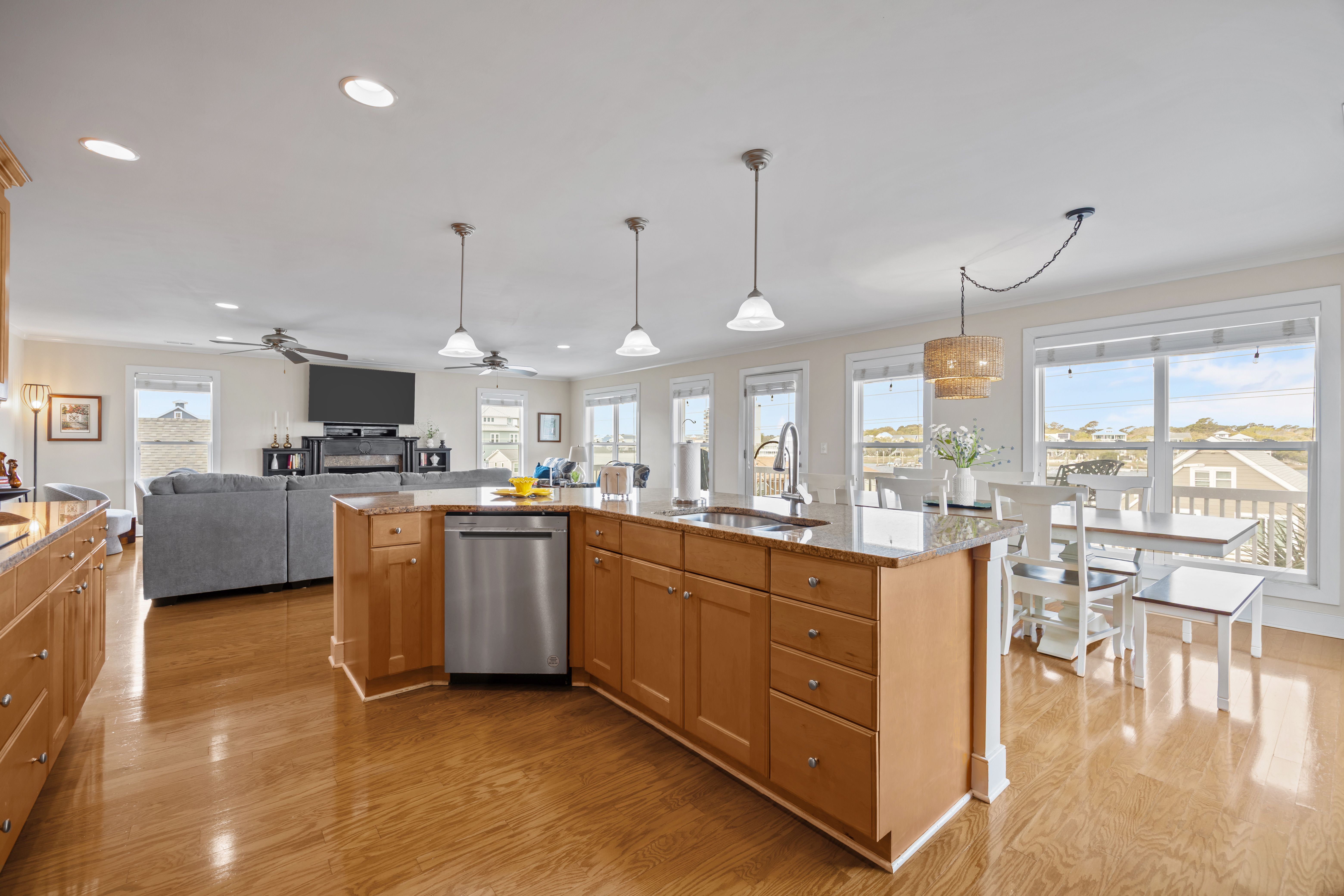 The bright dining area seats 10 guests, with 4 additional barstools at the kitchen counter — perfect for family dinners or morning coffee before heading to the beach. Step outside to a covered porch overlooking the sound, complete with a dining table and chairs for relaxed outdoor meals. From here, you can enjoy beautiful sound views and amazing sunsets each evening.