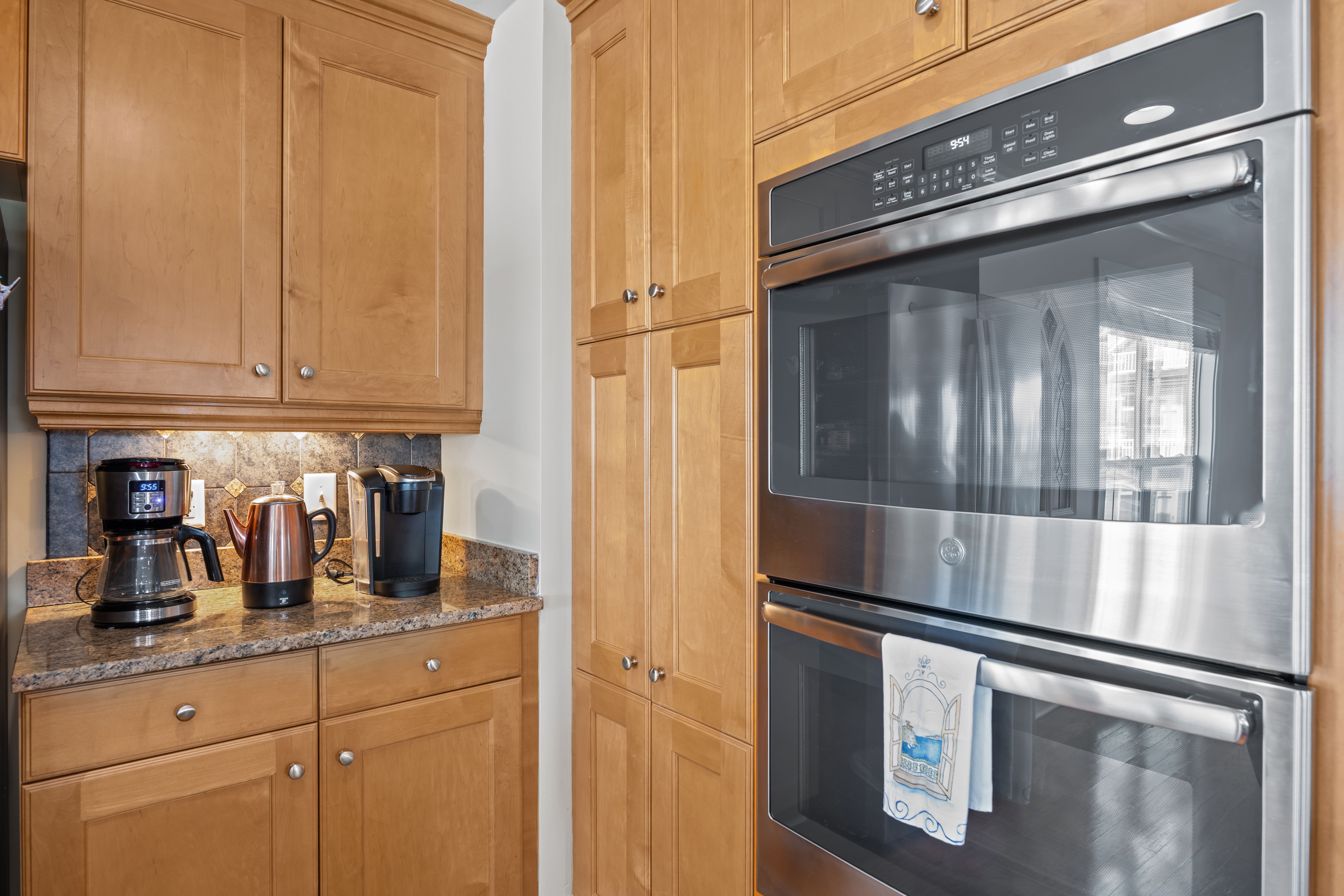 The fully stocked kitchen features double ovens, ample counter space, and all the cookware and essentials needed to prepare and enjoy meals together.