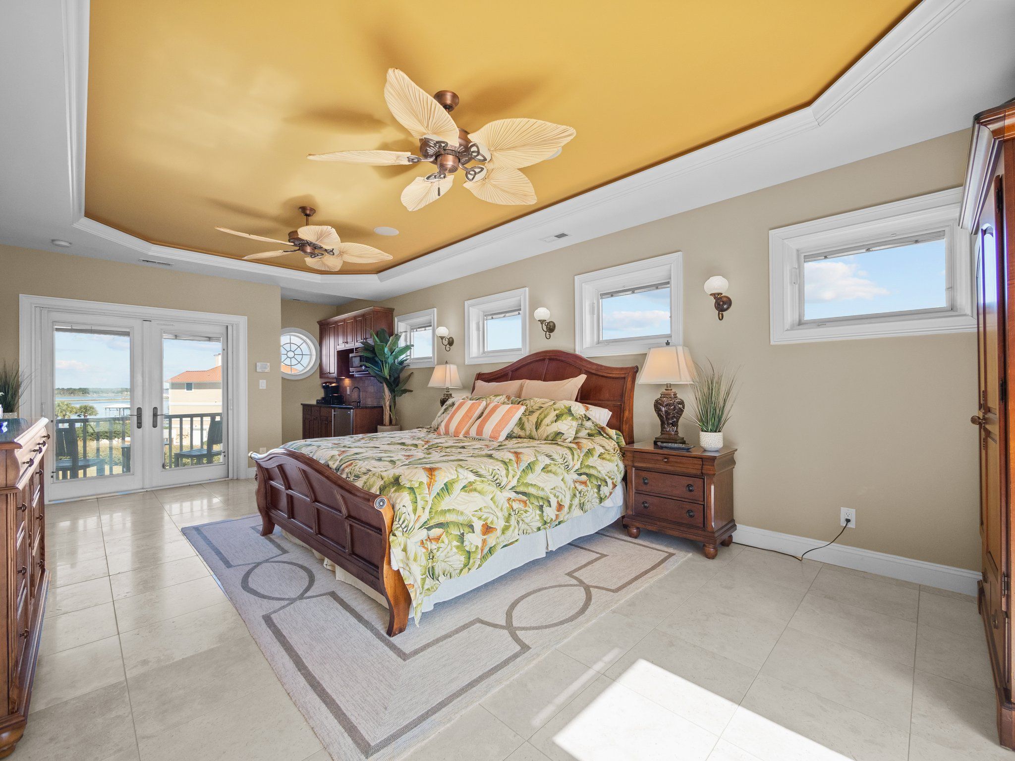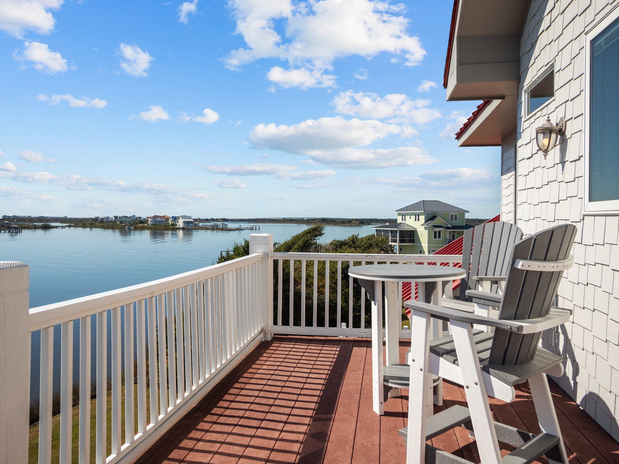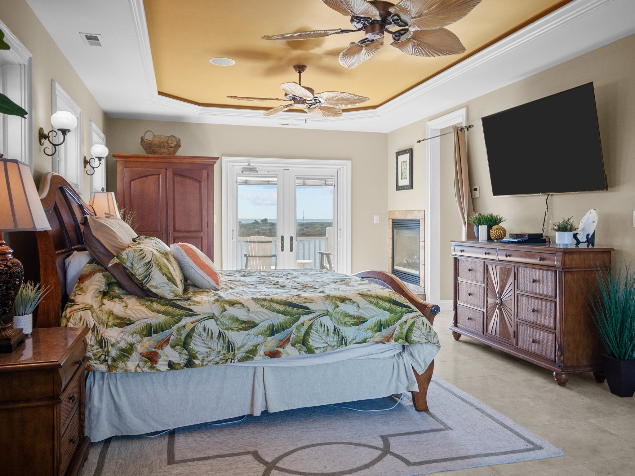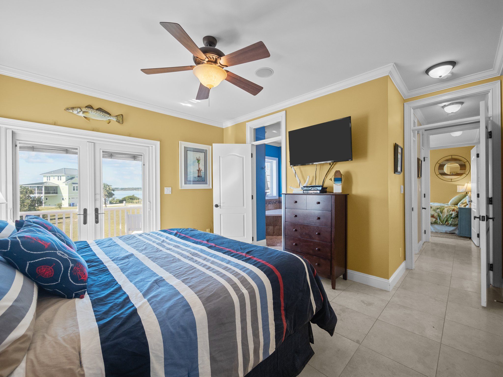 Proceed upstairs to the top floor to find an office area for those who may need to slip away to work from home with a view! A sound-facing bedroom features a queen-sized bed and hall bathroom access (new in 2025!). Down the hall (ocean-facing) is the expansive master suite which features a king-sized bed, a wet bar with a mini fridge, microwave, and Keurig, a separate bar area to the left, and an en suite bathroom with an oversized tub, dual vanities, and a stall shower. Additional features include a large flat-screen TV, and private deck access that overlooks the water.