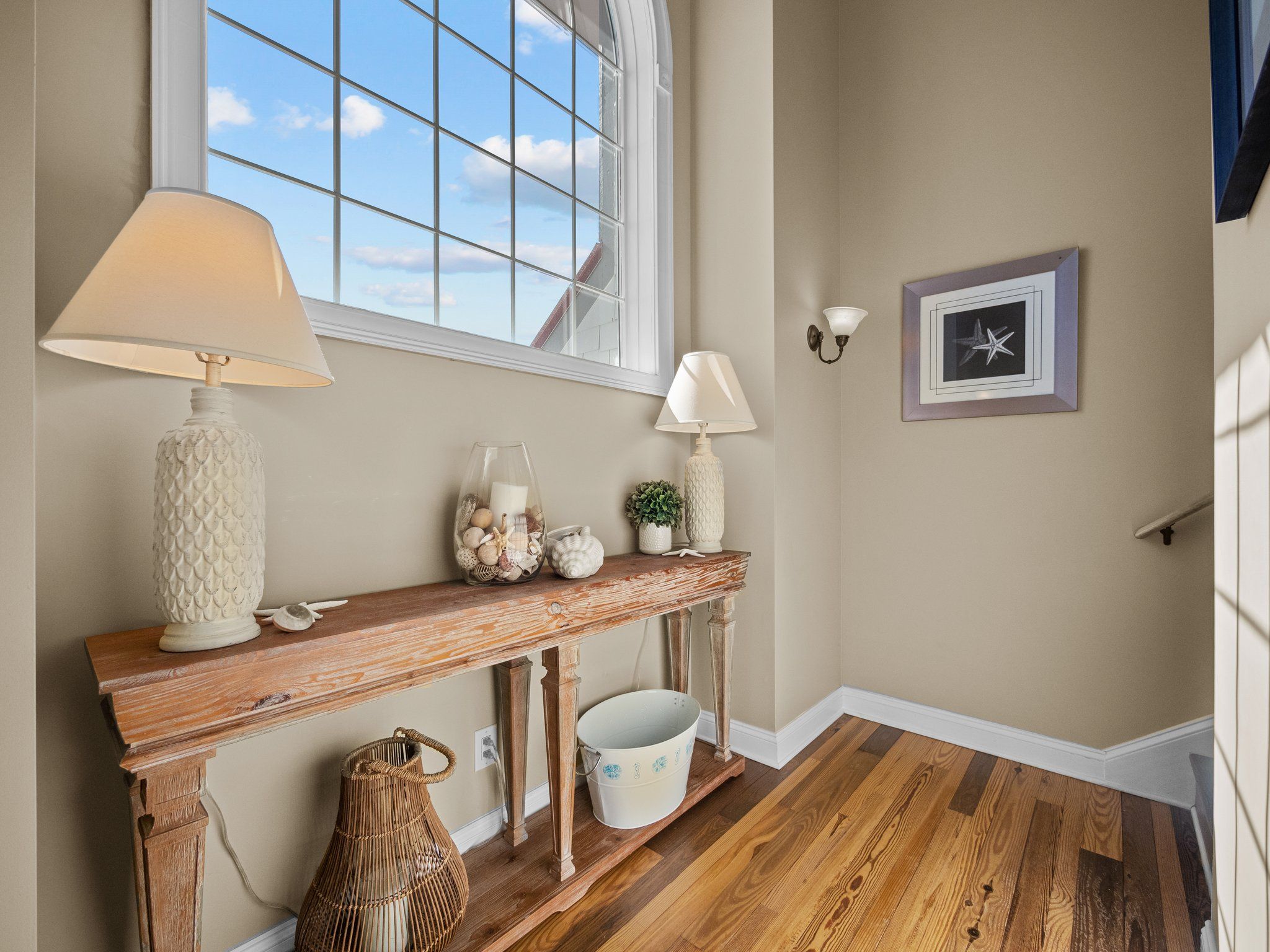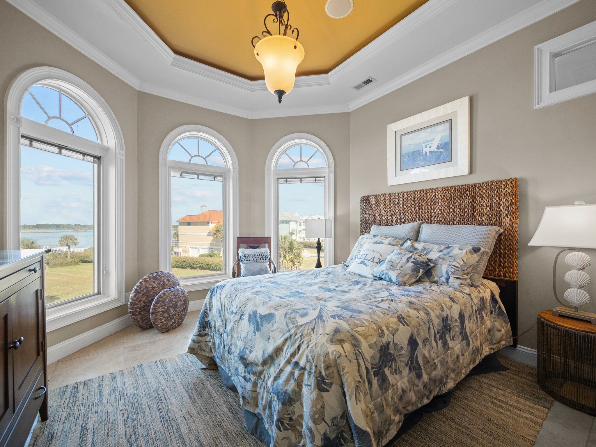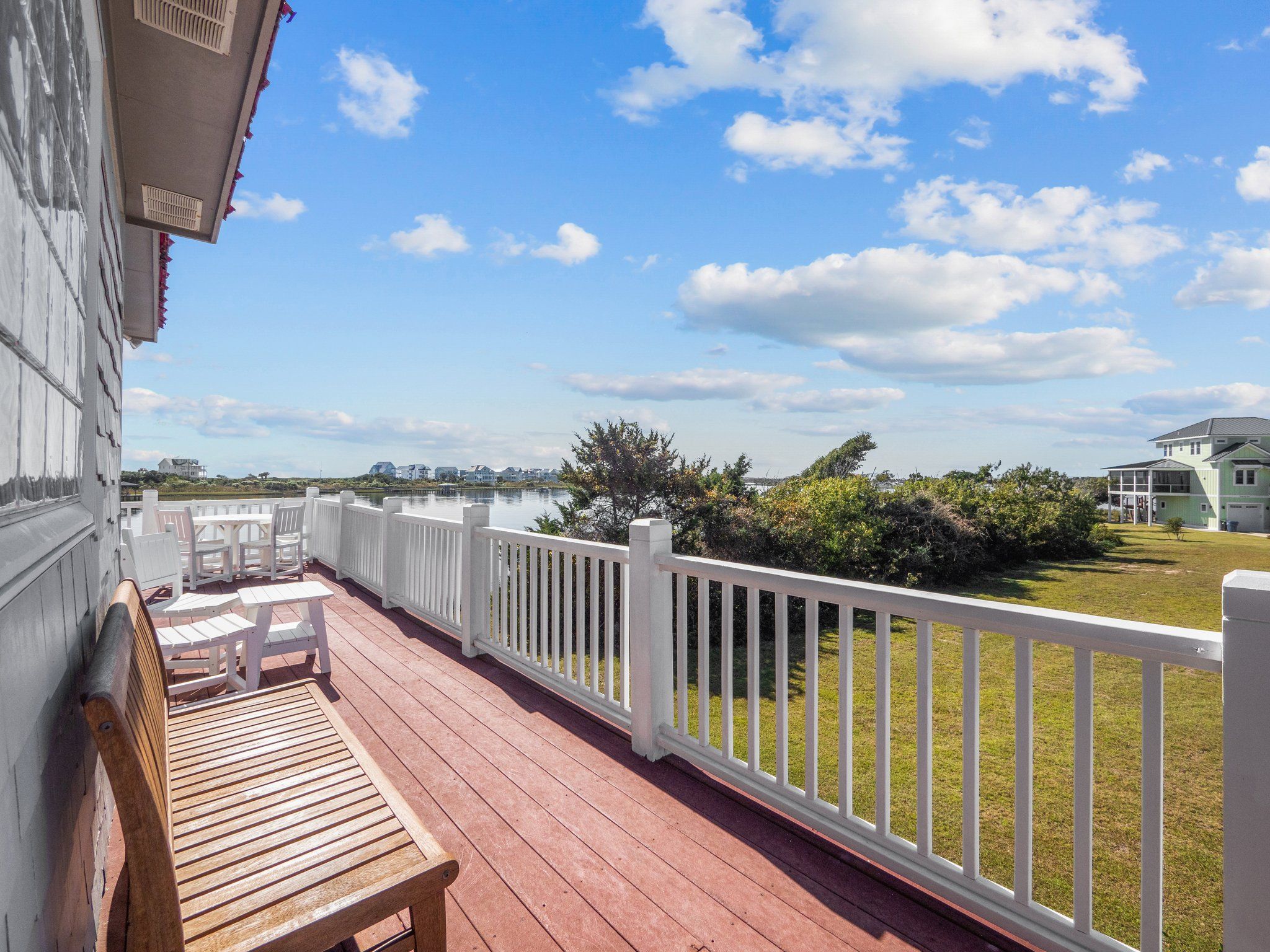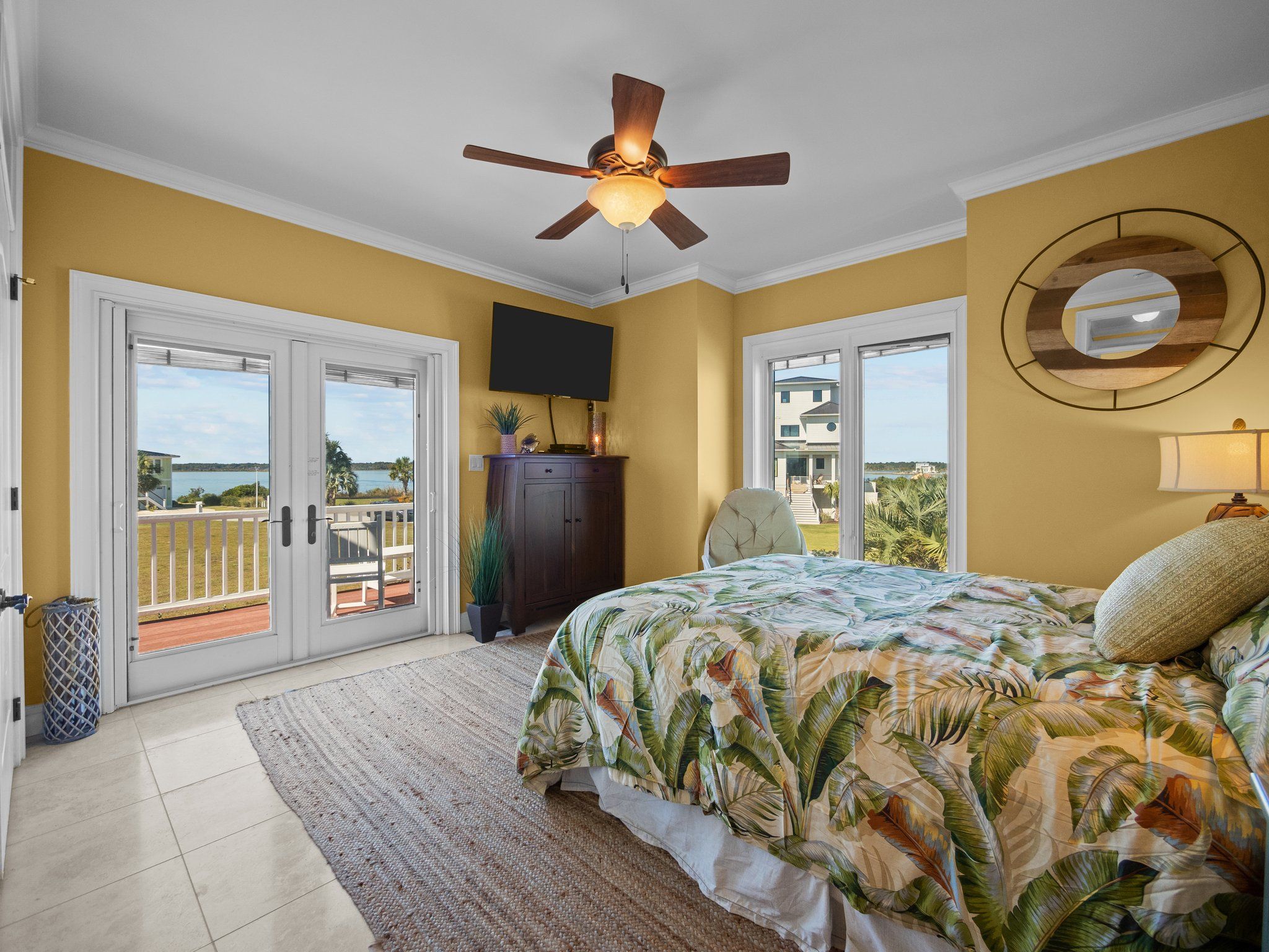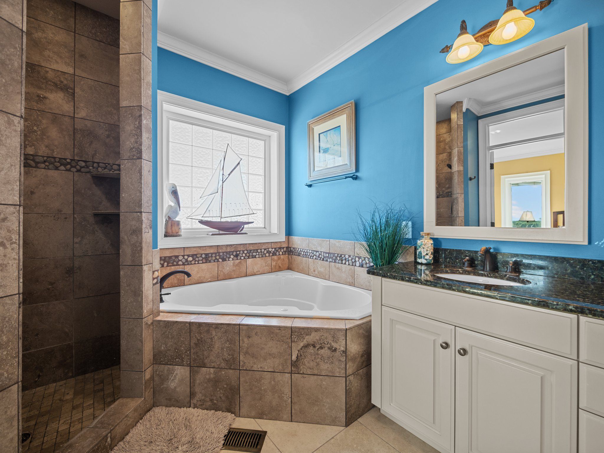 Proceed upstairs to the top floor to find an office area for those who may need to slip away to work from home with a view! A sound-facing bedroom features a queen-sized bed and hall bathroom access (new in 2025!). Down the hall (ocean-facing) is the expansive master suite which features a king-sized bed, a wet bar with a mini fridge, microwave, and Keurig, a separate bar area to the left, and an en suite bathroom with an oversized tub, dual vanities, and a stall shower. Additional features include a large flat-screen TV, and private deck access that overlooks the water.