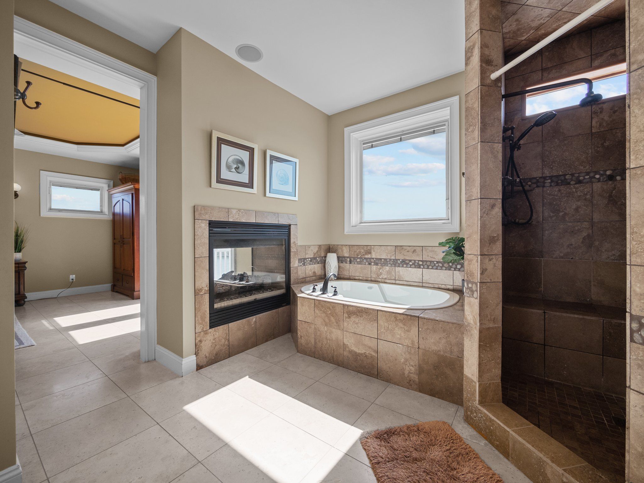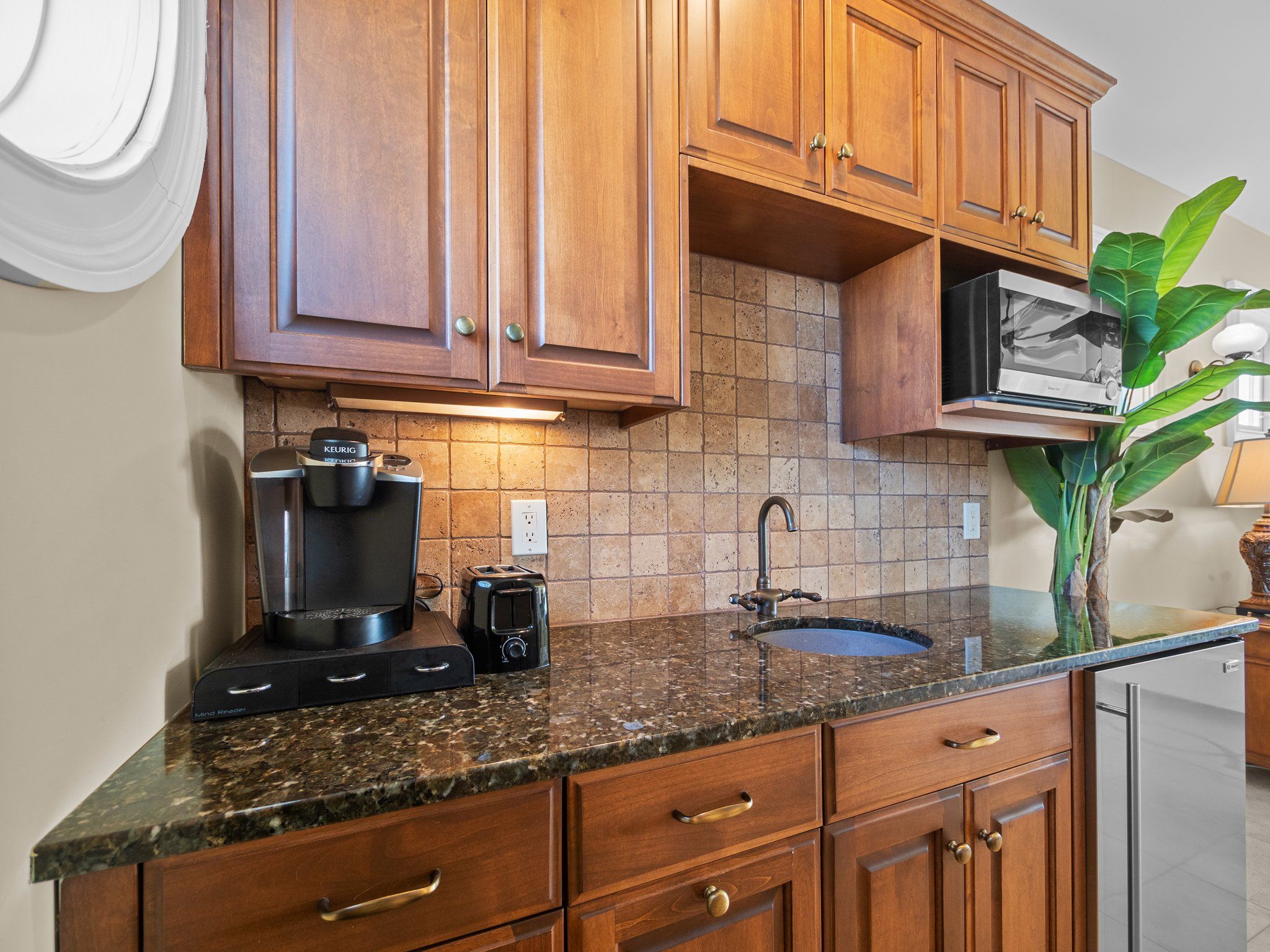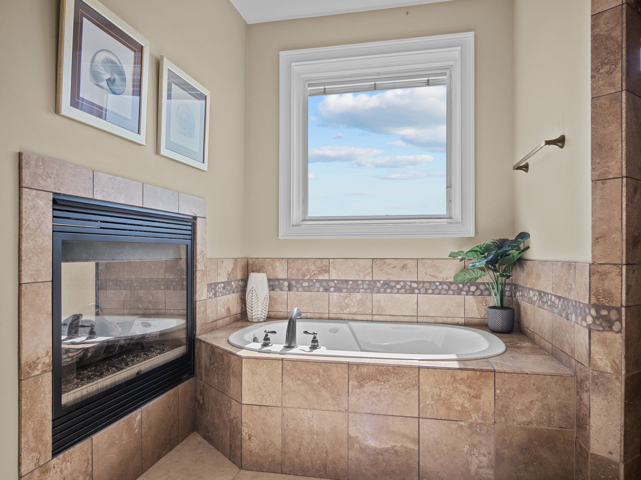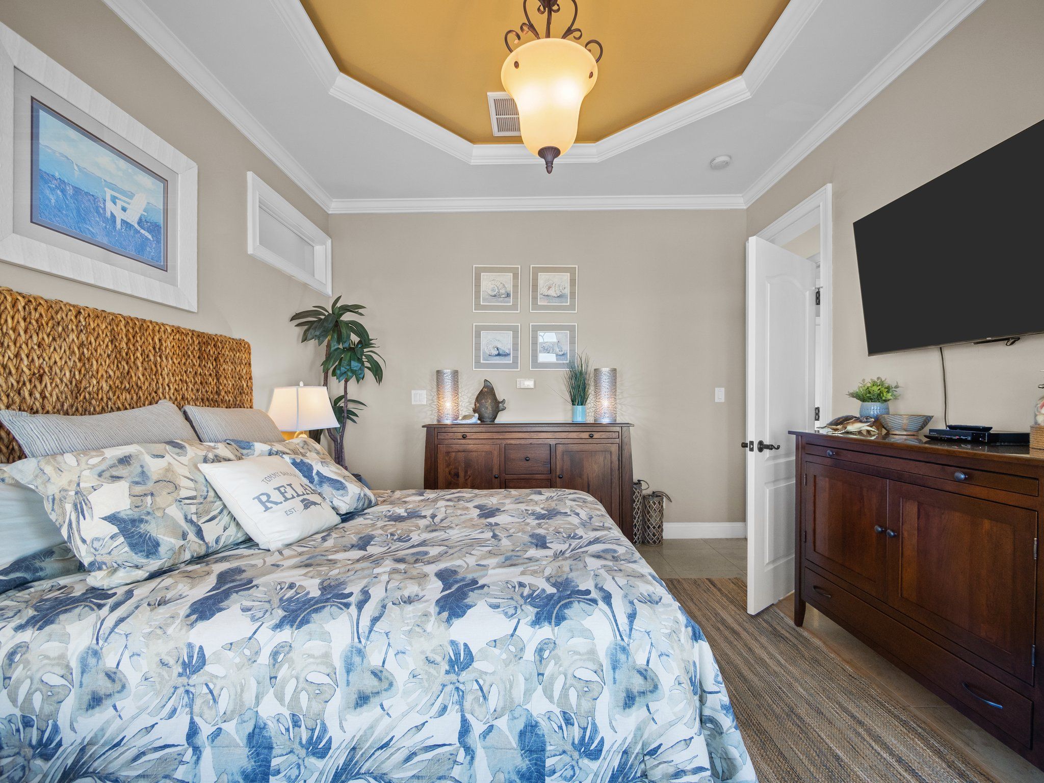 Proceed upstairs to the top floor to find an office area for those who may need to slip away to work from home with a view! A sound-facing bedroom features a queen-sized bed and hall bathroom access (new in 2025!). Down the hall (ocean-facing) is the expansive master suite which features a king-sized bed, a wet bar with a mini fridge, microwave, and Keurig, a separate bar area to the left, and an en suite bathroom with an oversized tub, dual vanities, and a stall shower. Additional features include a large flat-screen TV, and private deck access that overlooks the water.