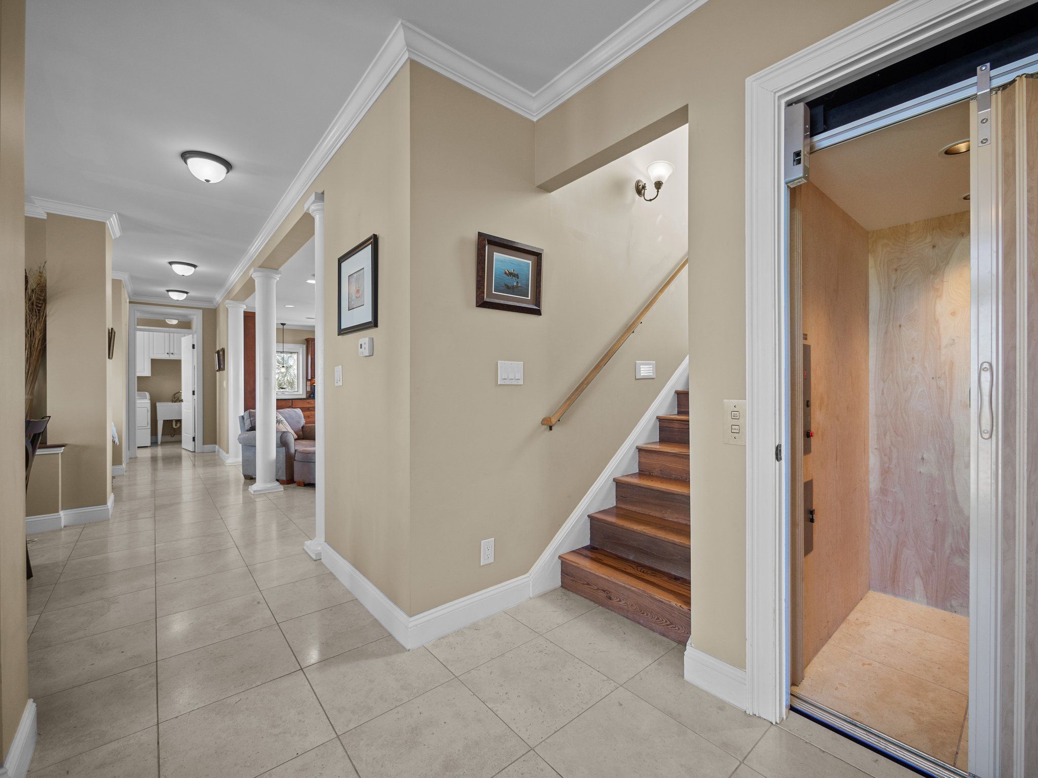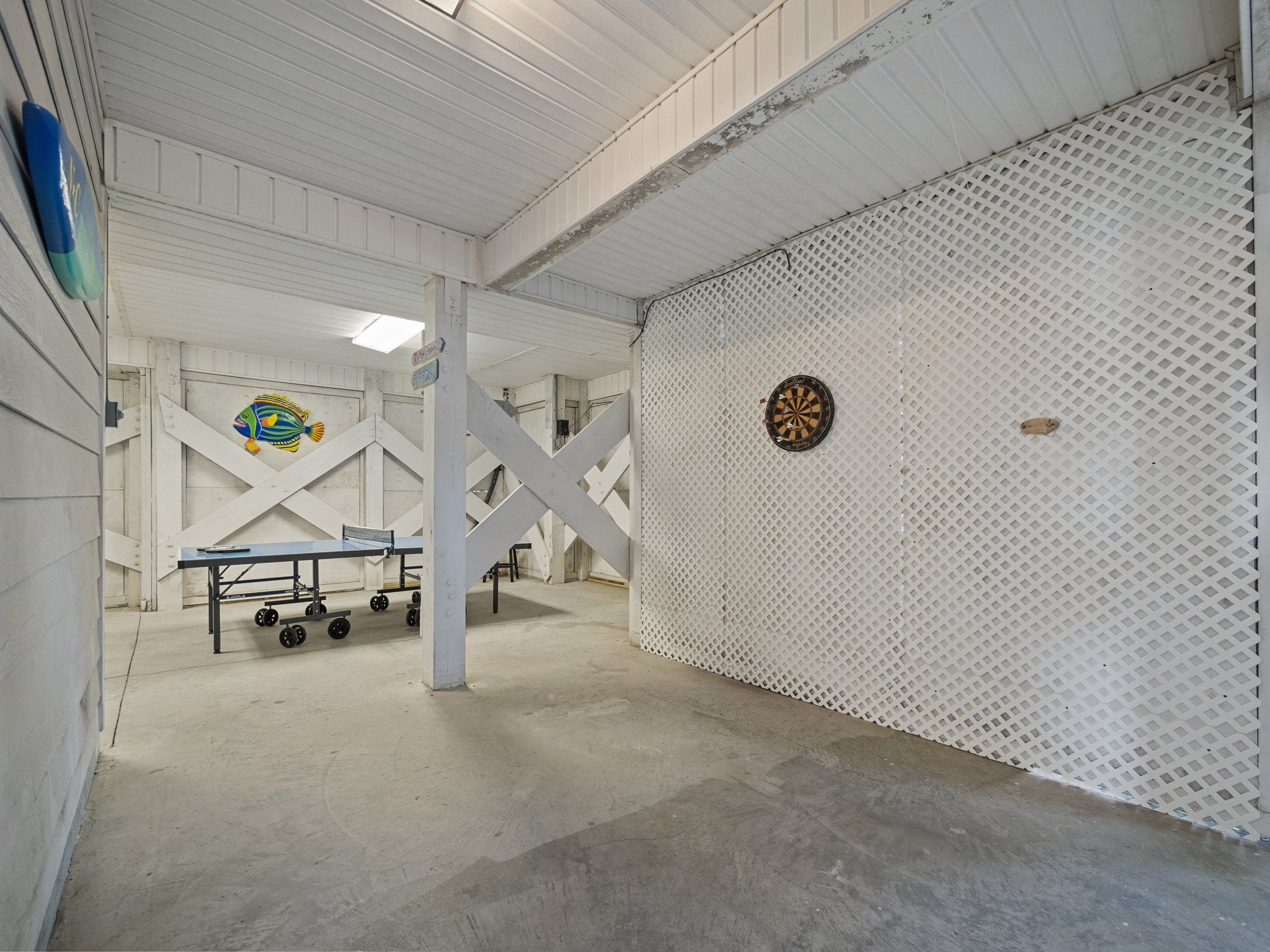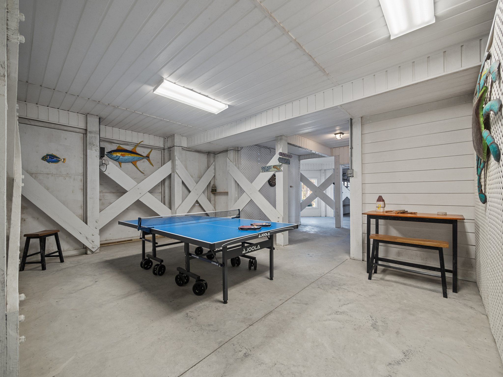 This property has a deep two-car garage. Additional parking is available in the driveway for four. A game room with a ping pong table and darts can be found in the garage. The private elevator can be accessed through the ground level and stops at all floors. A gas grill and an outdoor shower are also available on the back patio.