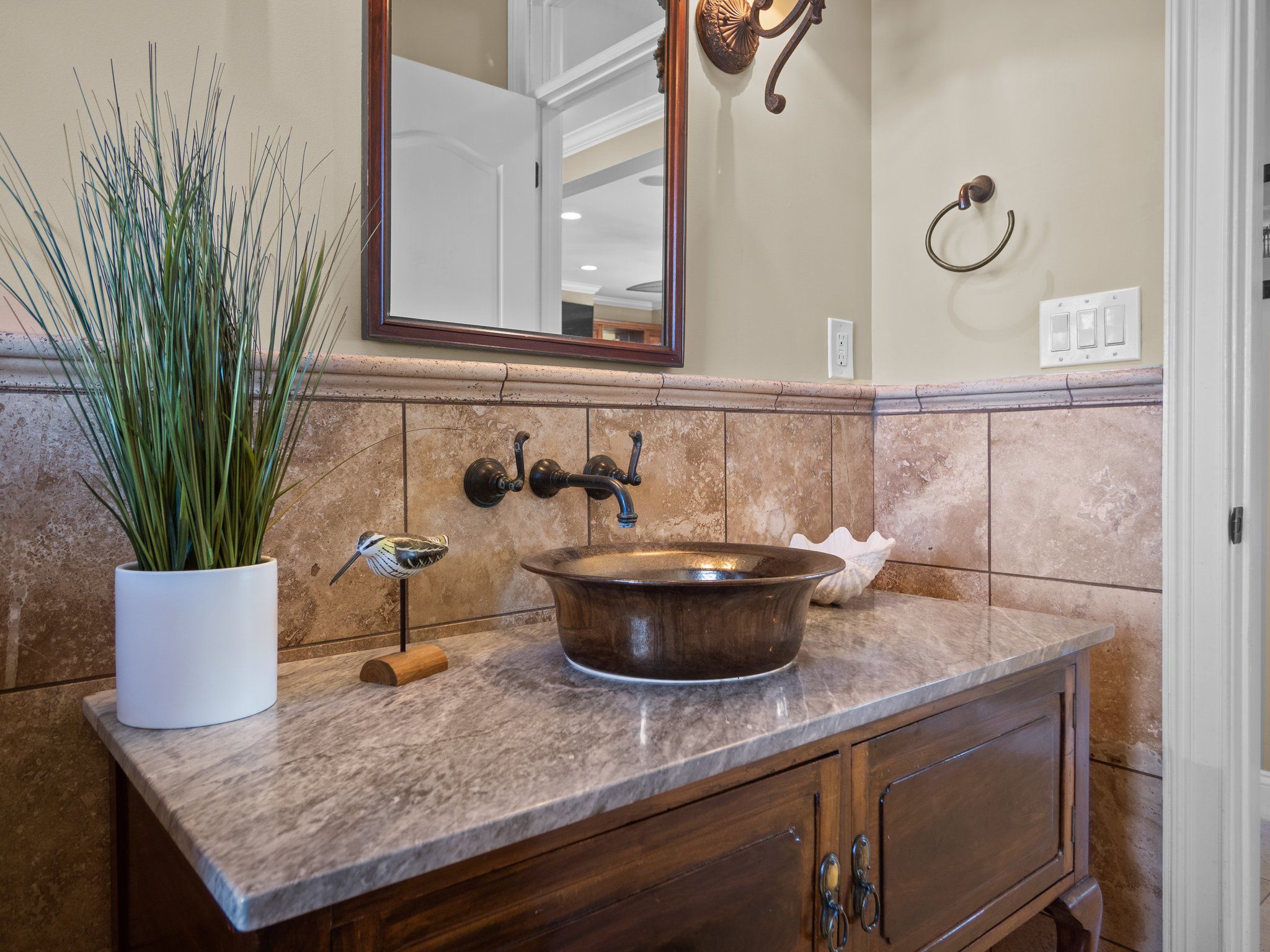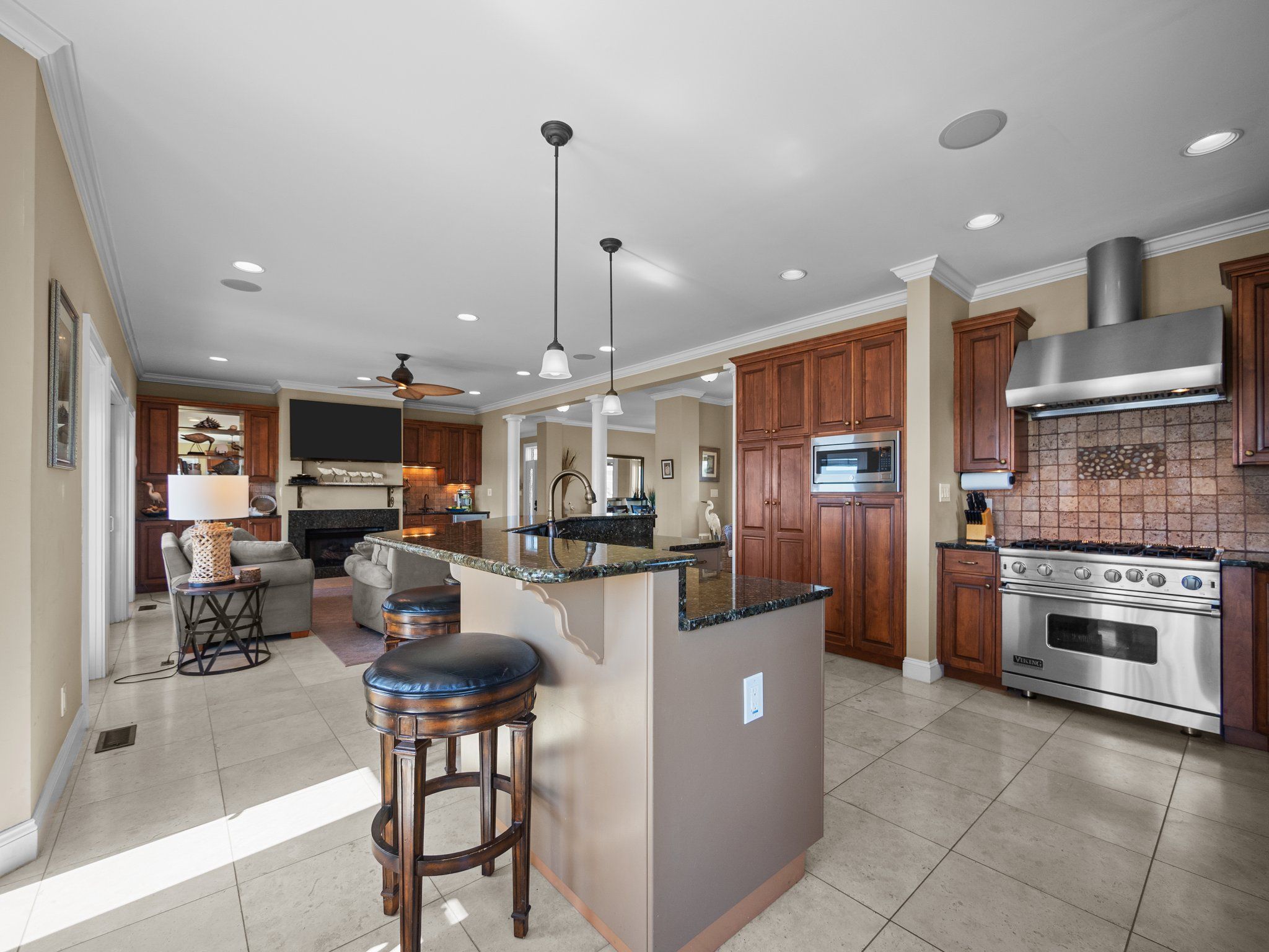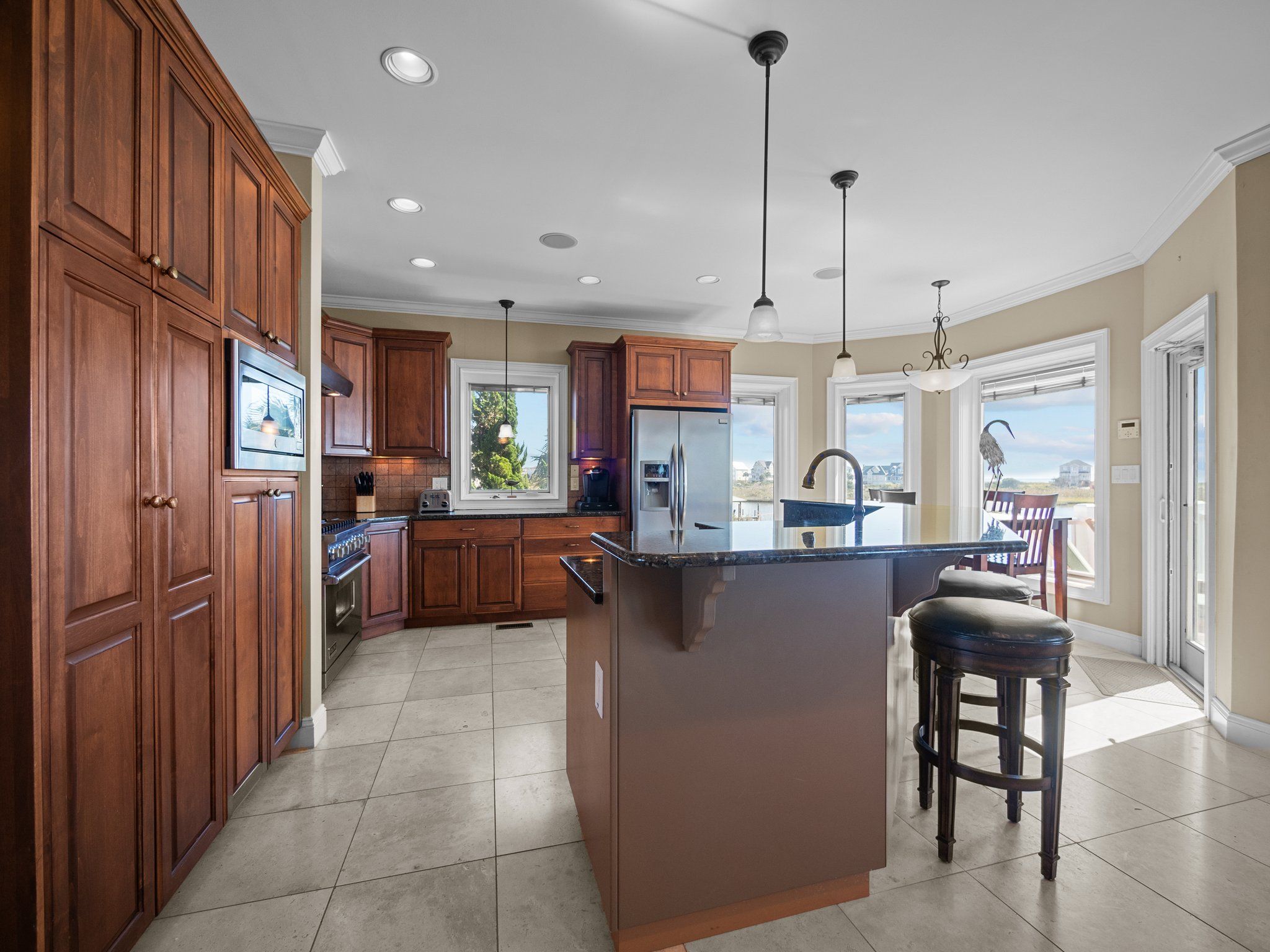 Guests will enter through the front door into the main living area. To the left is the living room, dining room, and kitchen where a wall of windows showcase incredible water views on all sides. The spacious living room has a queen sleeper sofa and plenty of seating, and deck access that overlooks the private dock, with incredible ocean views in the background. An additional living room seating area for two is nearby, this area opens up to a second deck on the opposite side of the house, where sound views are prominent. A large wall-mounted Smart TV is available in the living room, as well as a wet bar with a mini fridge. Board games for family fun can be found beside the wet bar. The well-appointed kitchen features a six-burner Viking range, granite countertops, and all the necessities needed to prepare meals and snacks throughout your stay. There is barstool seating for three and seating for four at the high-top nearby. There is seating for 10 at the dining table. Two of the four bedrooms are located on the main floor, one with a king-sized bed and the other with a queen-sized bed, and deck access from both. A full bathroom with an oversized tub, dual vanities, and a stall shower is shared between the two bedrooms.