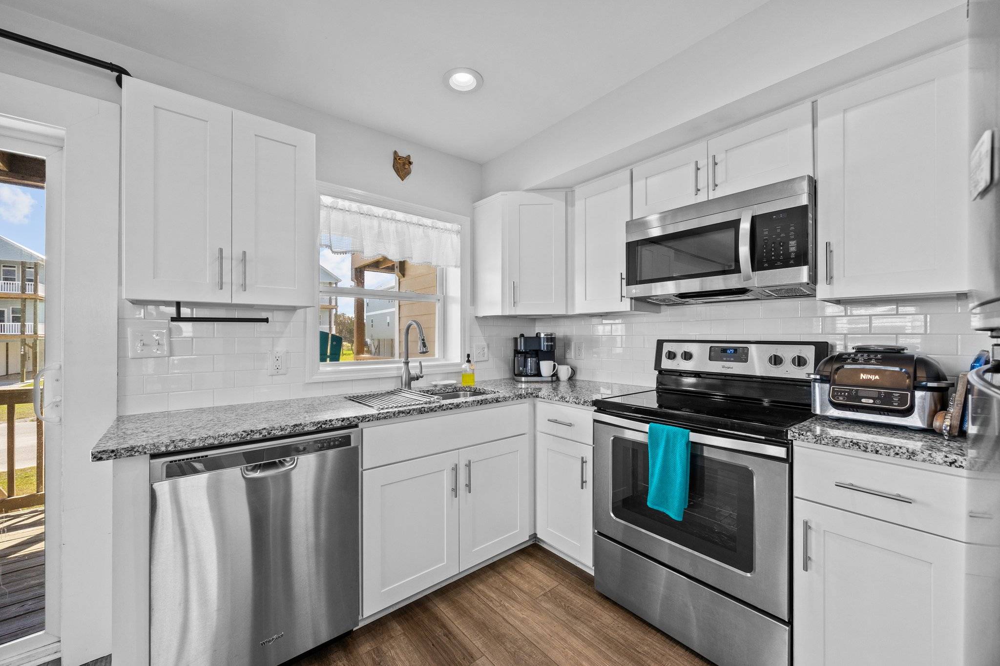 Inside, the open-concept living area is a cozy haven for relaxing after a day on the shore—whether you're playing games, watching a movie, or simply enjoying time with loved ones. The modern kitchen features sleek stainless steel appliances and ample counter space, while the dining table comfortably seats six. A full bathroom is conveniently located downstairs.