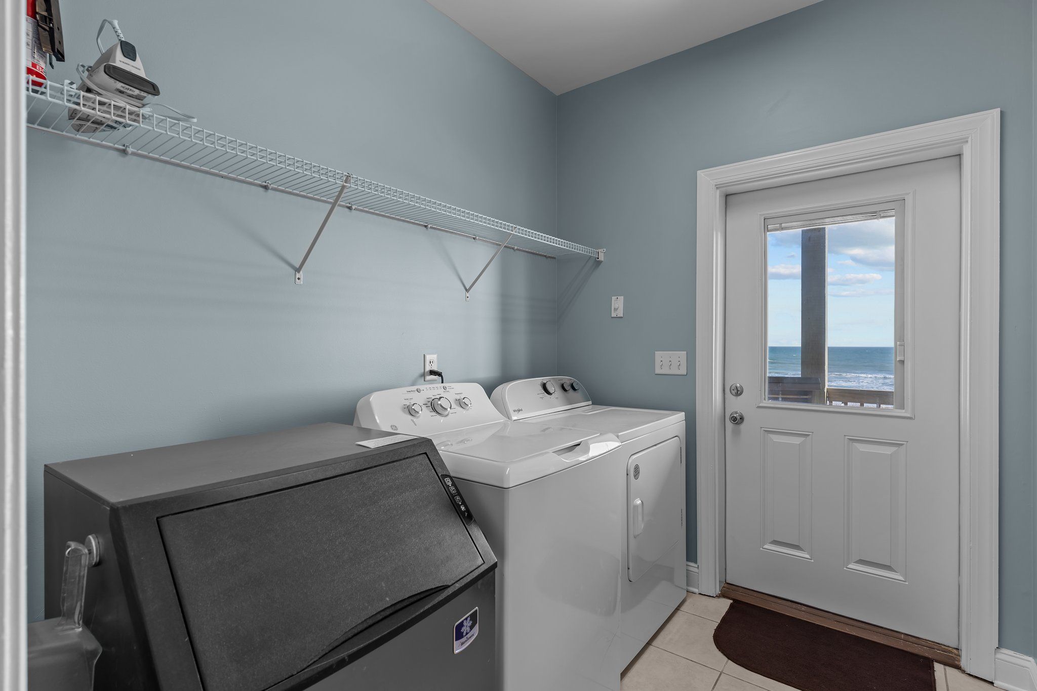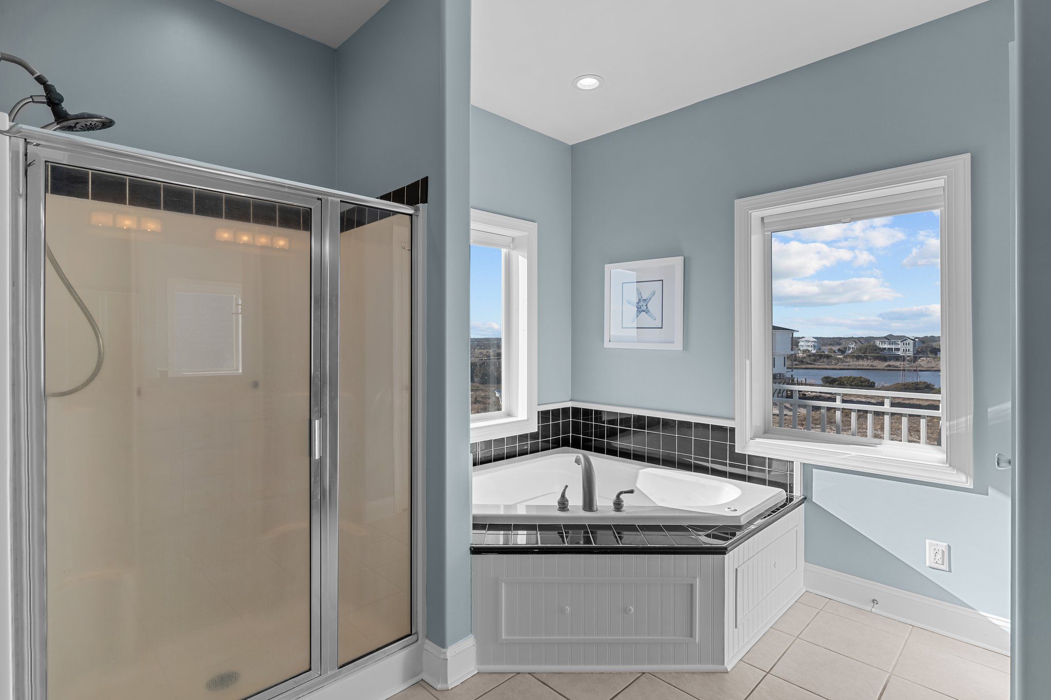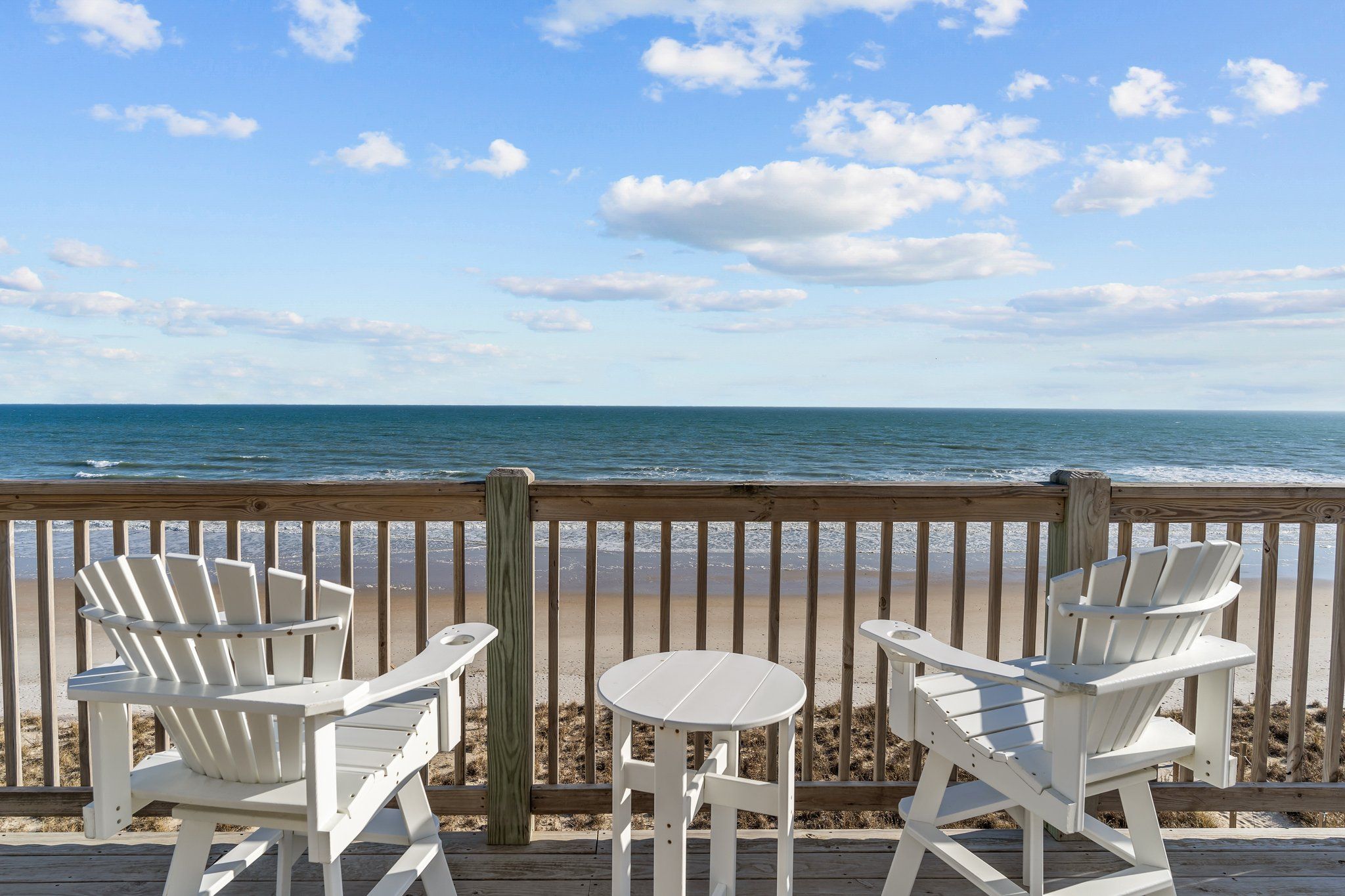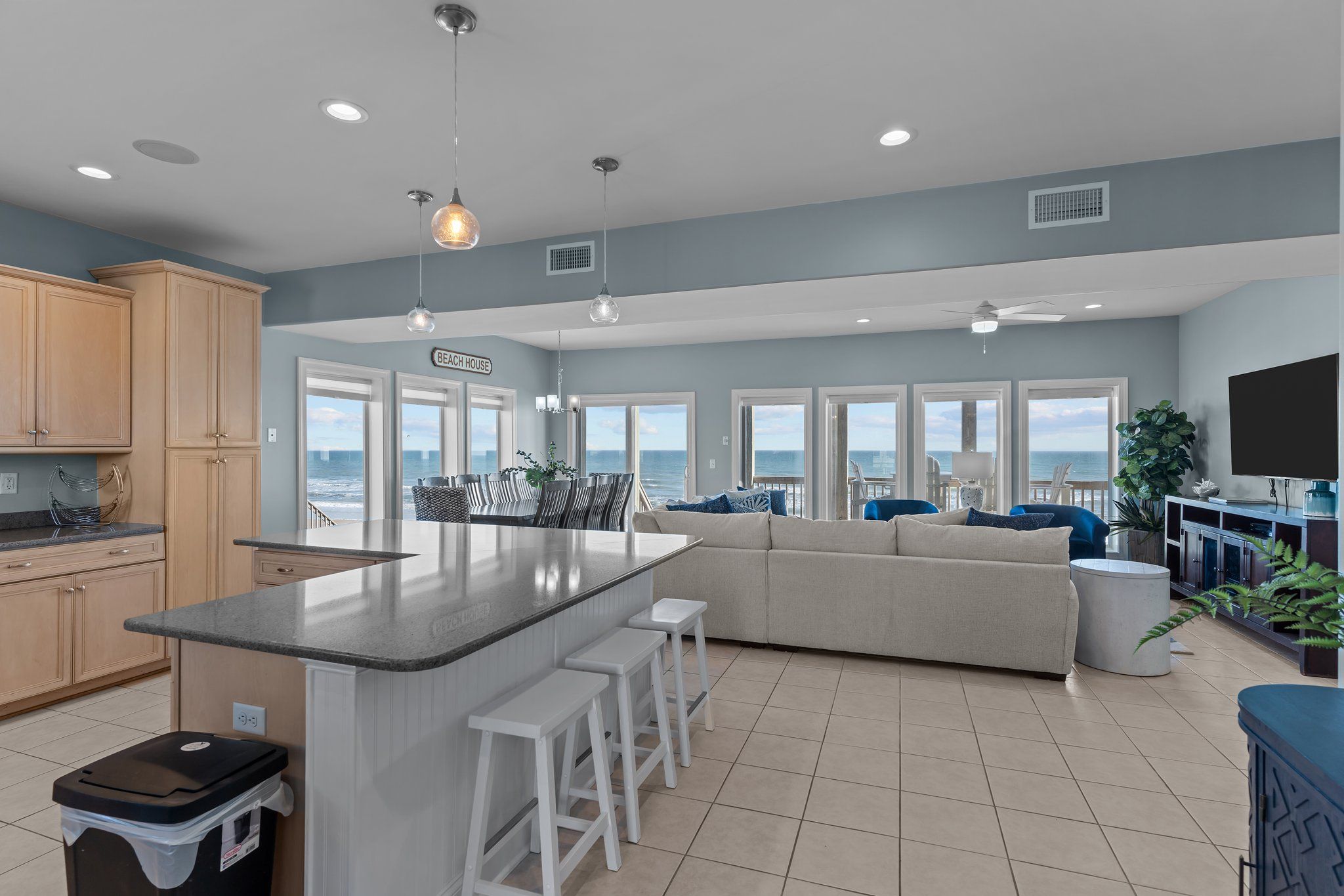 Both the living and dining areas provide direct access to the spacious oceanfront deck, where additional comfortable seating awaits, perfect for taking in the stunning ocean views. The living room is furnished with two sofas (one of which is a queen sleeper), along with cozy chairs, all thoughtfully arranged to ensure comfort and relaxation as you spend time with loved ones. A large flat-screen HD TV is also available for your entertainment. For added convenience, there is a half bath next to this living space, as well as a deck on the sound side.