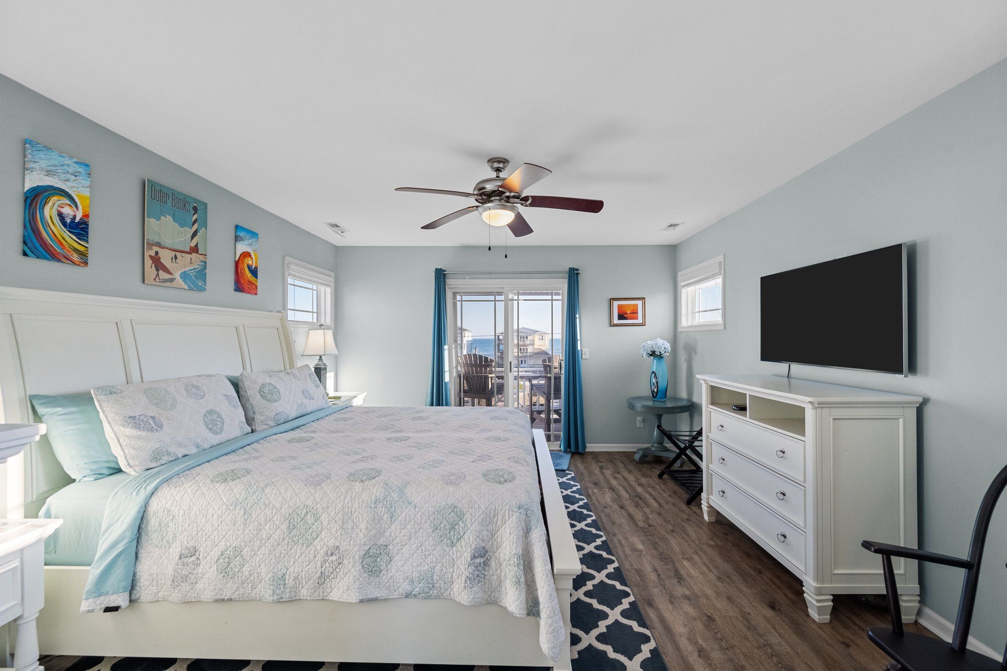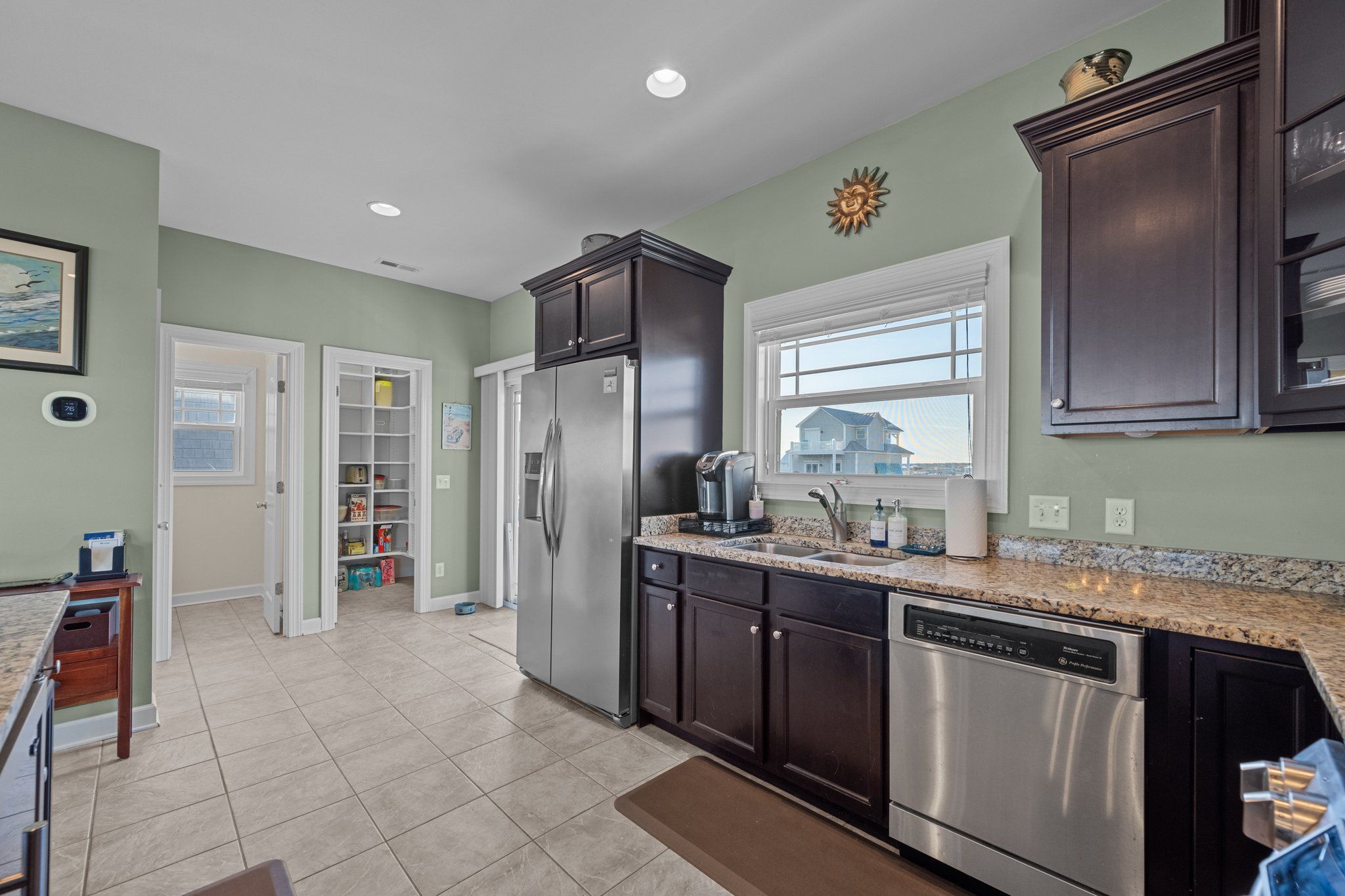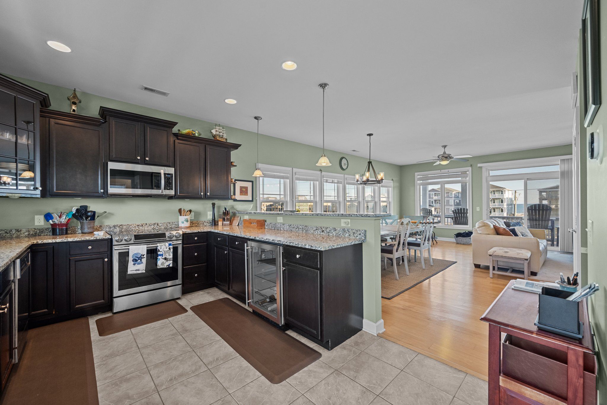 This thoughtfully designed retreat features a master suite with a king-sized bed, a large en-suite bathroom with a jacuzzi tub and an additional seating area with access to a private ocean-view deck. There are three additional bedrooms, two with queen-sized beds and deck access, and one with a twin over twin bunk bed plus twin trundle sleeping a total of 3. The reverse floor plan maximizes panoramic ocean views from the main living area, where floor-to-ceiling windows flood the space with natural light. The well-appointed kitchen boasts granite countertops, a wine refrigerator, ample cabinet space, and a pantry—perfect for preparing meals after a day at the beach.