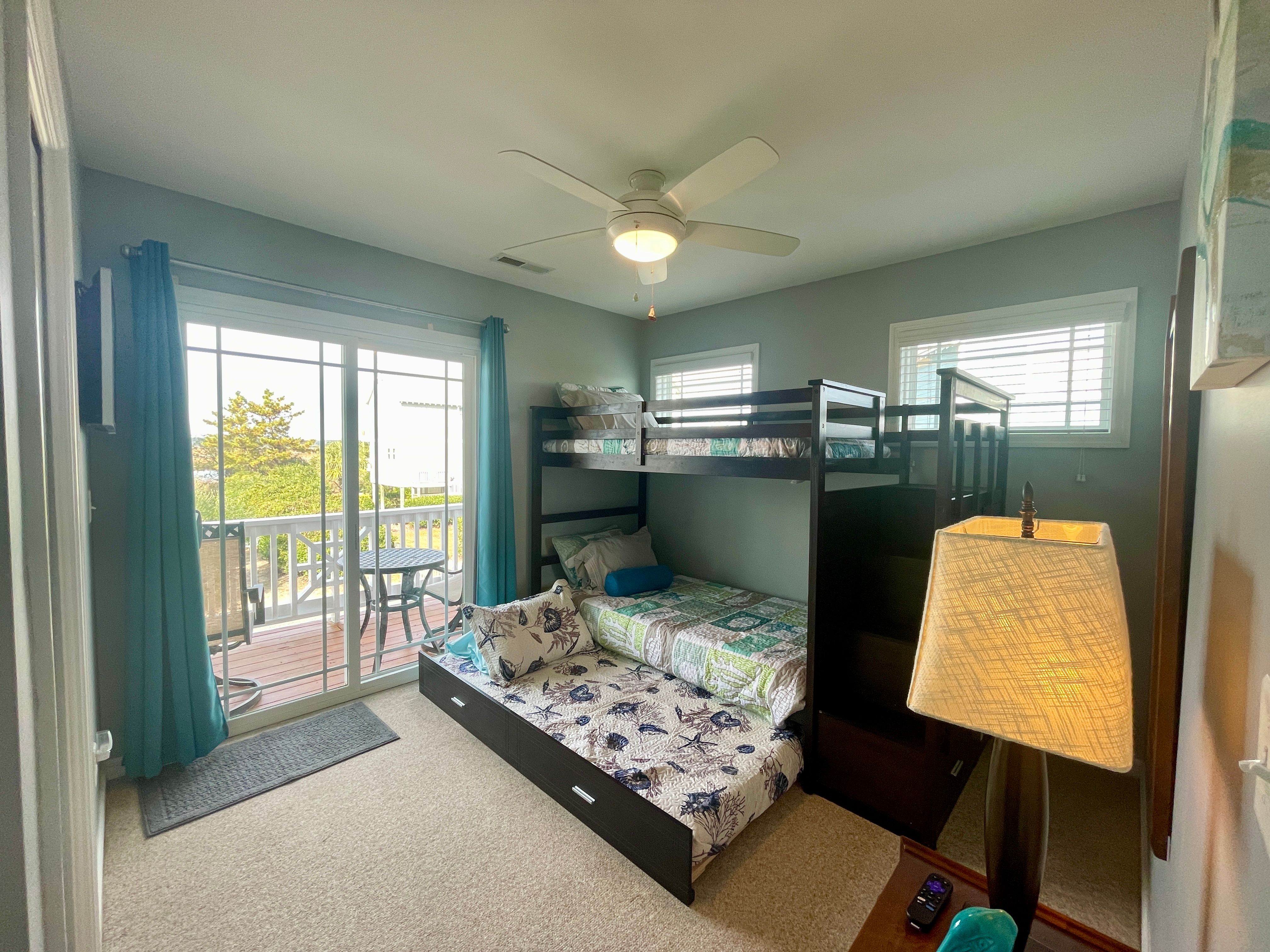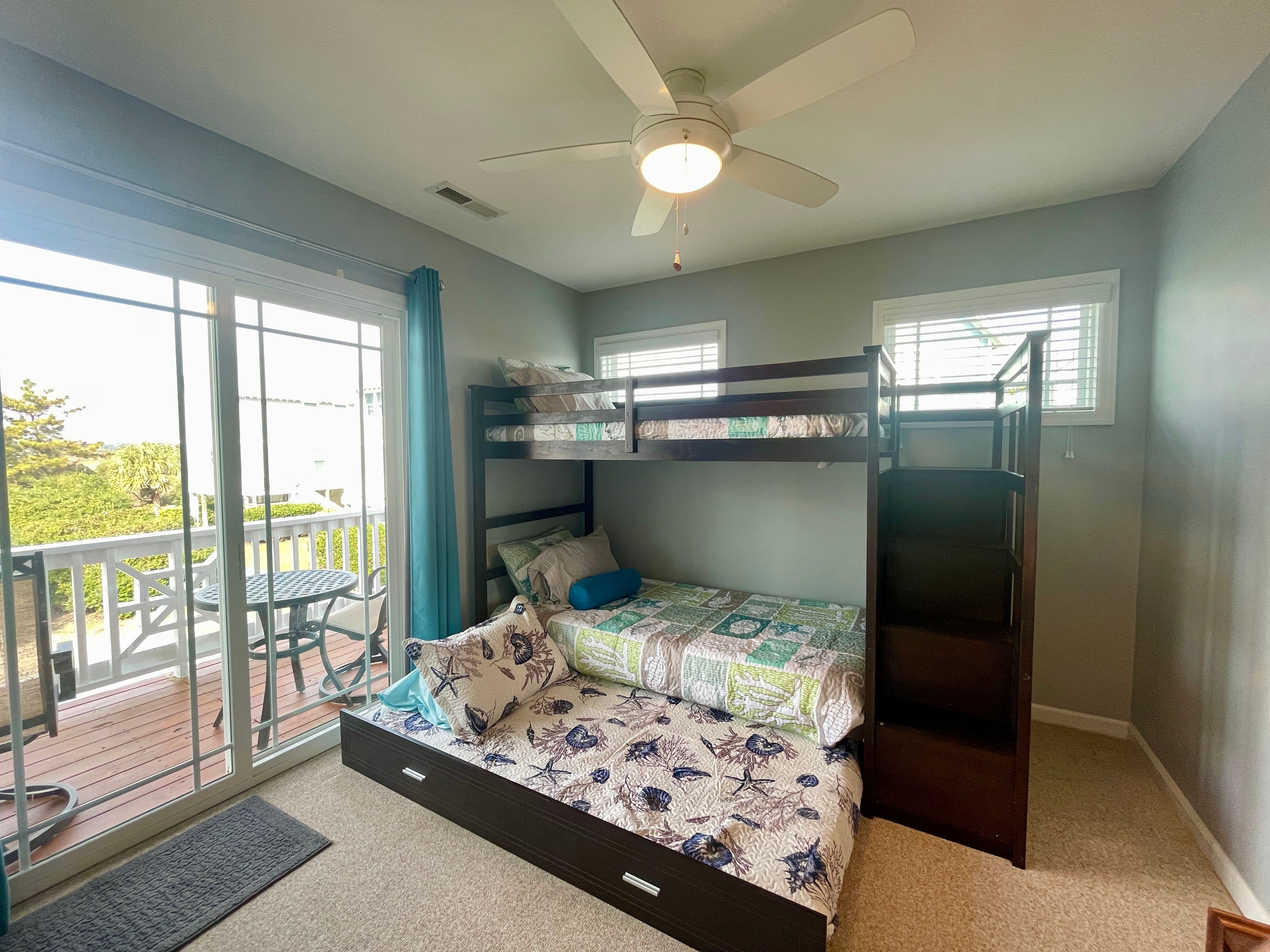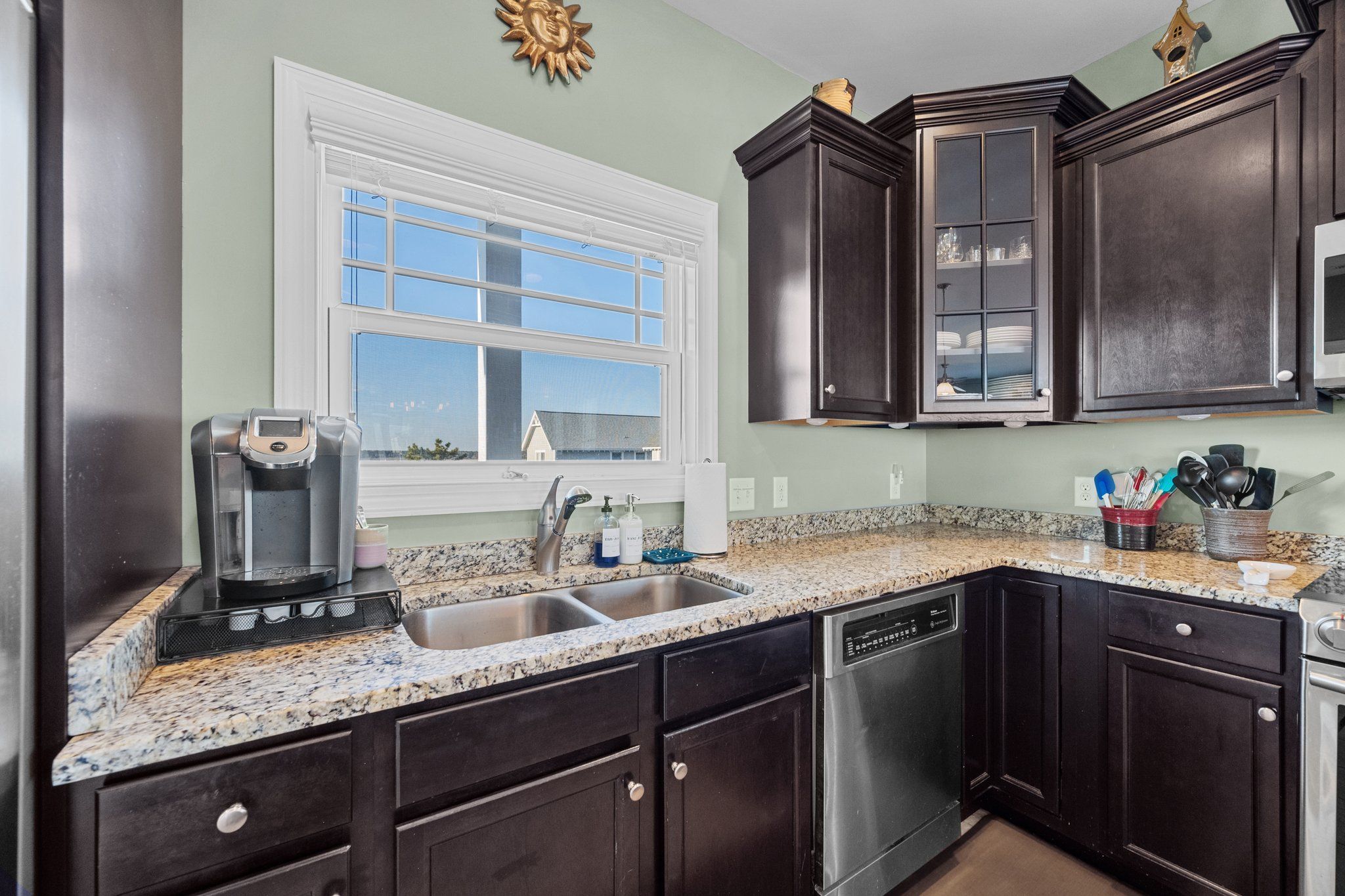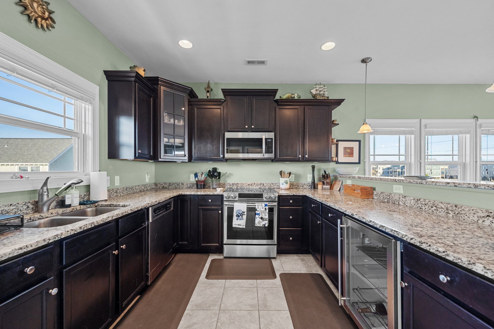 This thoughtfully designed retreat features a master suite with a king-sized bed, a large en-suite bathroom with a jacuzzi tub and an additional seating area with access to a private ocean-view deck. There are three additional bedrooms, two with queen-sized beds and deck access, and one with a twin over twin bunk bed plus twin trundle sleeping a total of 3. The reverse floor plan maximizes panoramic ocean views from the main living area, where floor-to-ceiling windows flood the space with natural light. The well-appointed kitchen boasts granite countertops, a wine refrigerator, ample cabinet space, and a pantry—perfect for preparing meals after a day at the beach.