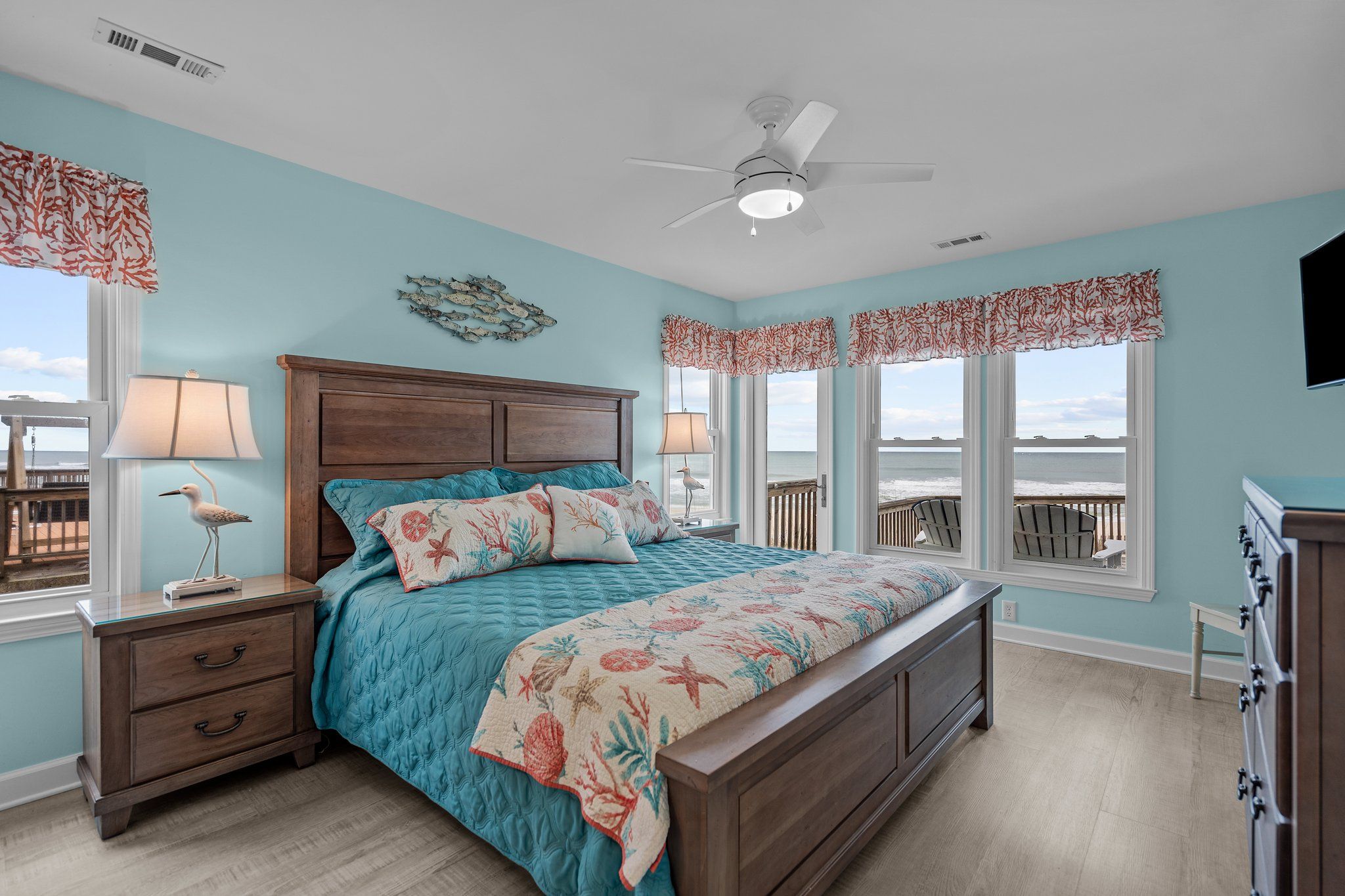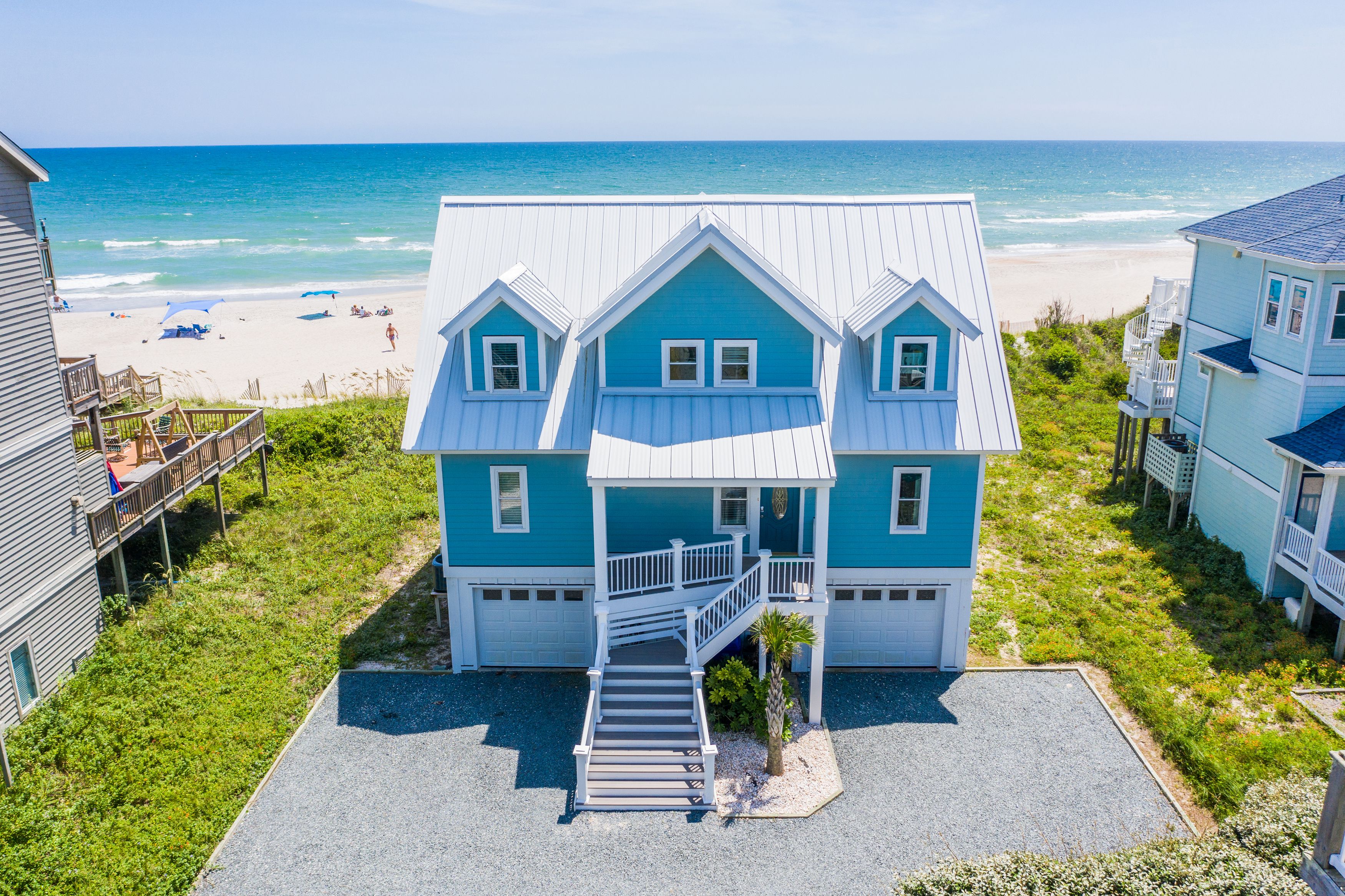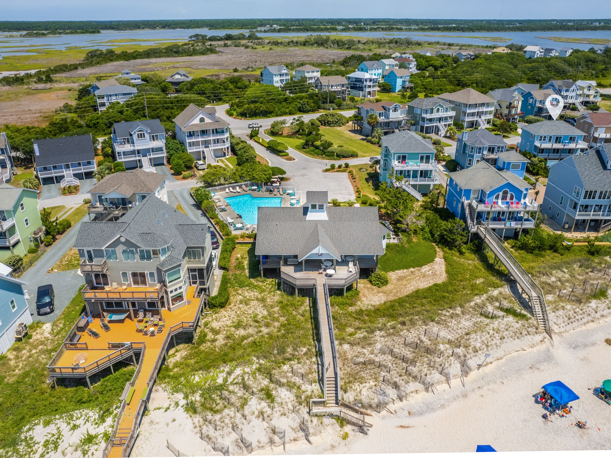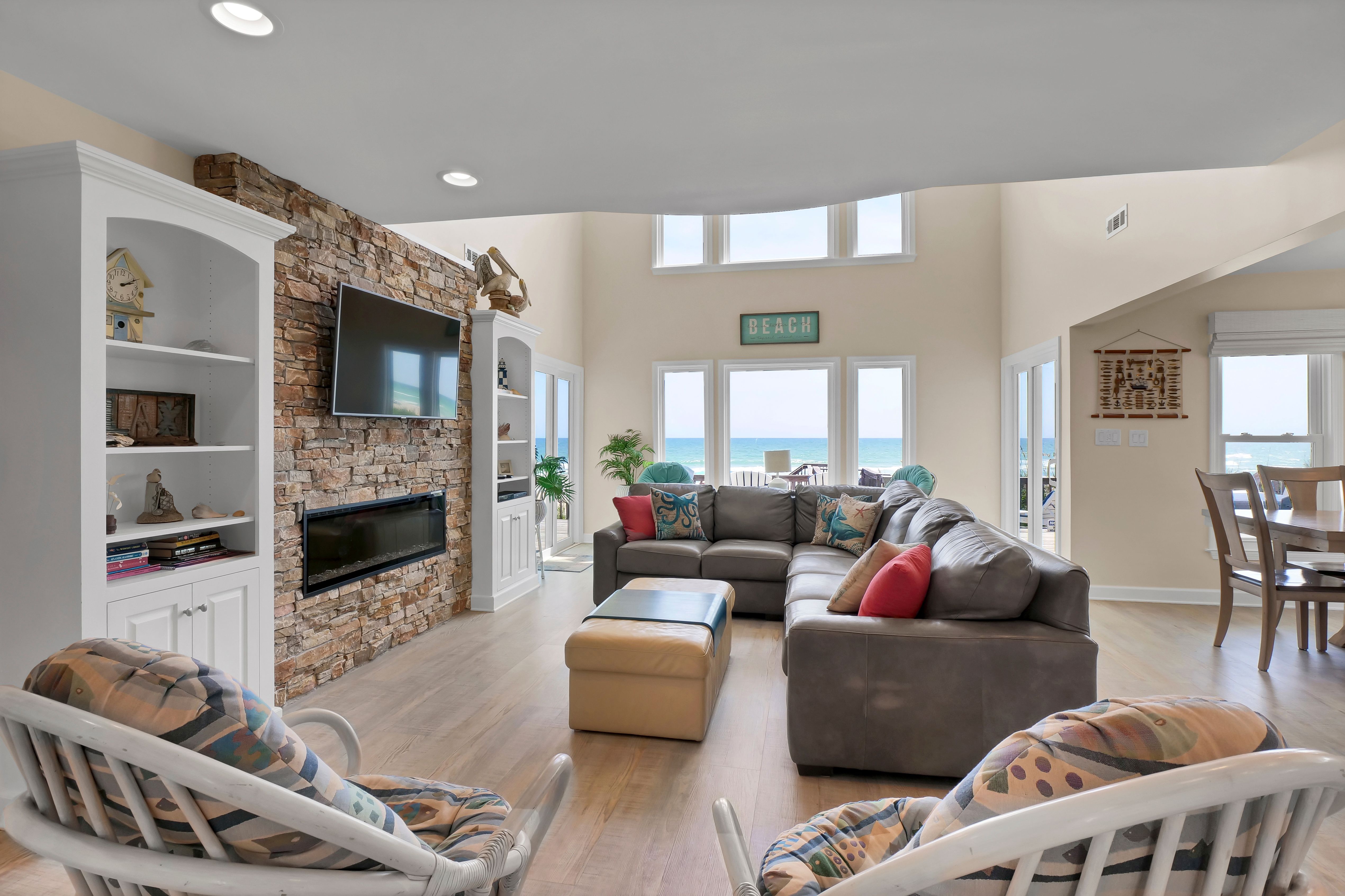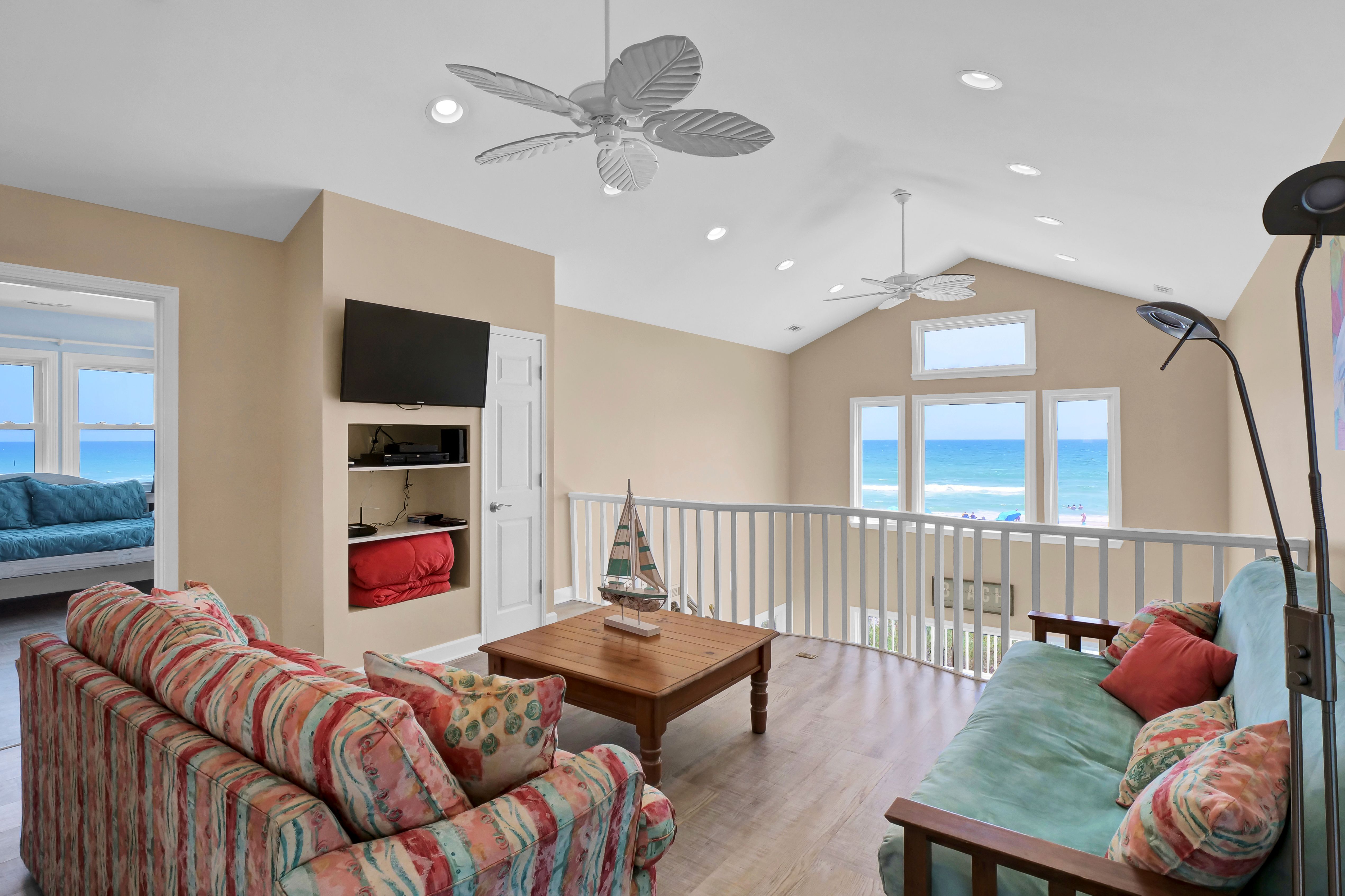 Ocean view deck seating and walkway to beach