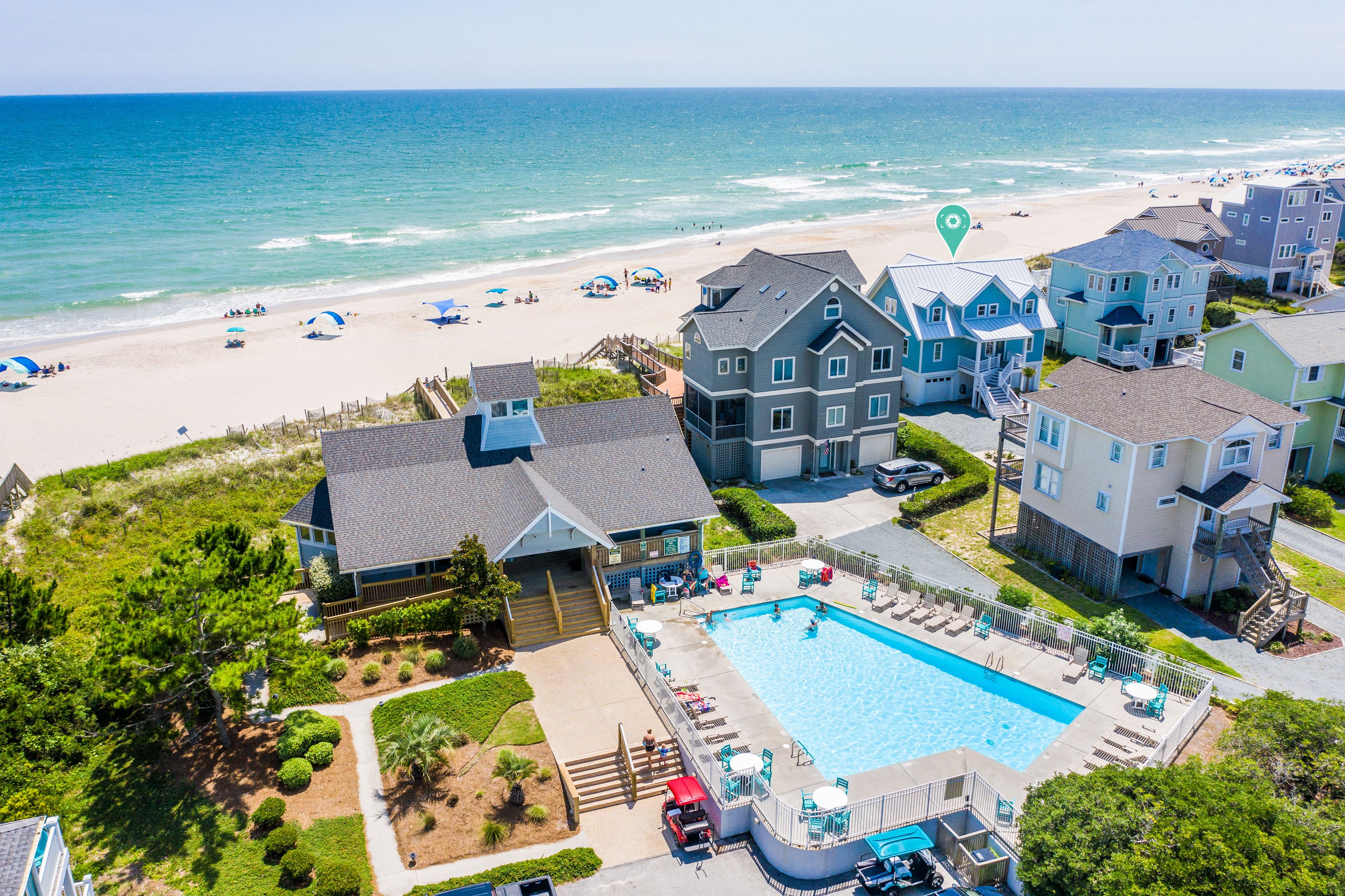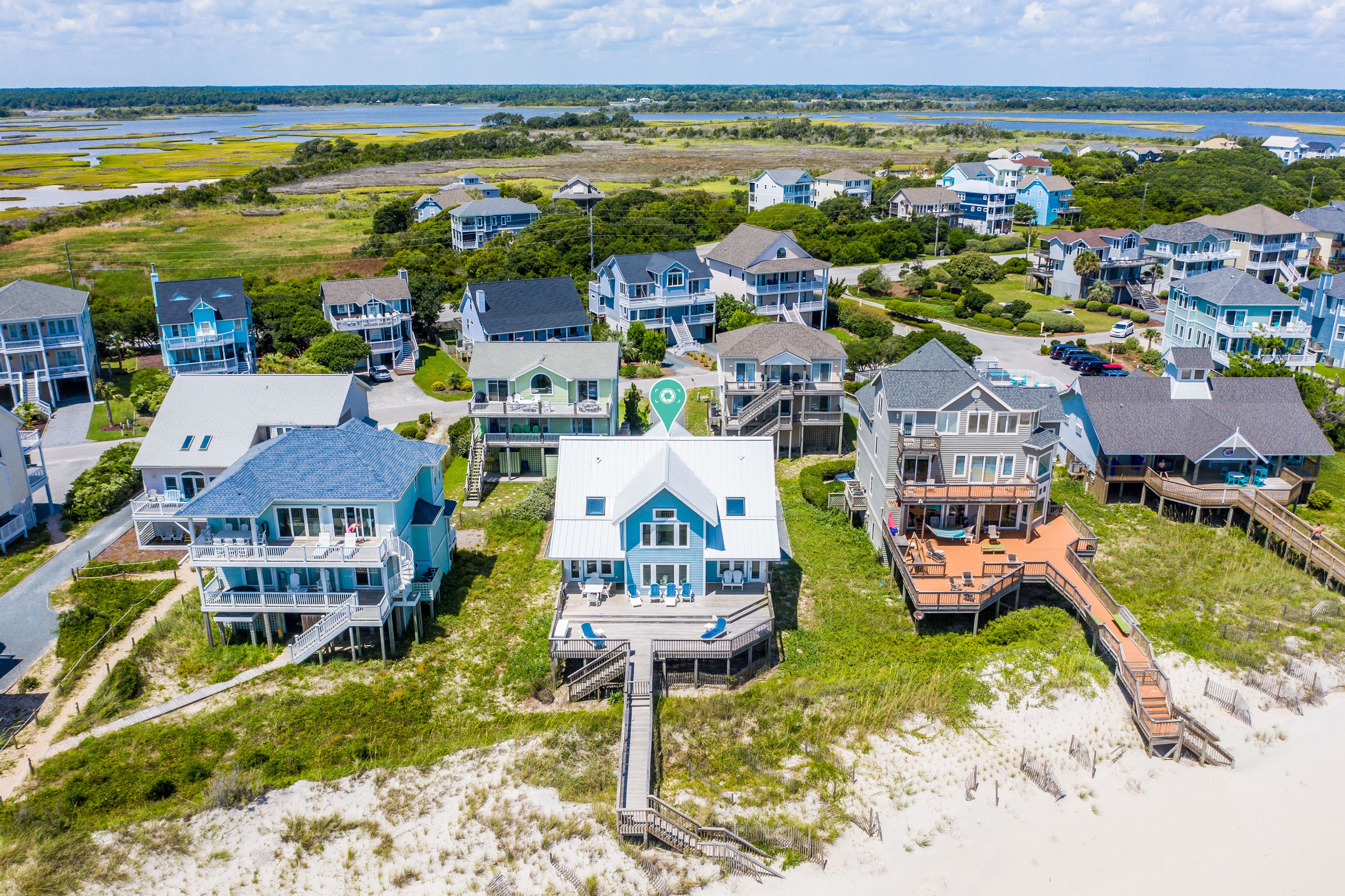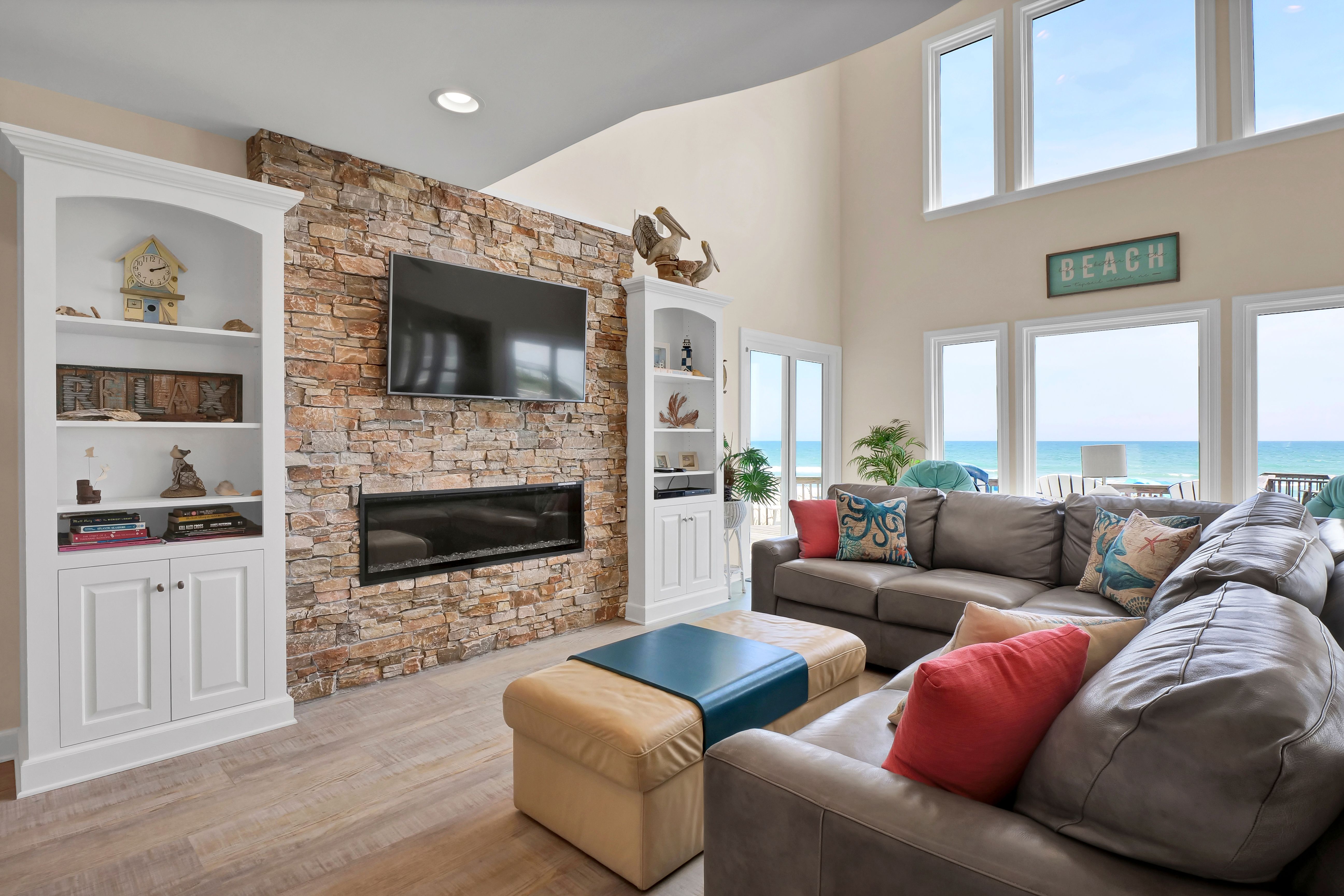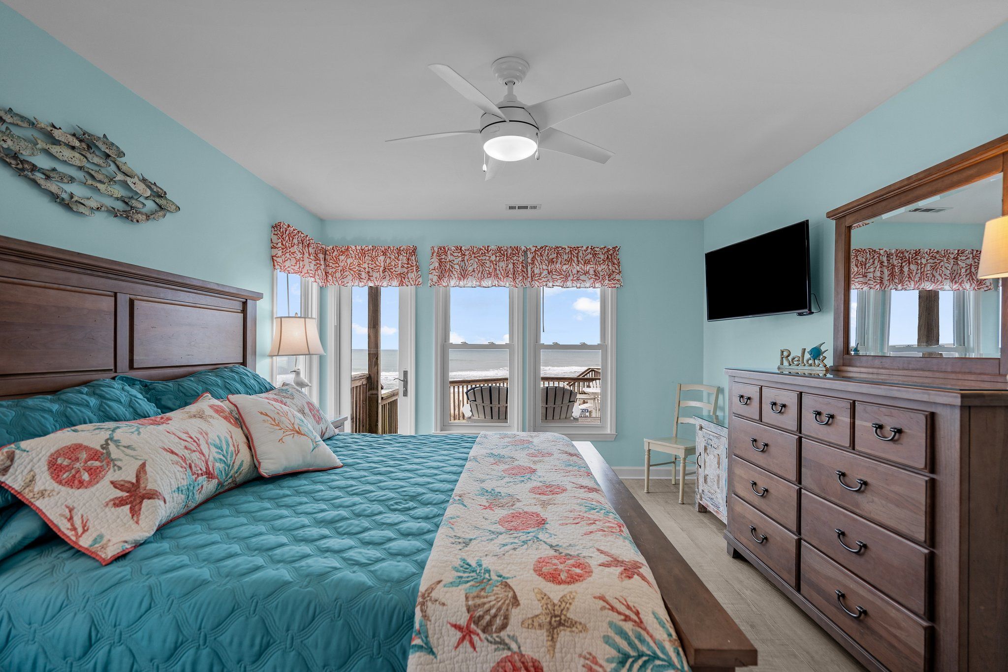 Ocean view deck seating and walkway to beach