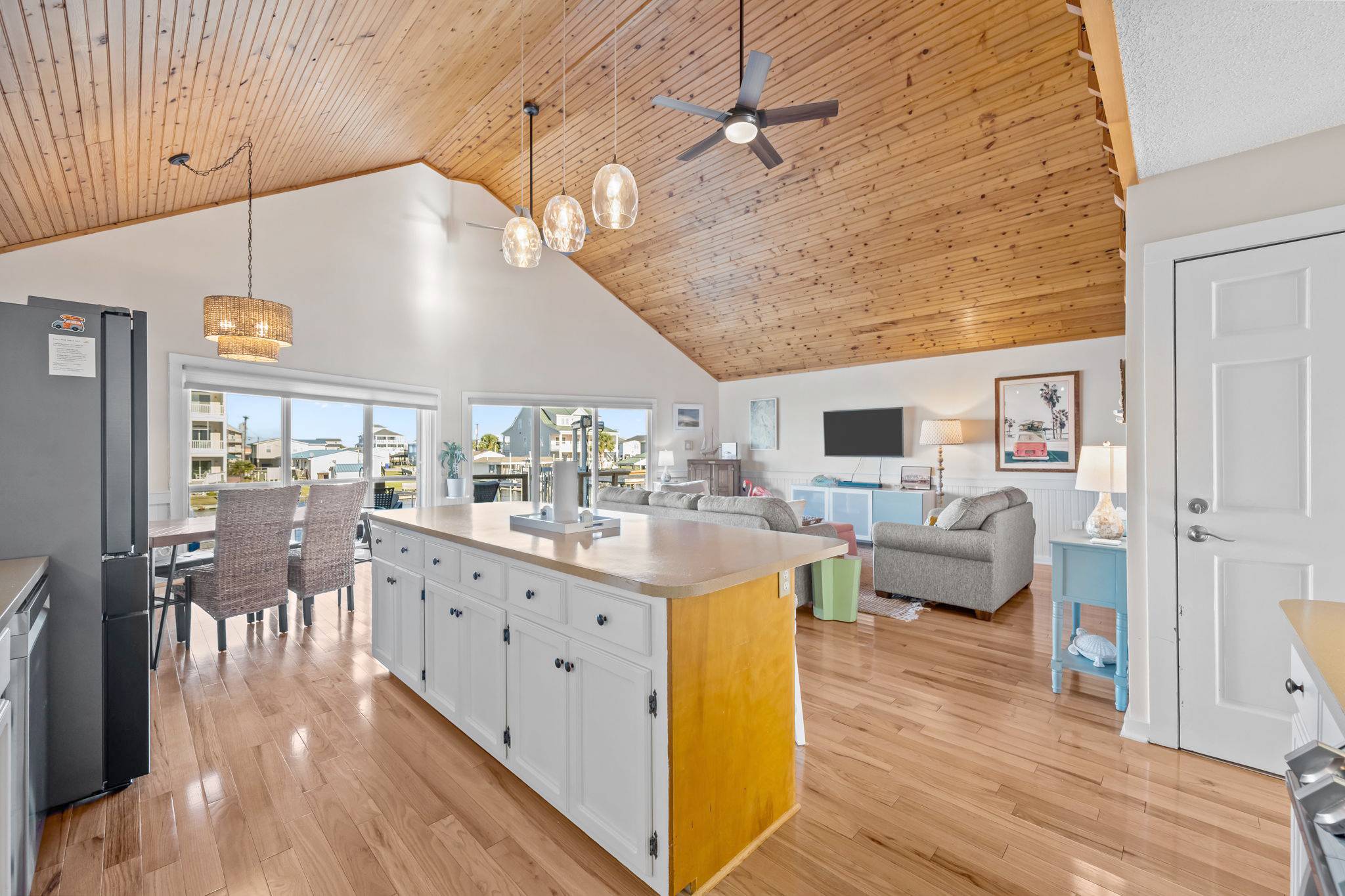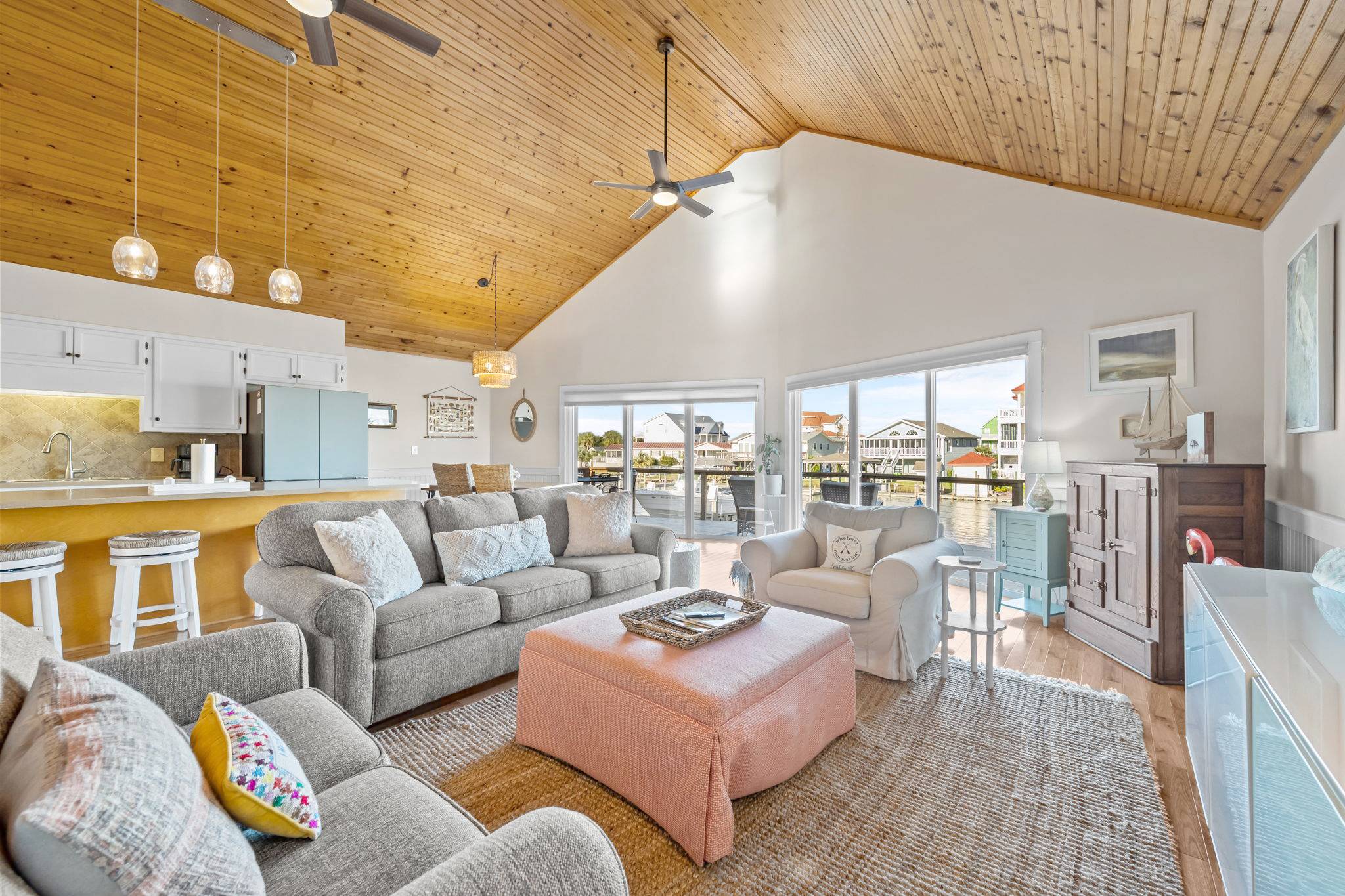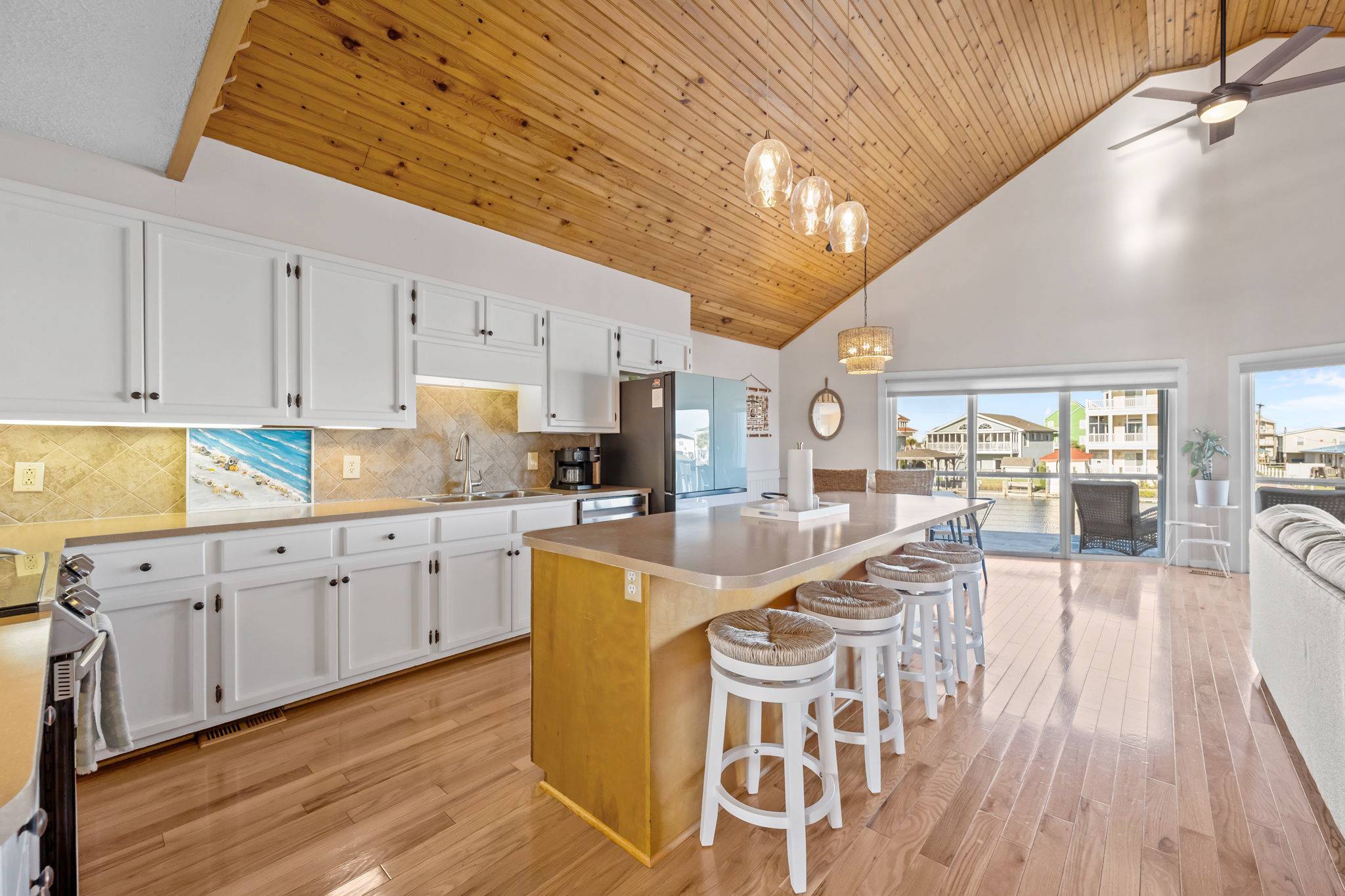 Step inside to discover a bright, airy interior with tall wood ceilings, beautiful natural hardwood floors, and an abundance of natural light. The open-concept living, dining, and kitchen area features a wall of windows leading to a spacious deck, where you can take in spectacular sunsets over the water or gather for a sunset happy hour. The fully stocked kitchen has everything you need to prepare home-cooked meals or entertain your group, complete with full-sized appliances, cookware, and multiple dining spaces.