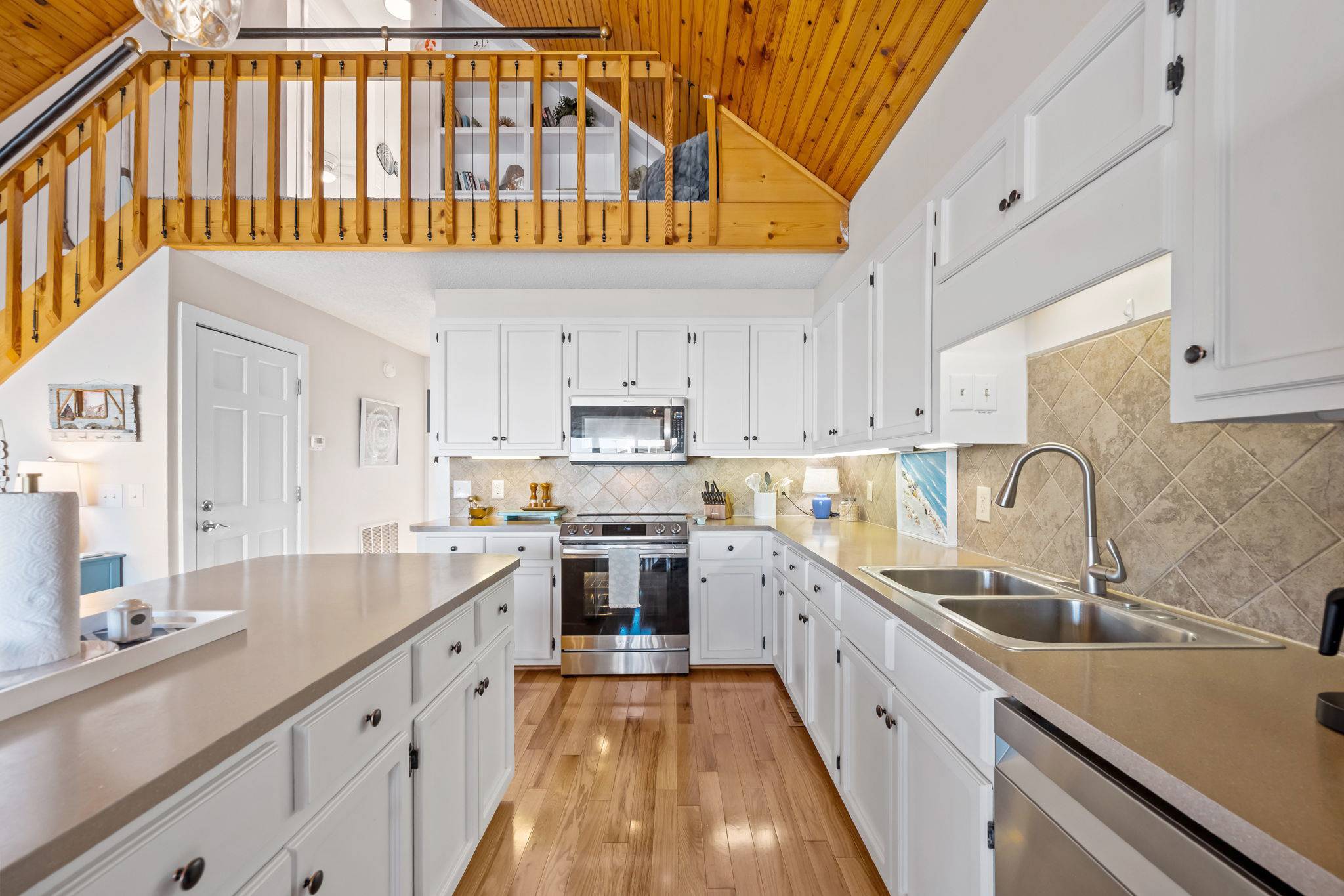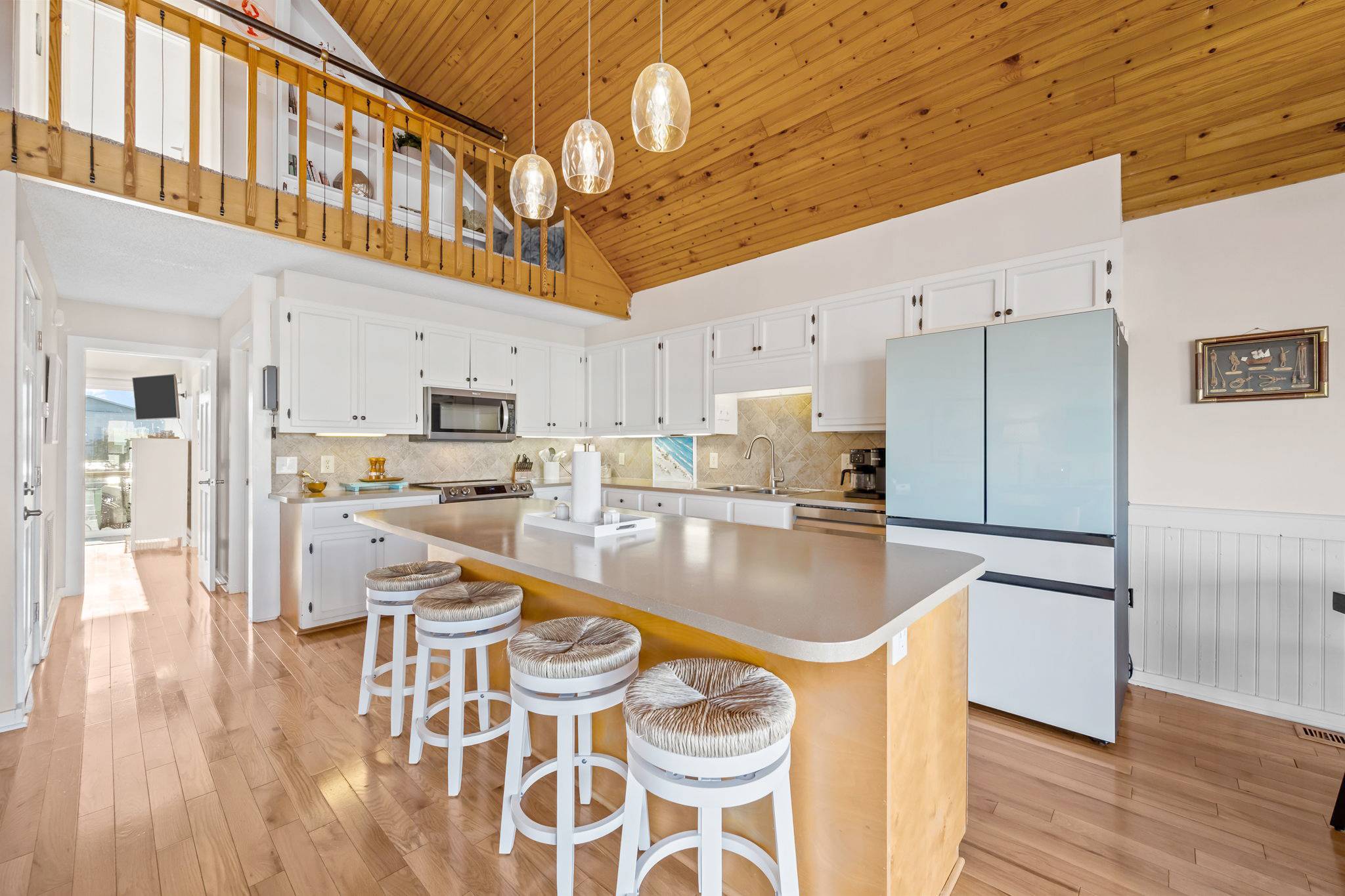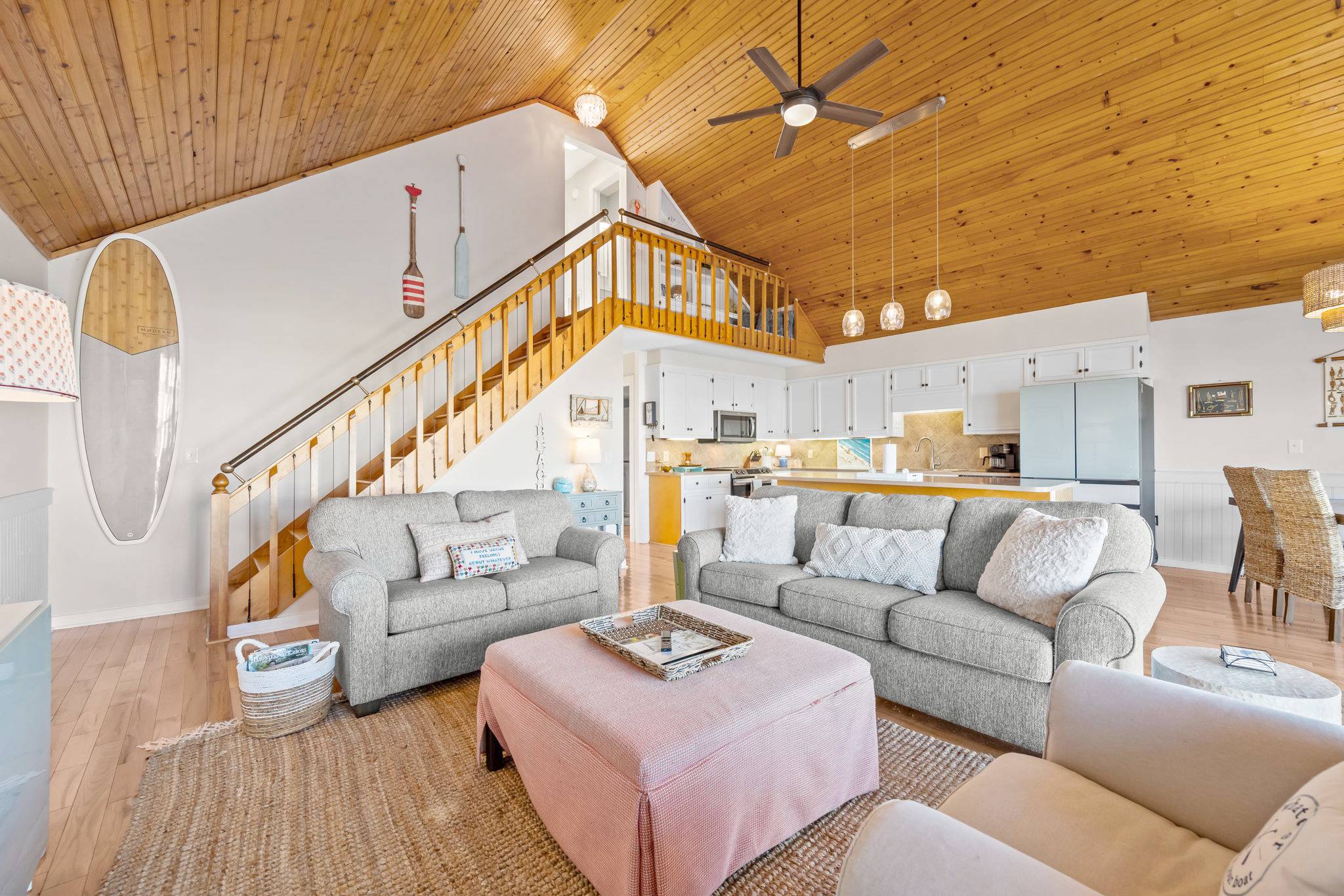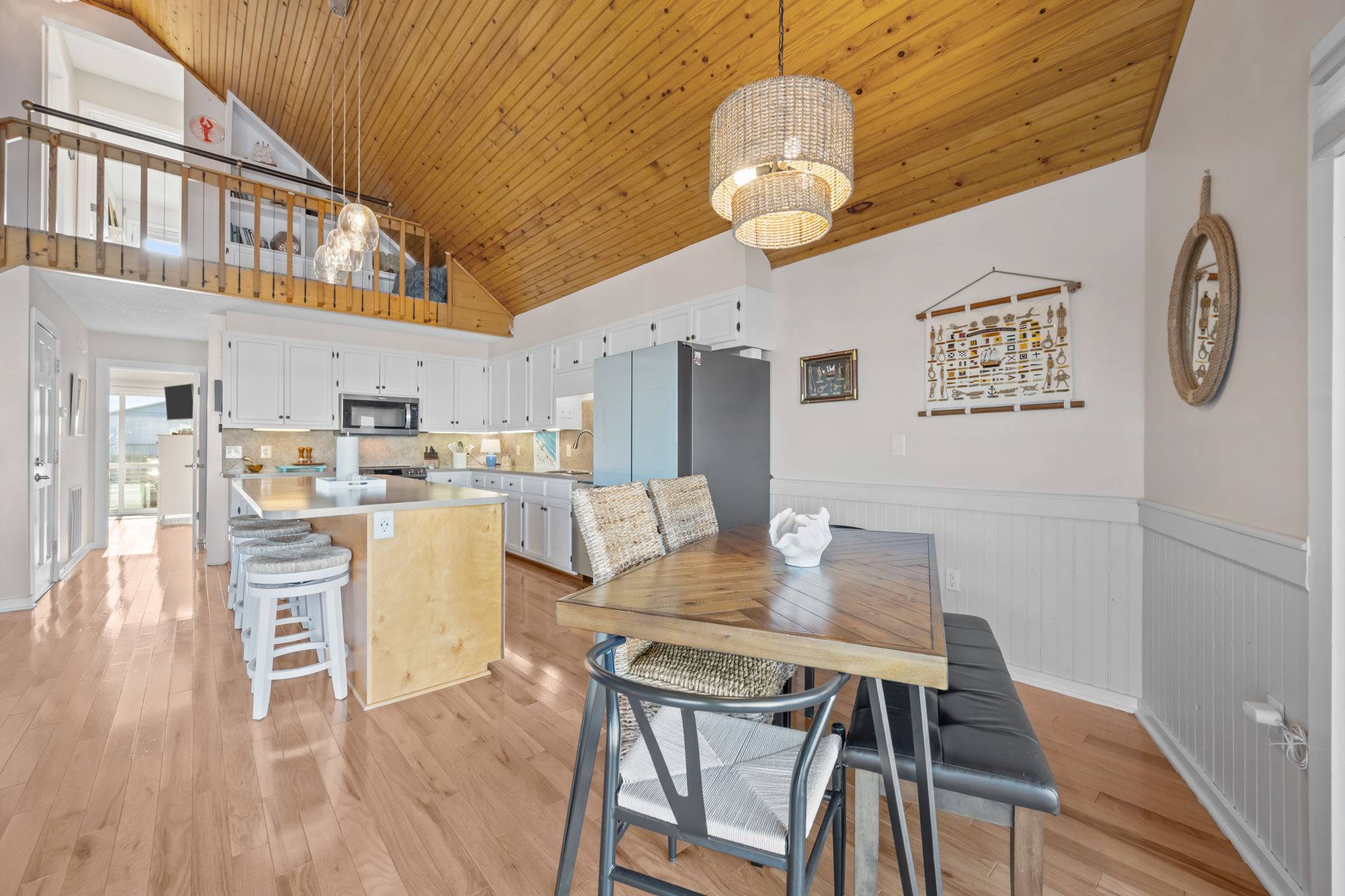 Step inside to discover a bright, airy interior with tall wood ceilings, beautiful natural hardwood floors, and an abundance of natural light. The open-concept living, dining, and kitchen area features a wall of windows leading to a spacious deck, where you can take in spectacular sunsets over the water or gather for a sunset happy hour. The fully stocked kitchen has everything you need to prepare home-cooked meals or entertain your group, complete with full-sized appliances, cookware, and multiple dining spaces.